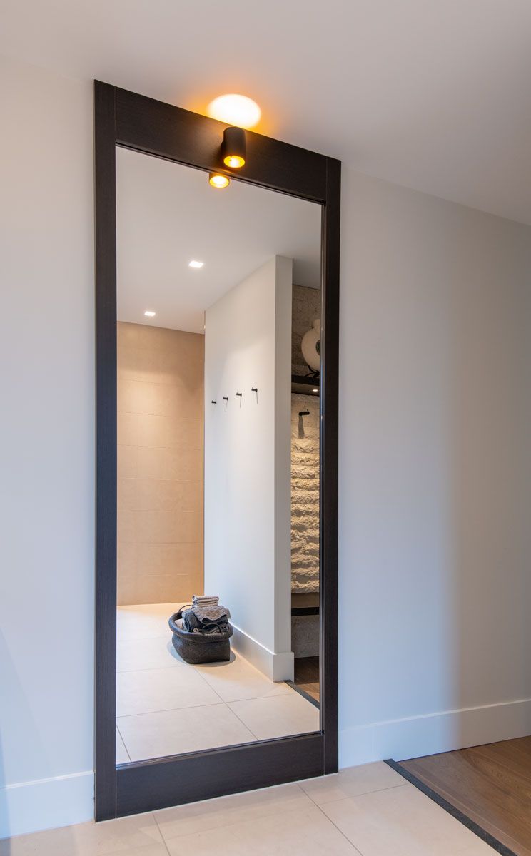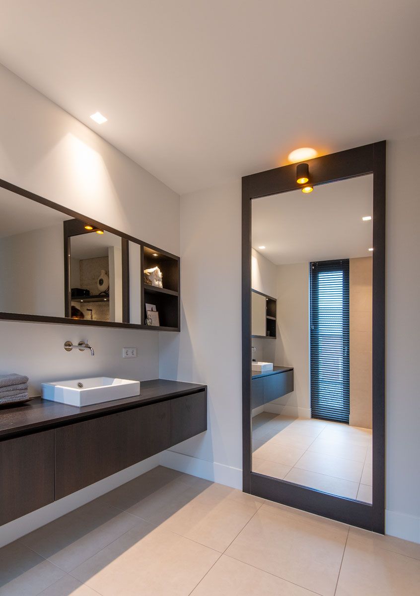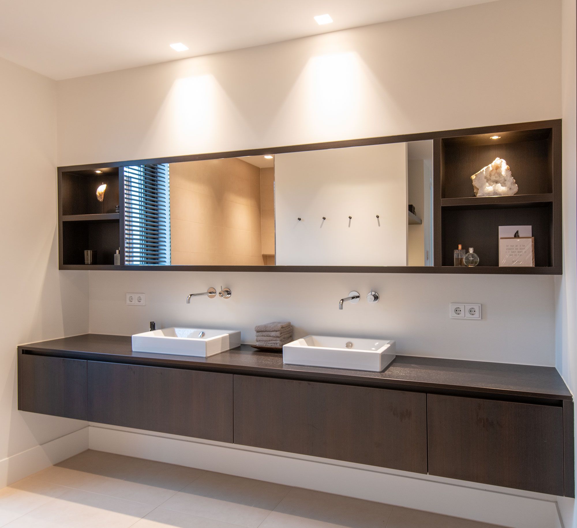 Dit strakke badmeubel is gemaakt van eiken meubelpanelen. Voorzien van genoeg opbergruimte, waskommen en bovenkastjes. In de hele badkamer zijn er led-inbouwspotjes geplaatst zodat de badkamer voldoende wordt verlicht en een luxe uitstraling heeft. Deze inbouwspots kunnen tegen vochtige ruimtes en ideaal voor de badkamer. Zoals u kunt zien is deze badkamer van alle gemakken voorzien.