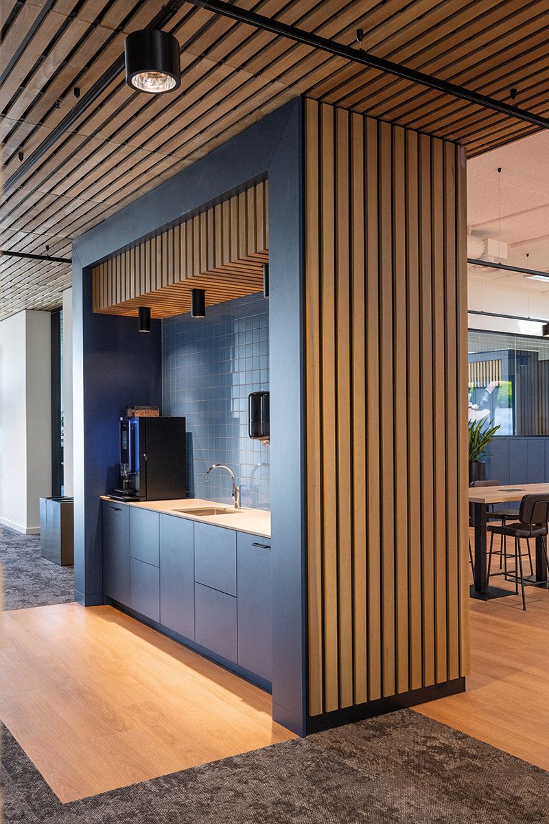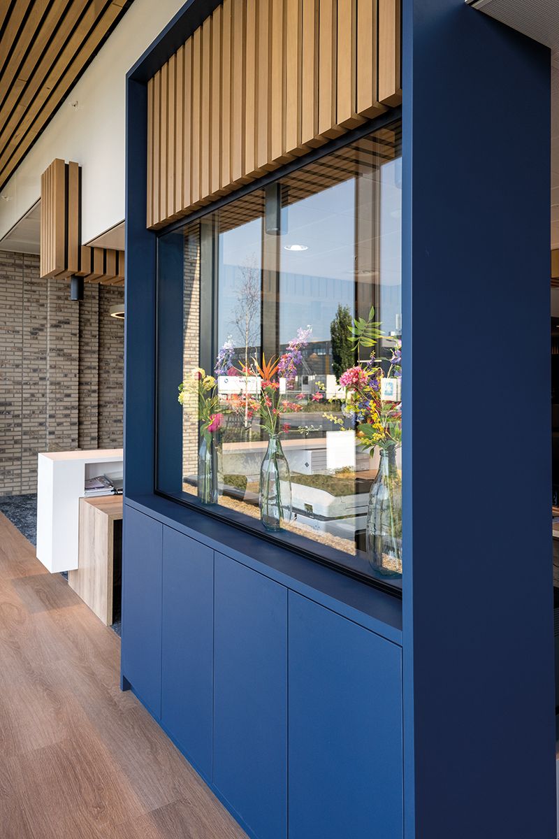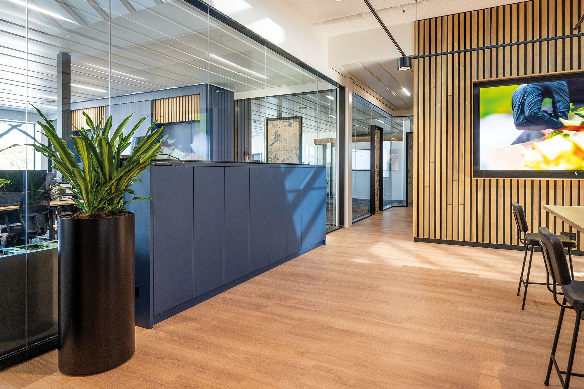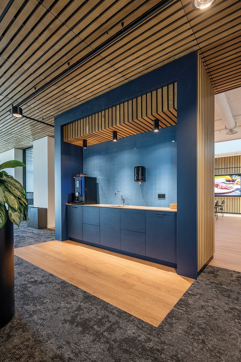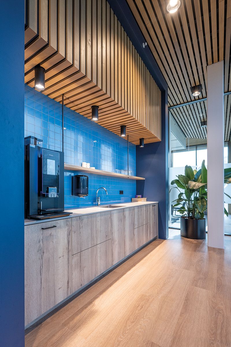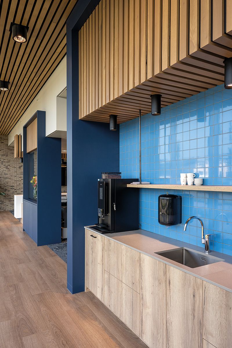 Het bedrijfsinterieur is uitgevoerd in blauwe kleuren met houten latten. De combinatie van deze materialen zorgt voor een gezellige en warme uitstraling. De blauwe kleuren zijn rustgevend en stimuleren de productiviteit. Daarnaast geven de houten latten een natuurlijke touch aan het interieur. Het meubilair sluit perfect aan op deze sfeer en is comfortabel en functioneel. Het bedrijfsinterieur is een inspirerende omgeving voor medewerkers en klanten.