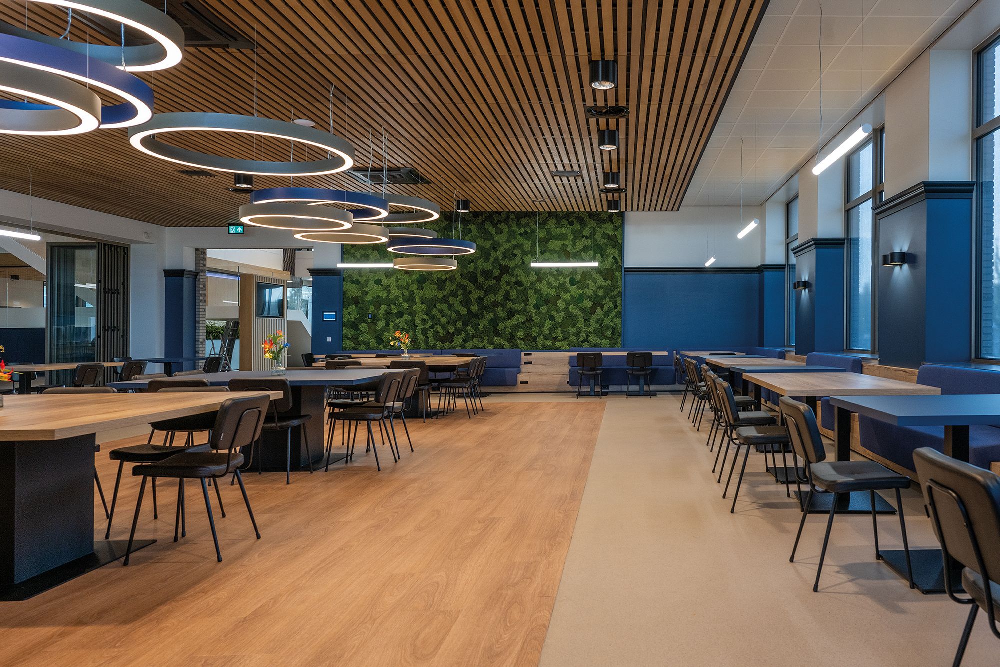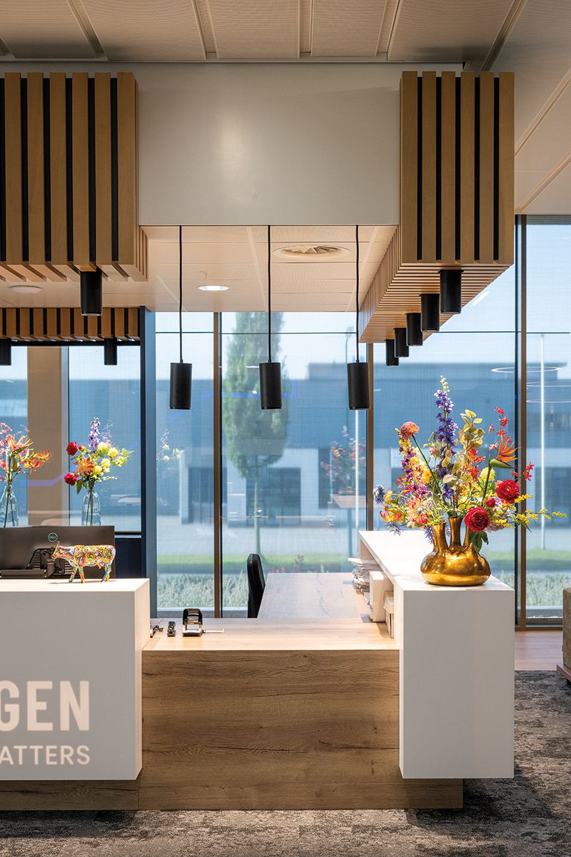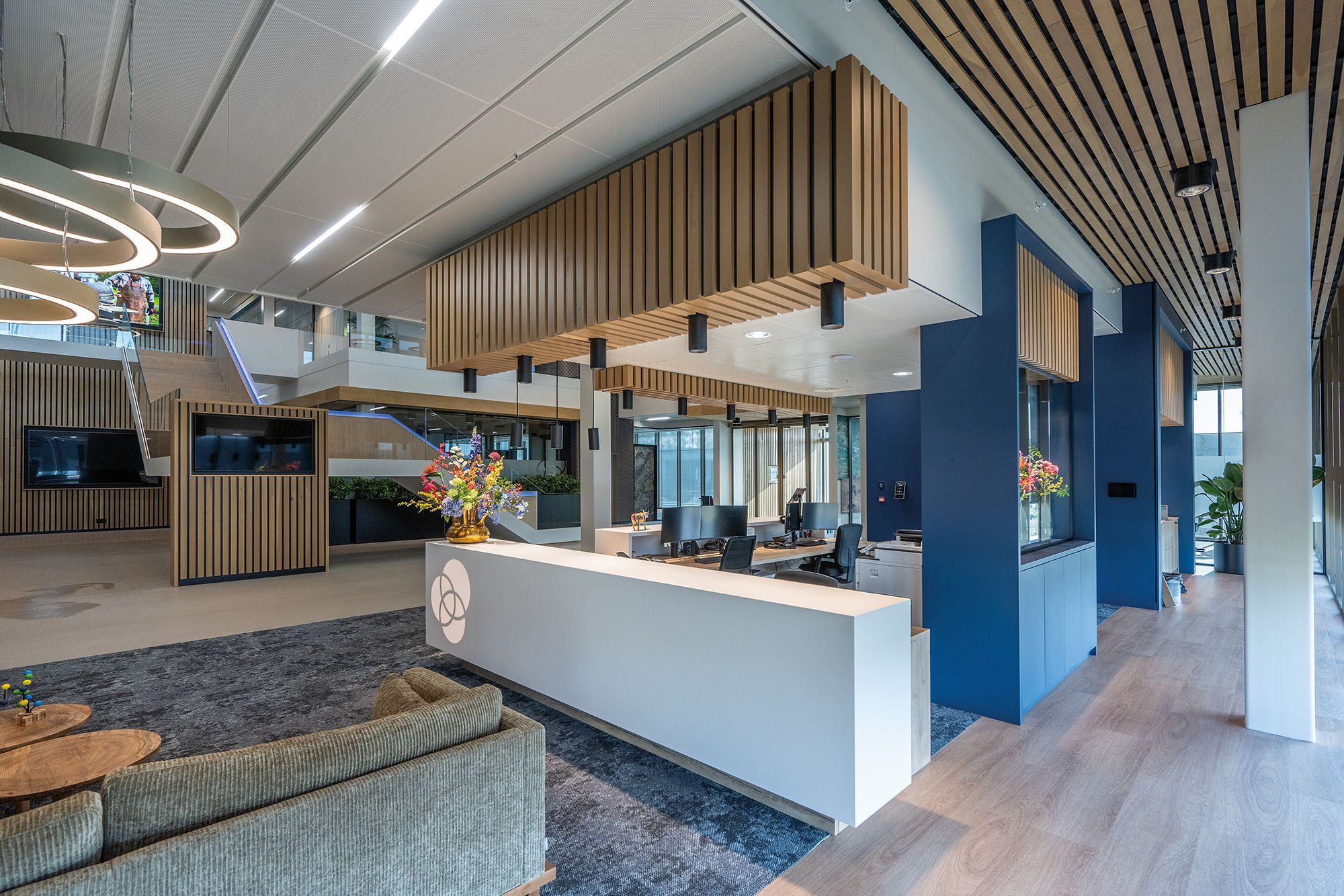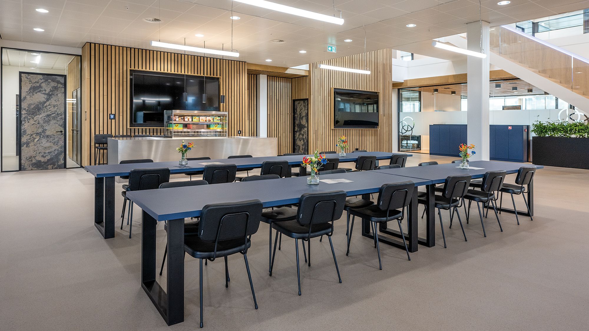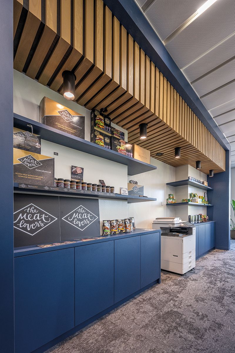 Het bedrijfsinterieur is uitgevoerd in blauwe kleuren met houten latten. De combinatie van deze materialen zorgt voor een gezellige en warme uitstraling. De blauwe kleuren zijn rustgevend en stimuleren de productiviteit. Daarnaast geven de houten latten een natuurlijke touch aan het interieur. Het meubilair sluit perfect aan op deze sfeer en is comfortabel en functioneel. Het bedrijfsinterieur is een inspirerende omgeving voor medewerkers en klanten.