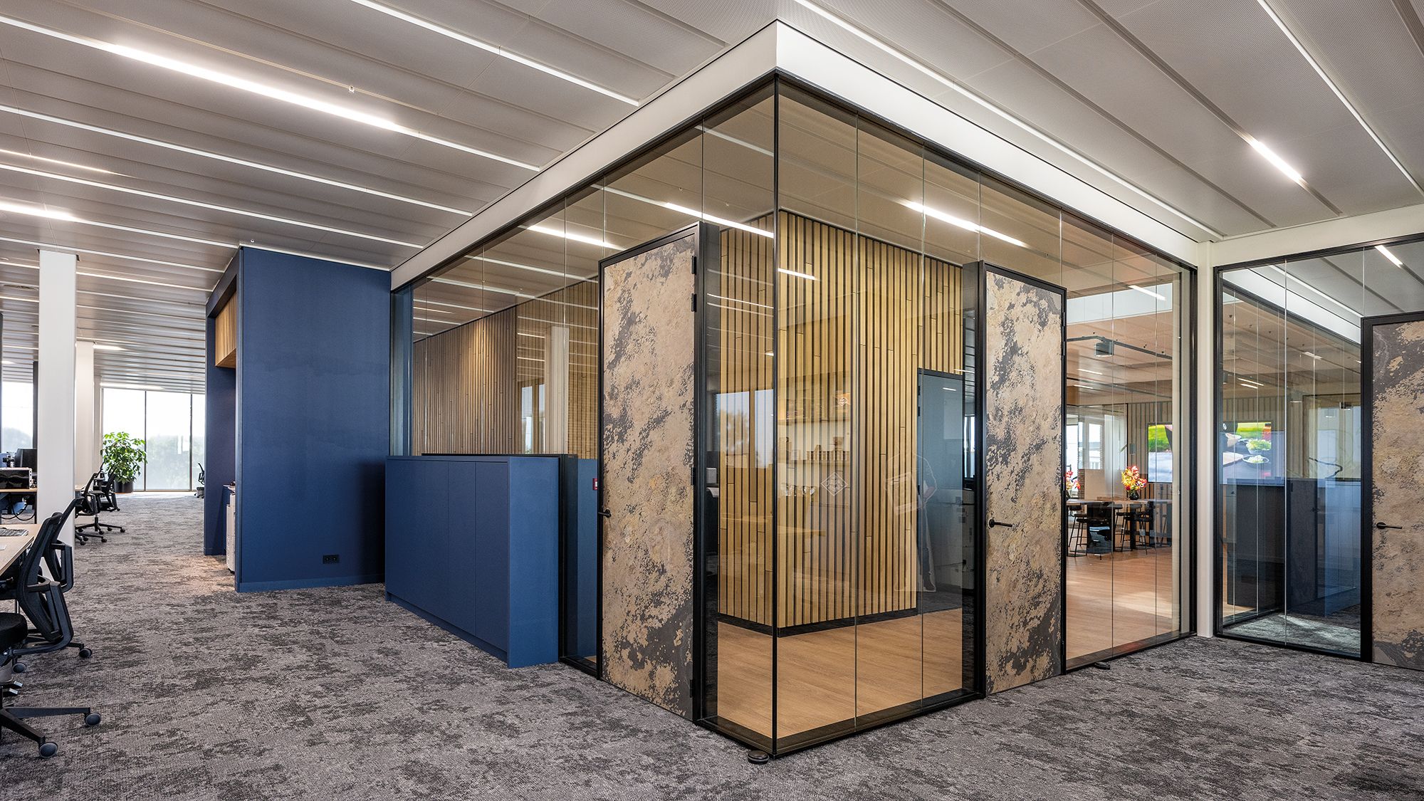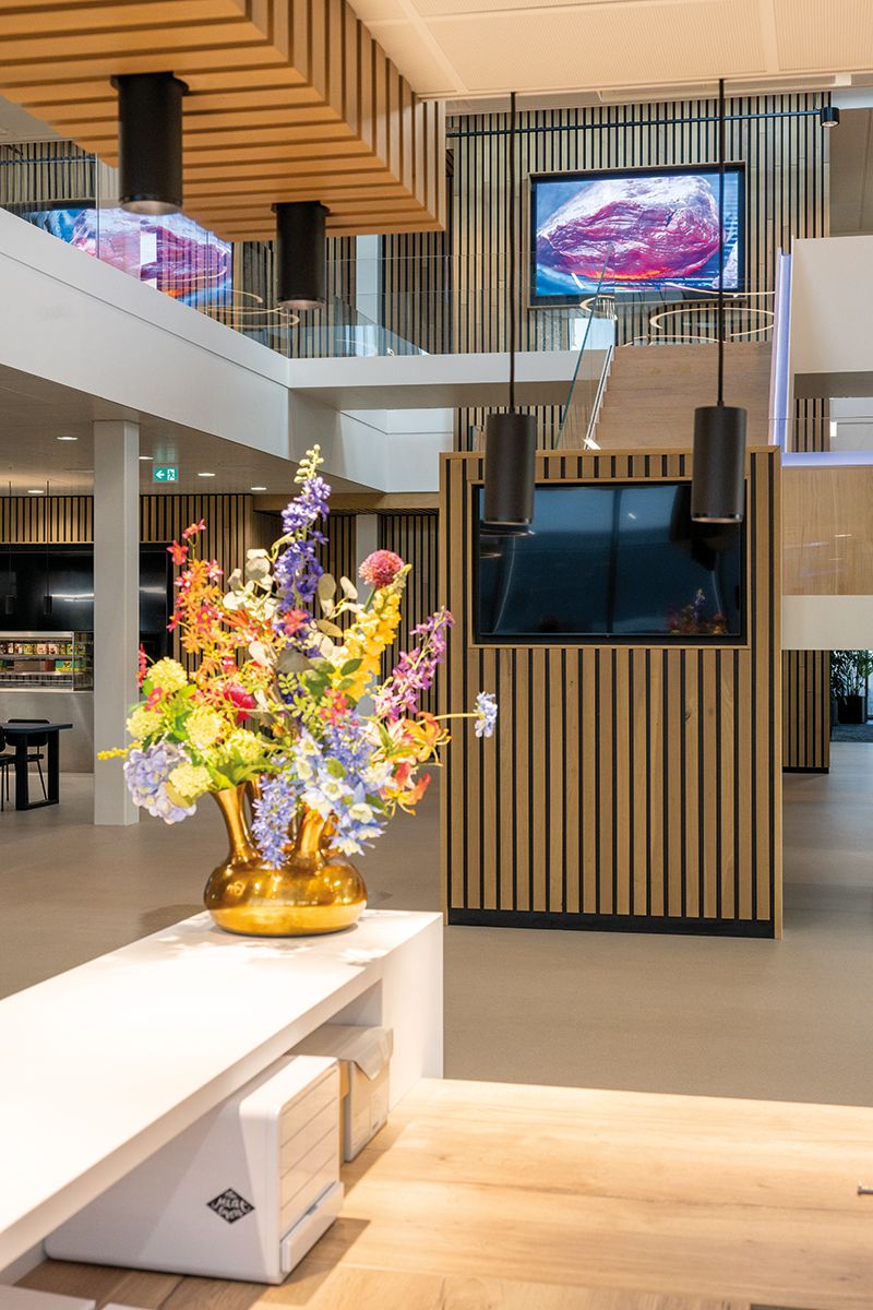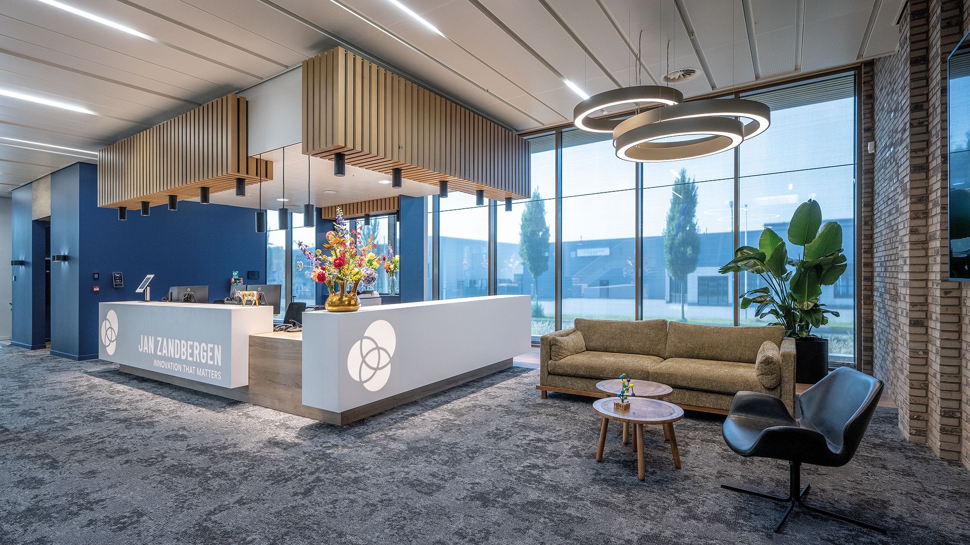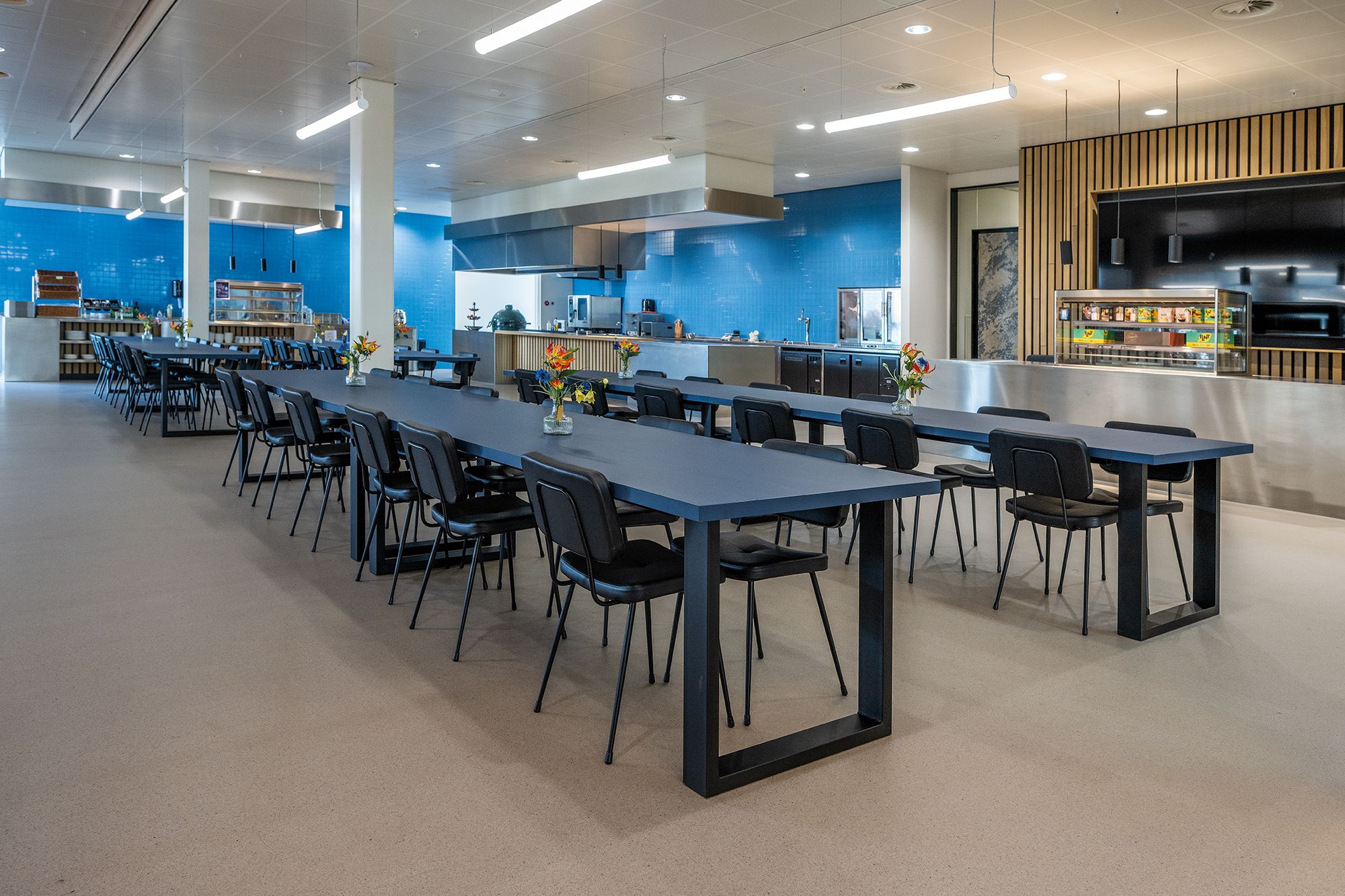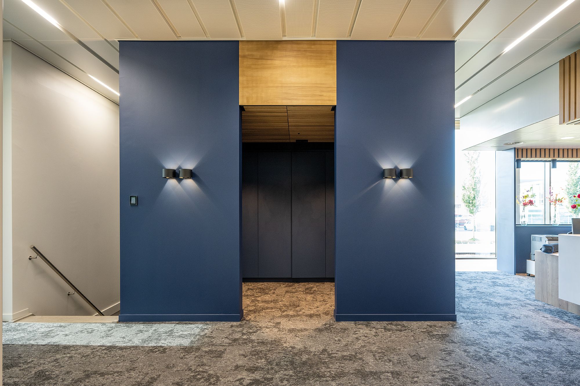 Het bedrijfsinterieur is uitgevoerd in blauwe kleuren met houten latten. De combinatie van deze materialen zorgt voor een gezellige en warme uitstraling. De blauwe kleuren zijn rustgevend en stimuleren de productiviteit. Daarnaast geven de houten latten een natuurlijke touch aan het interieur. Het meubilair sluit perfect aan op deze sfeer en is comfortabel en functioneel. Het bedrijfsinterieur is een inspirerende omgeving voor medewerkers en klanten.