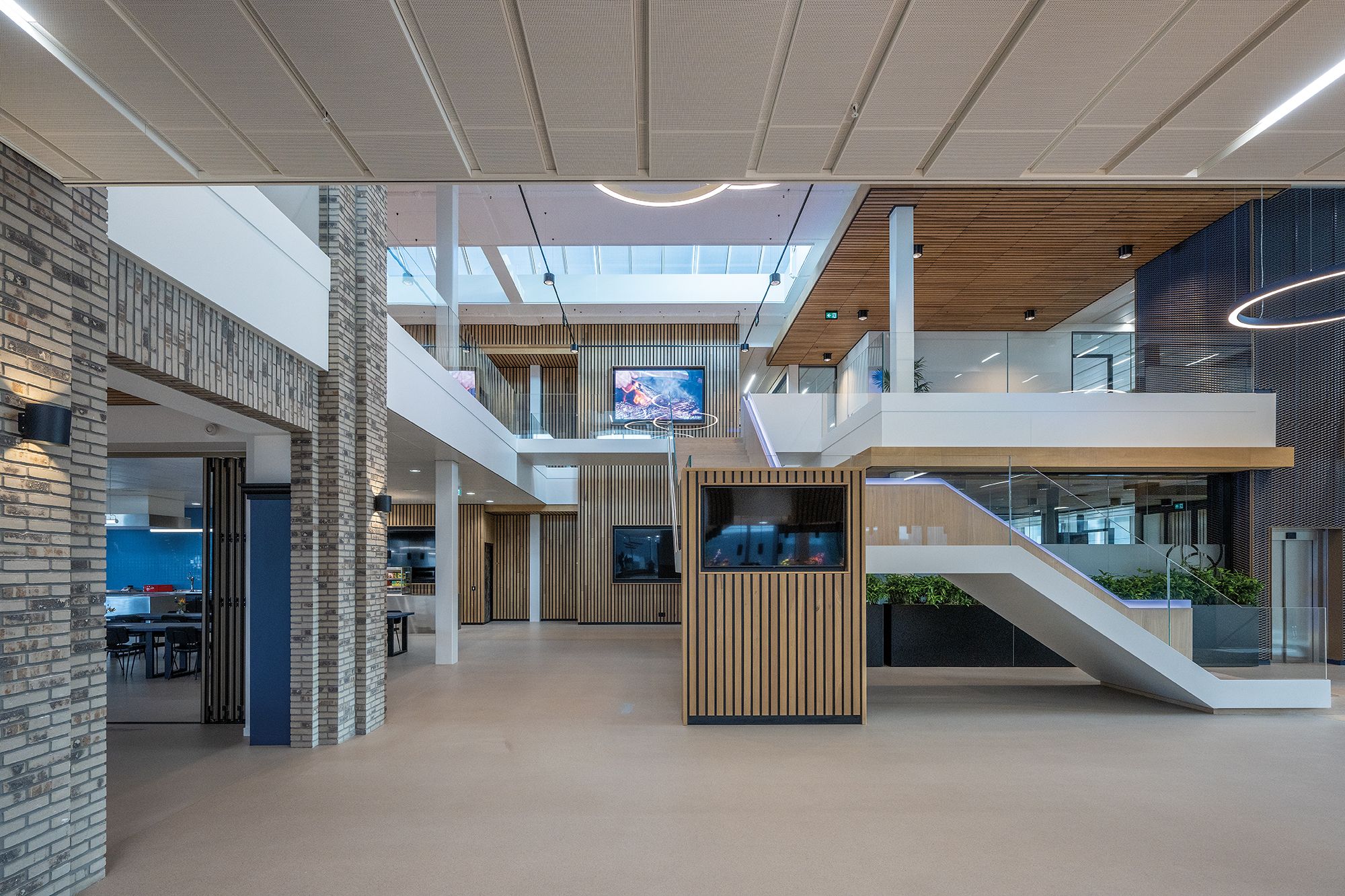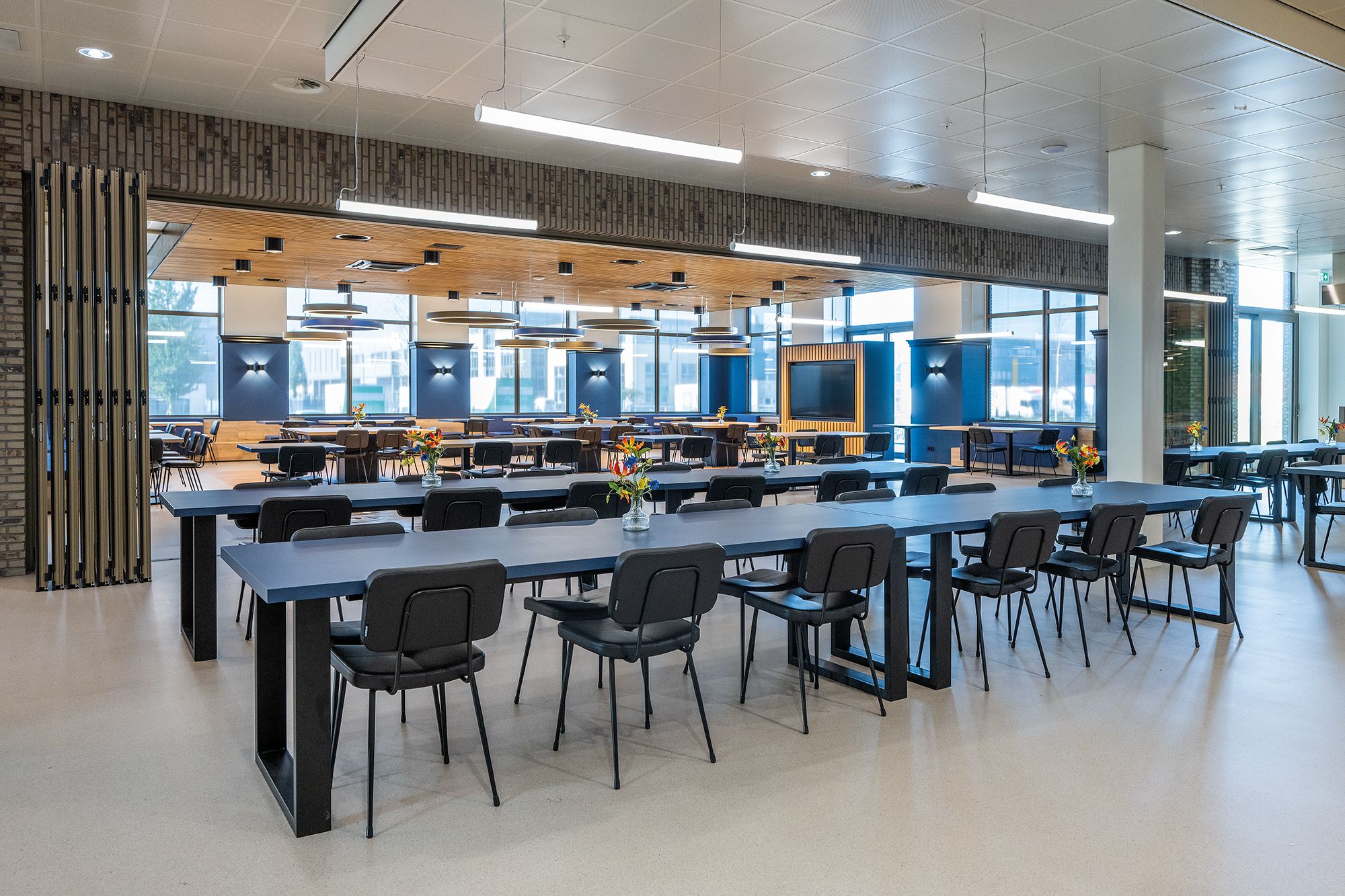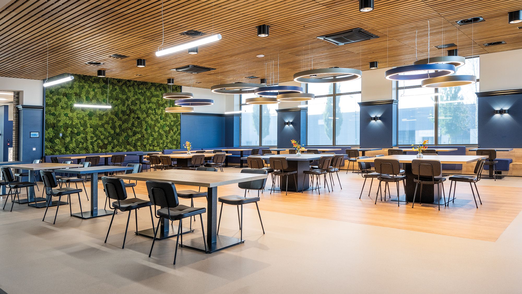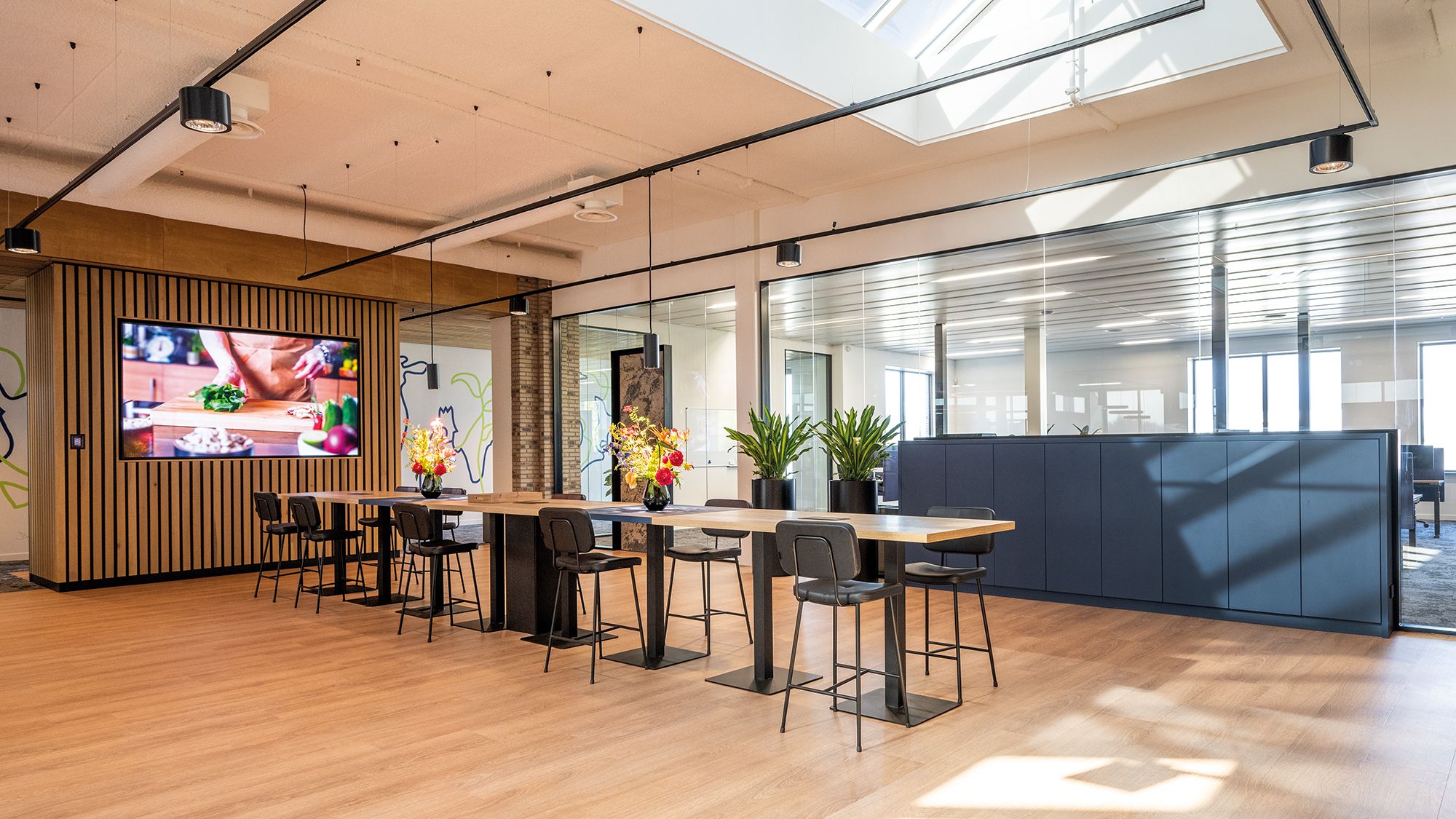 Het bedrijfsinterieur is uitgevoerd in blauwe kleuren met houten latten. De combinatie van deze materialen zorgt voor een gezellige en warme uitstraling. De blauwe kleuren zijn rustgevend en stimuleren de productiviteit. Daarnaast geven de houten latten een natuurlijke touch aan het interieur. Het meubilair sluit perfect aan op deze sfeer en is comfortabel en functioneel. Het bedrijfsinterieur is een inspirerende omgeving voor medewerkers en klanten.