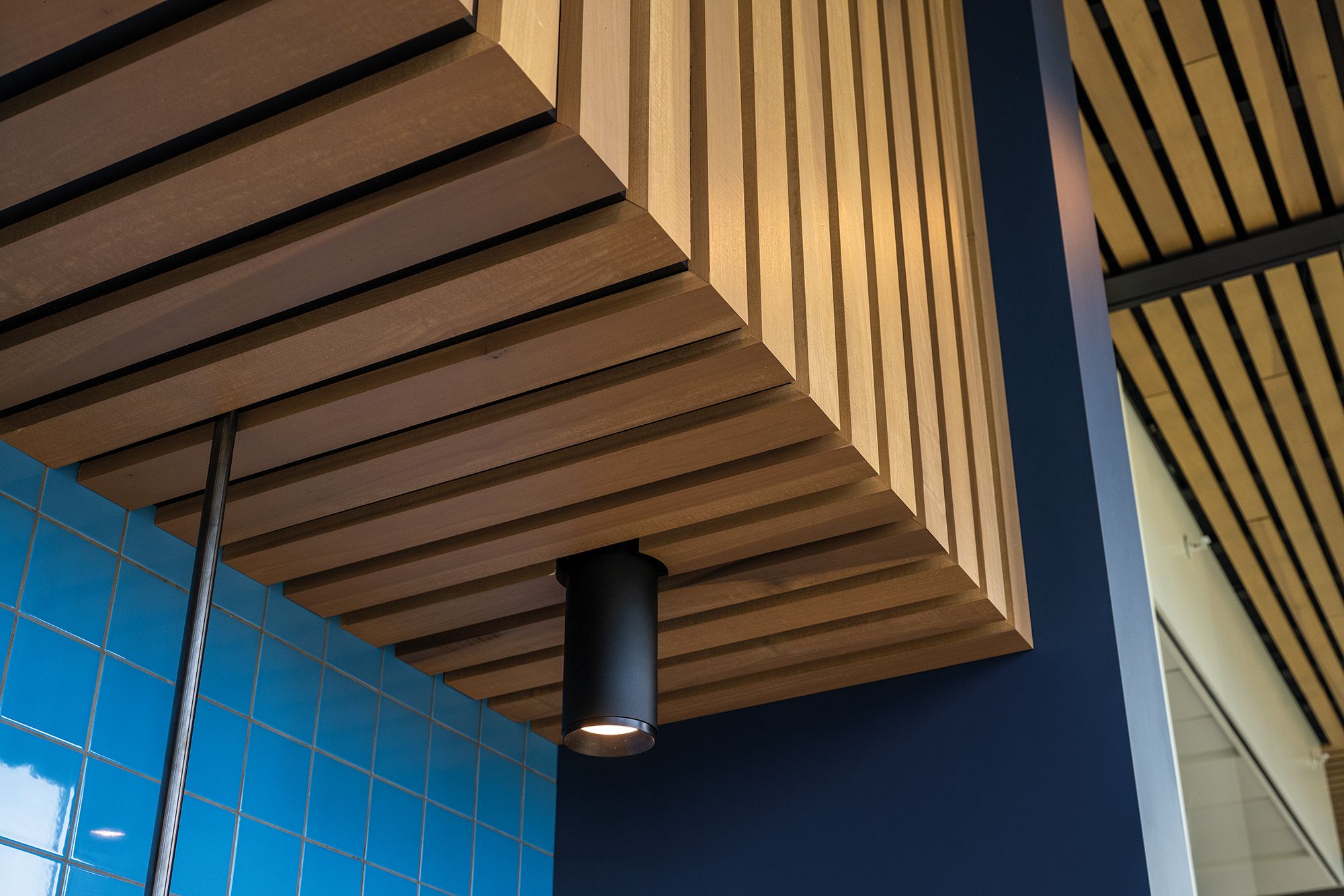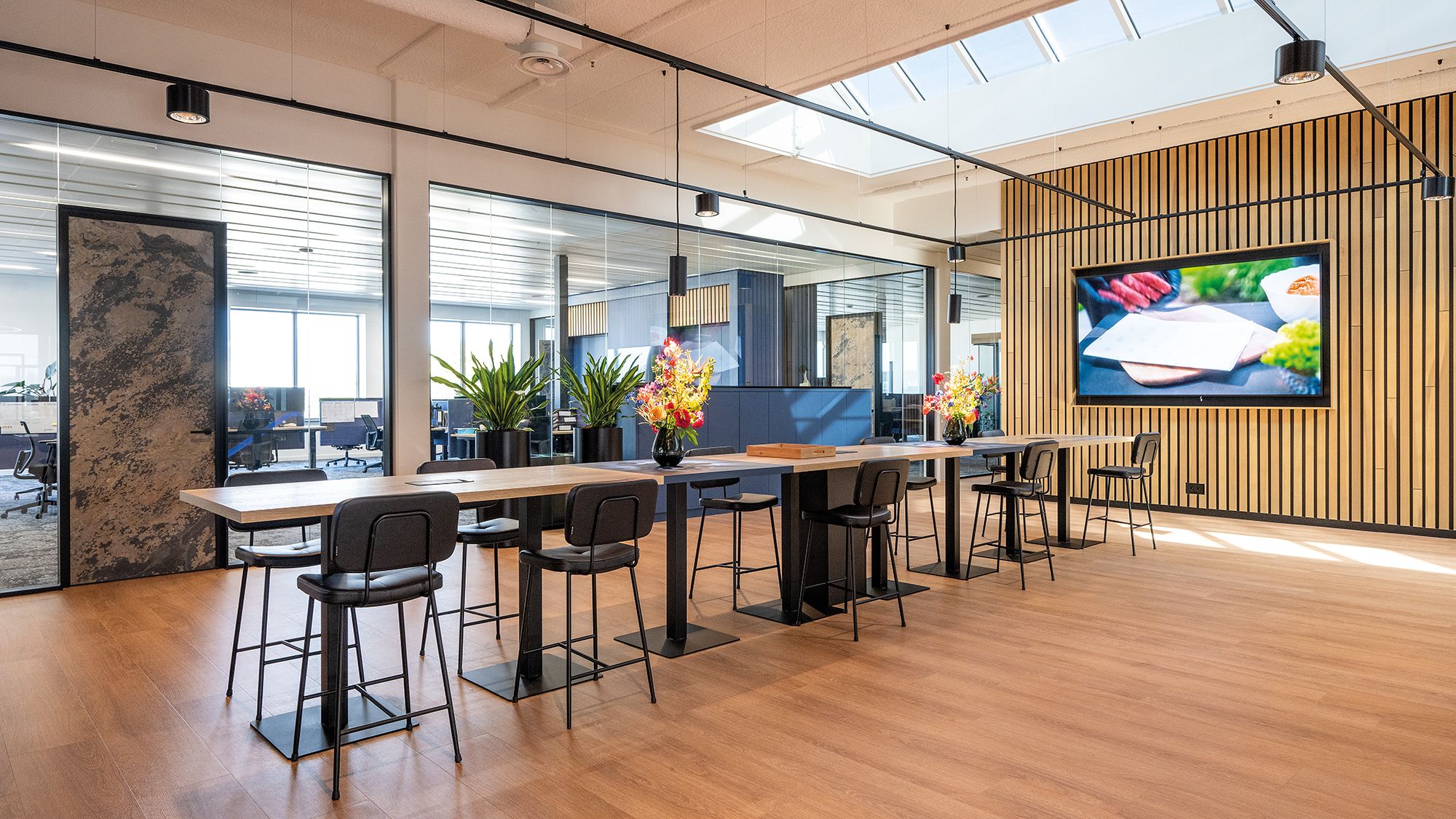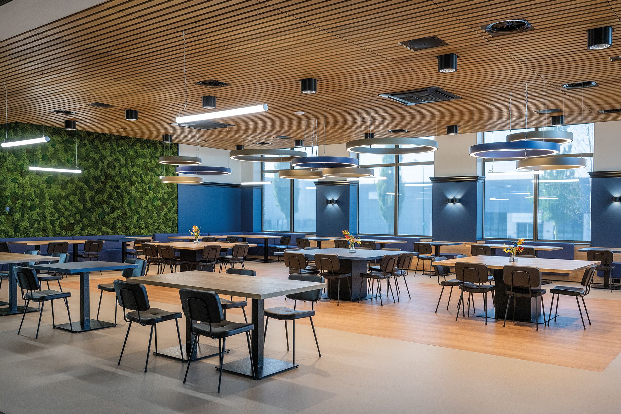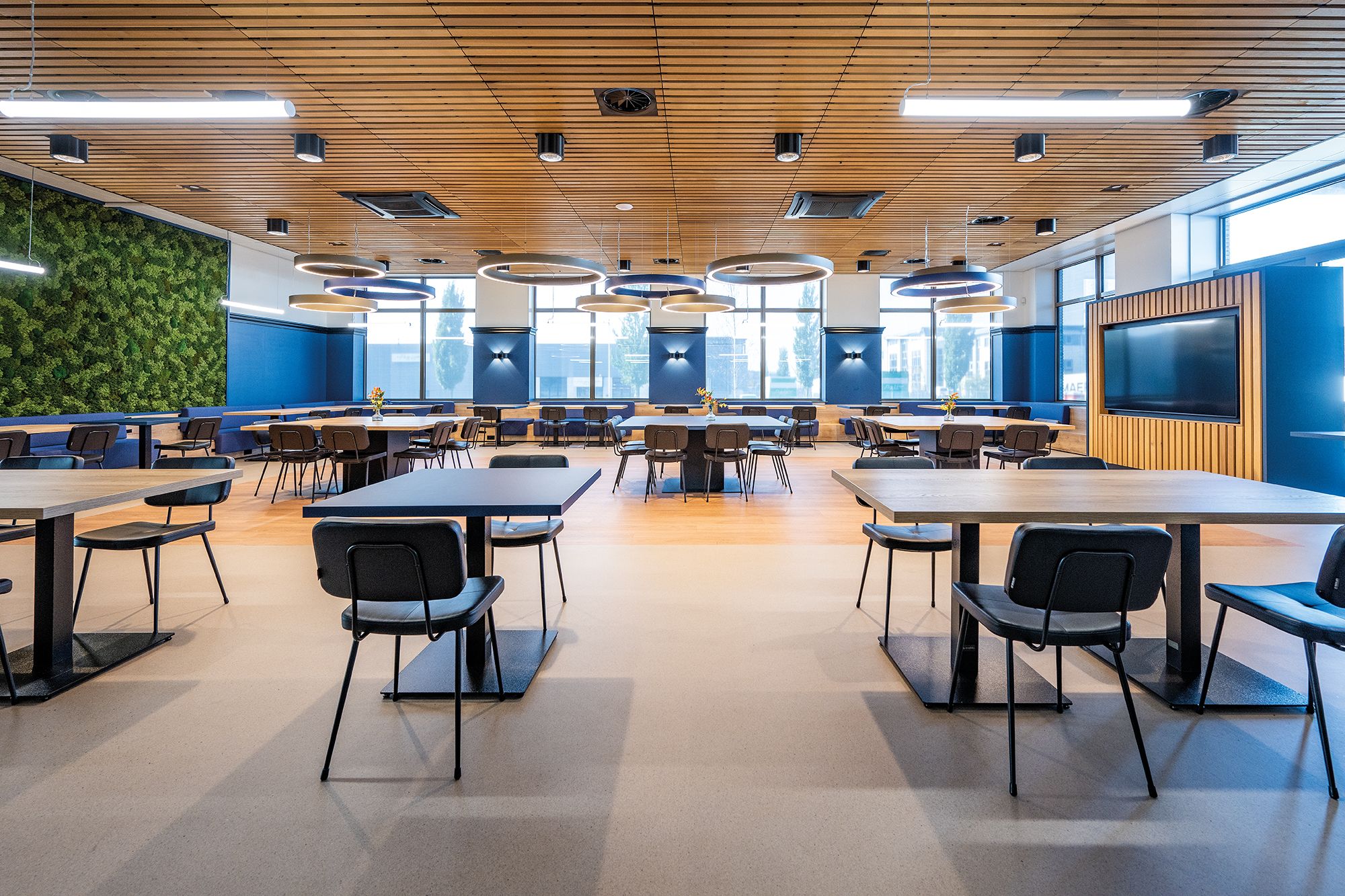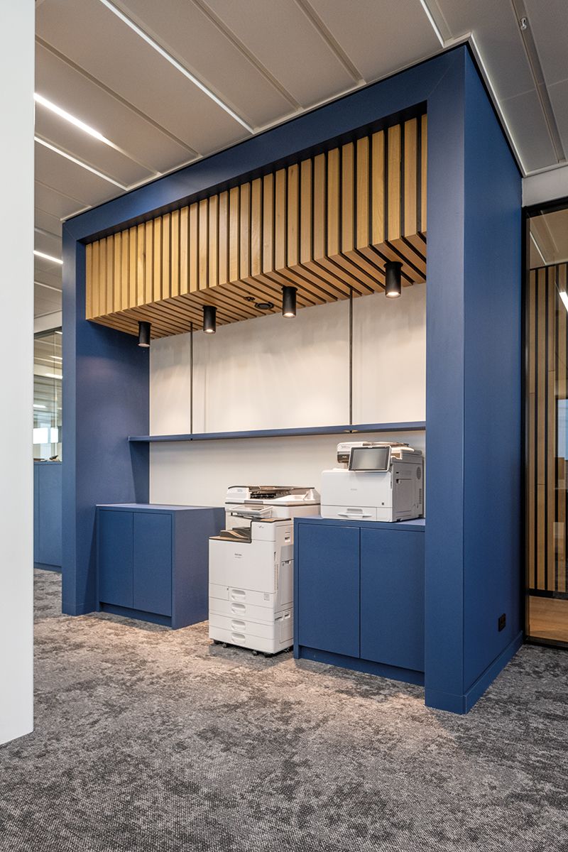 Het bedrijfsinterieur is uitgevoerd in blauwe kleuren met houten latten. De combinatie van deze materialen zorgt voor een gezellige en warme uitstraling. De blauwe kleuren zijn rustgevend en stimuleren de productiviteit. Daarnaast geven de houten latten een natuurlijke touch aan het interieur. Het meubilair sluit perfect aan op deze sfeer en is comfortabel en functioneel. Het bedrijfsinterieur is een inspirerende omgeving voor medewerkers en klanten.