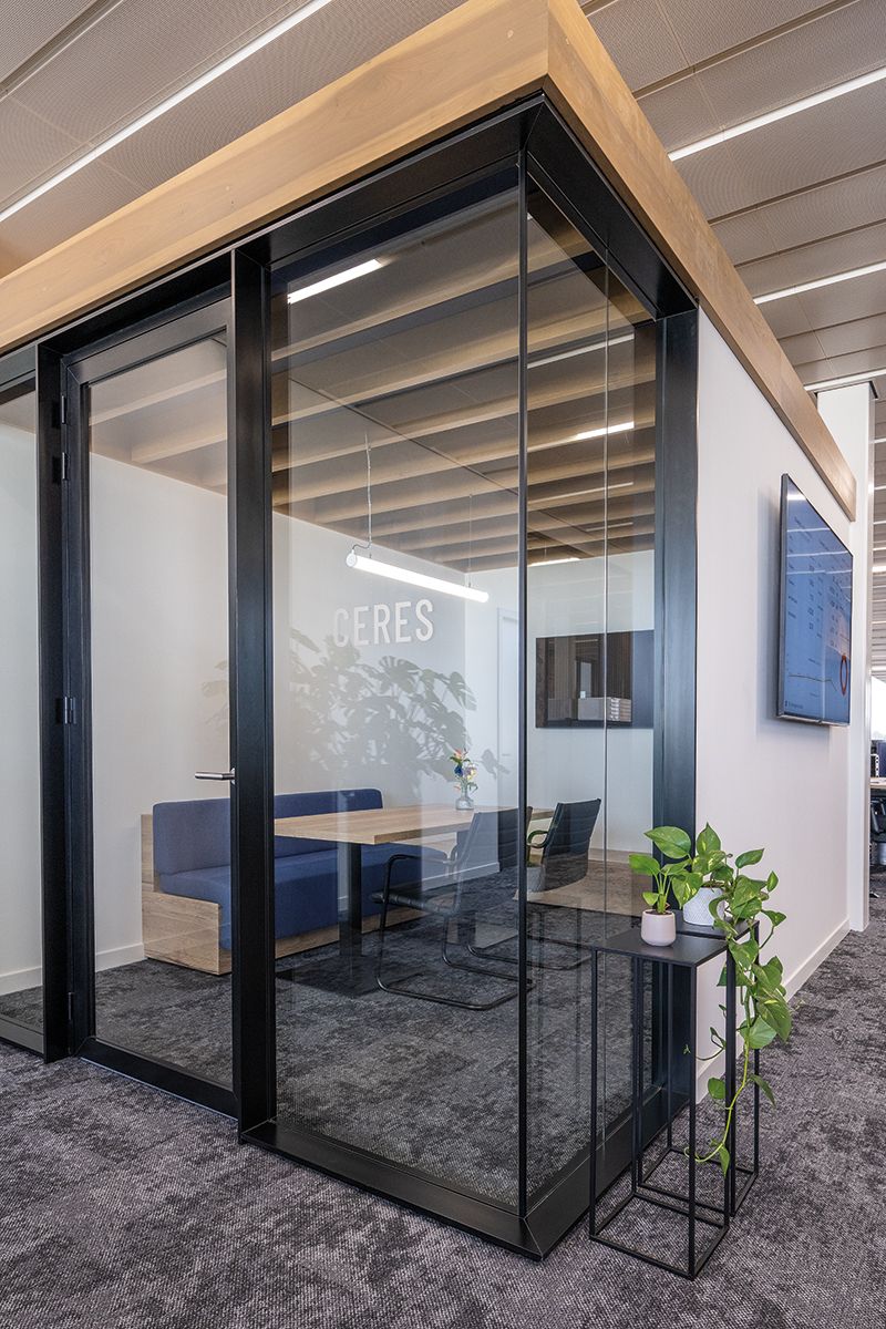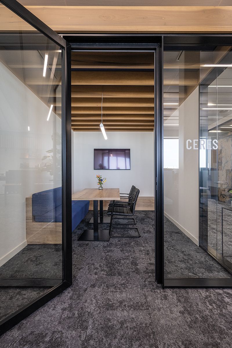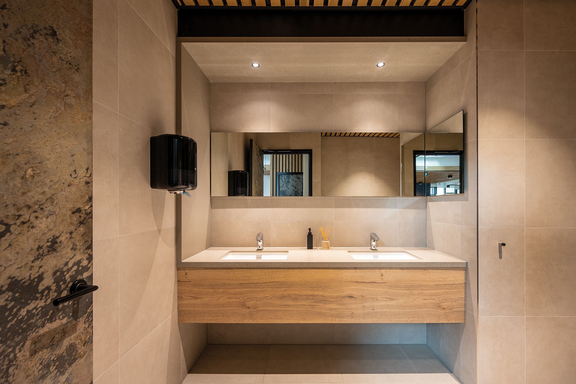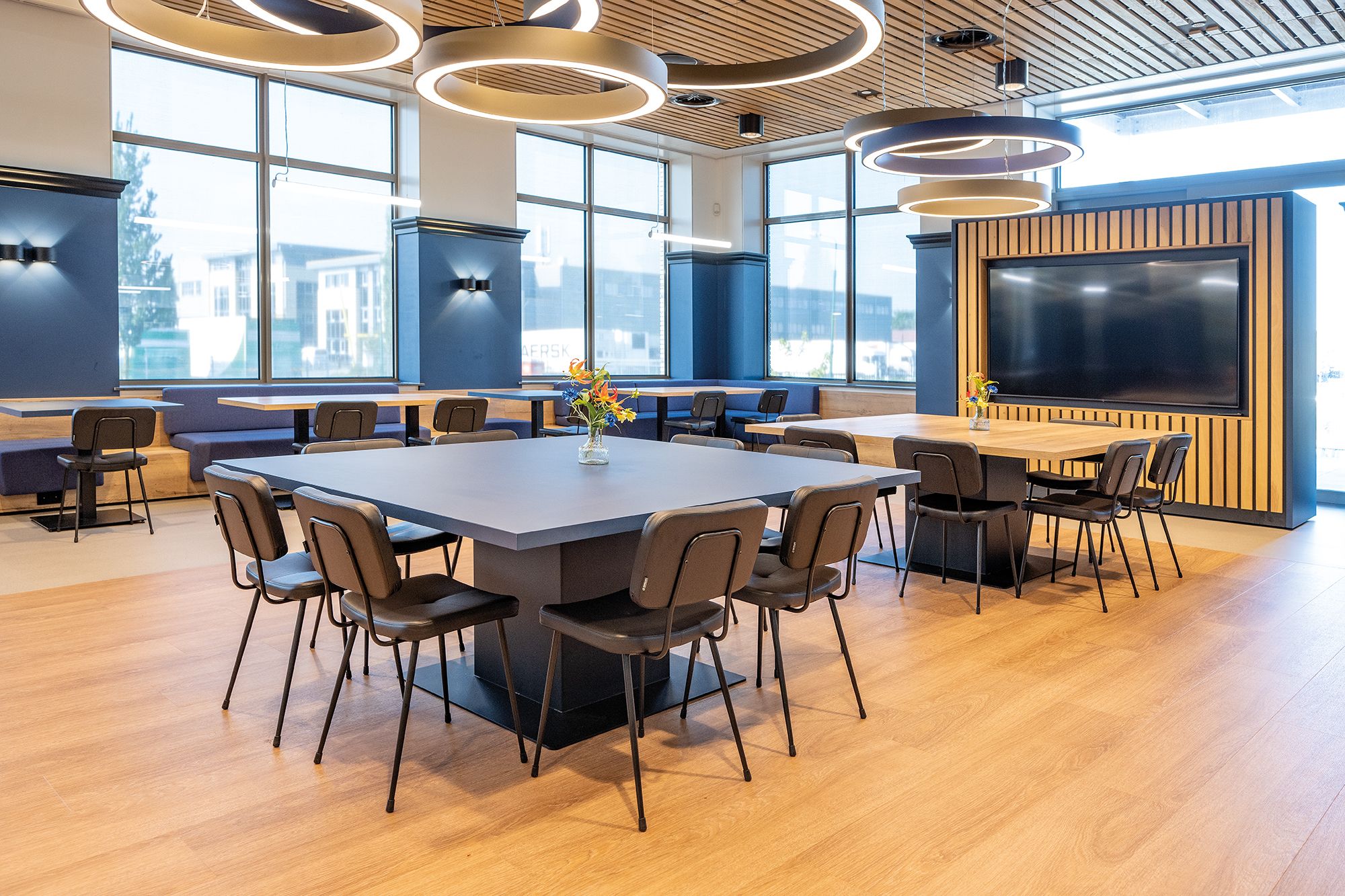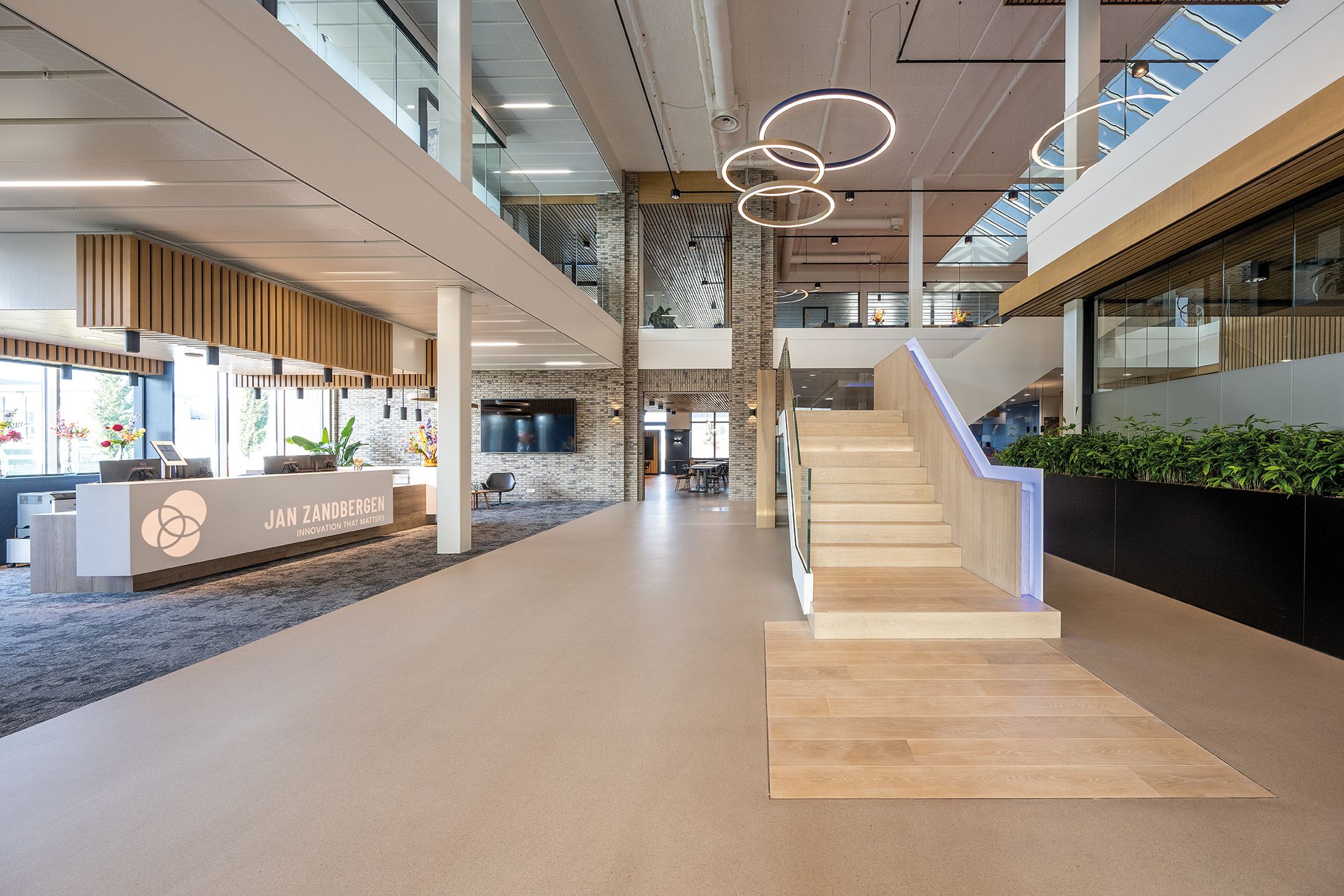 Het bedrijfsinterieur is uitgevoerd in blauwe kleuren met houten latten. De combinatie van deze materialen zorgt voor een gezellige en warme uitstraling. De blauwe kleuren zijn rustgevend en stimuleren de productiviteit. Daarnaast geven de houten latten een natuurlijke touch aan het interieur. Het meubilair sluit perfect aan op deze sfeer en is comfortabel en functioneel. Het bedrijfsinterieur is een inspirerende omgeving voor medewerkers en klanten.