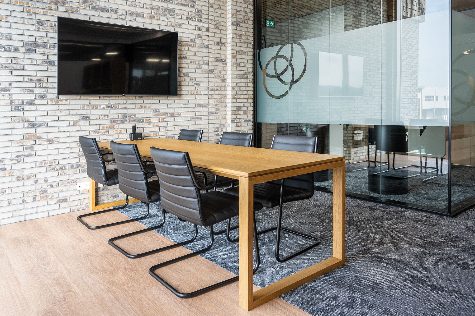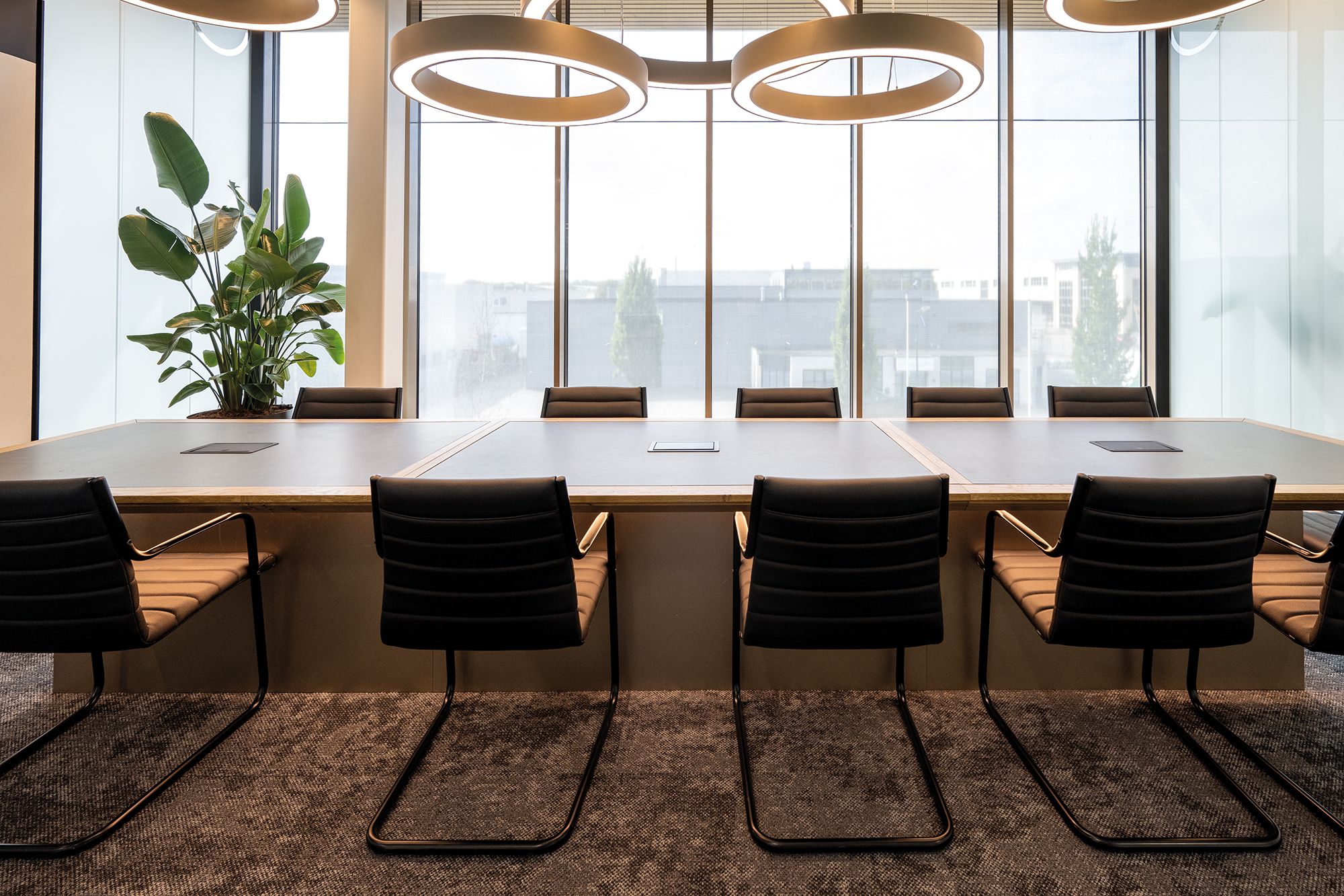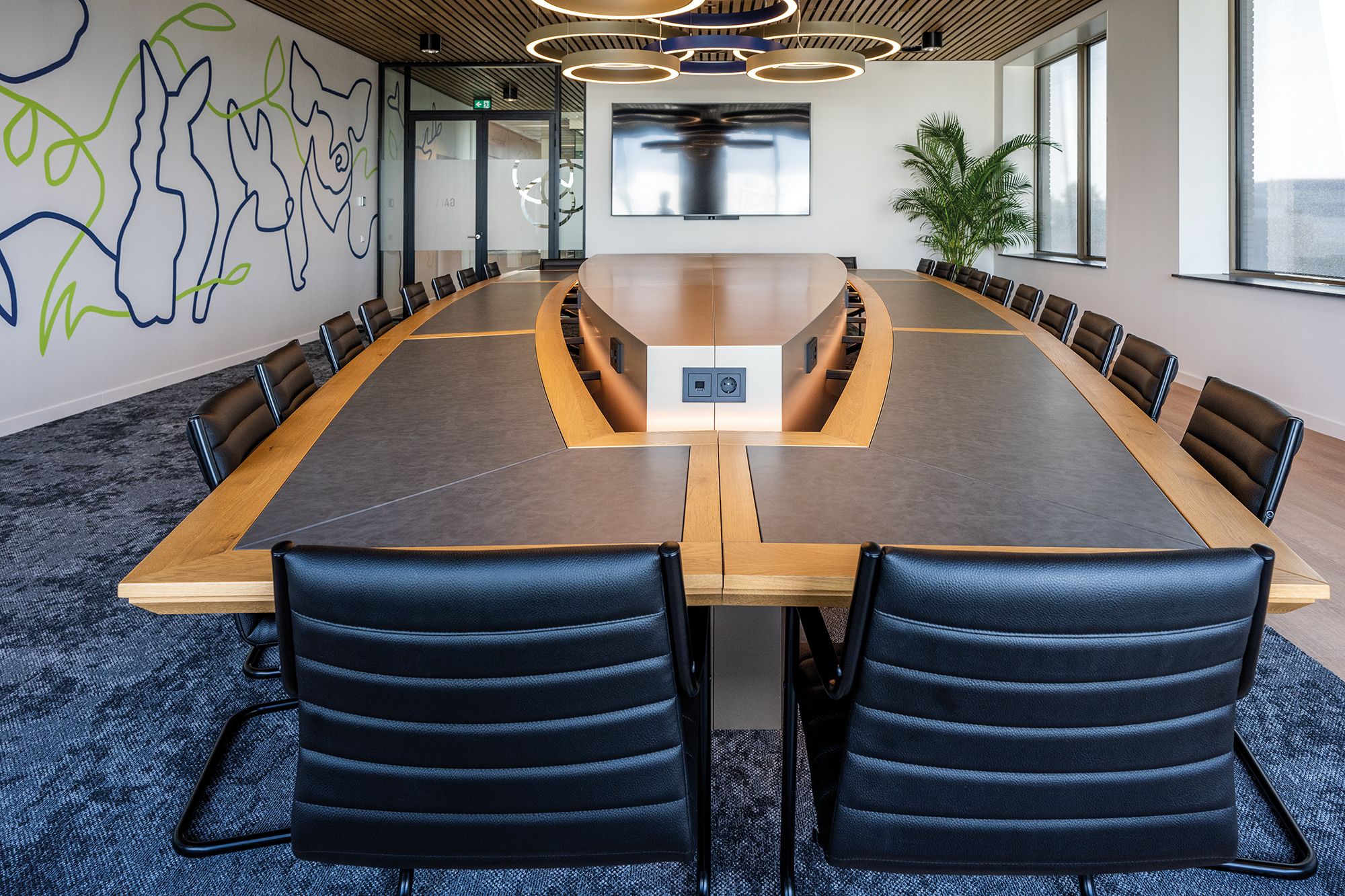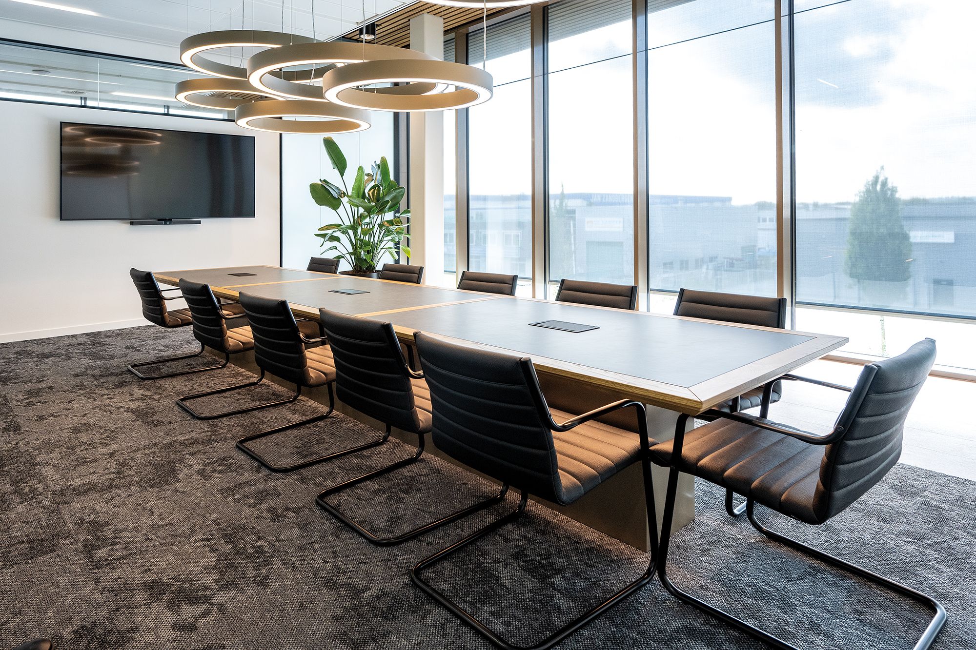 Wat een fantastisch bedrijfsinterieur is dit geworden. Bij dit project hebben we al het meubelmaatwerk mogen maken. Van een mooie ontvangstbalie, vergadertafels tot een fitness ruimte. De echte eyecatchers van dit project zijn toch wel de ontvangstbalie en de imposante vergadertafel. De vergadertafel heeft maar liefst een afmeting van 8 meter lang en 4,2 meter breed. De tafel is rondom voorzien van ledverlichting en heeft lederen inlays. Het was al met al een hele klus maar wat een zijn we trots op het eindresultaat.