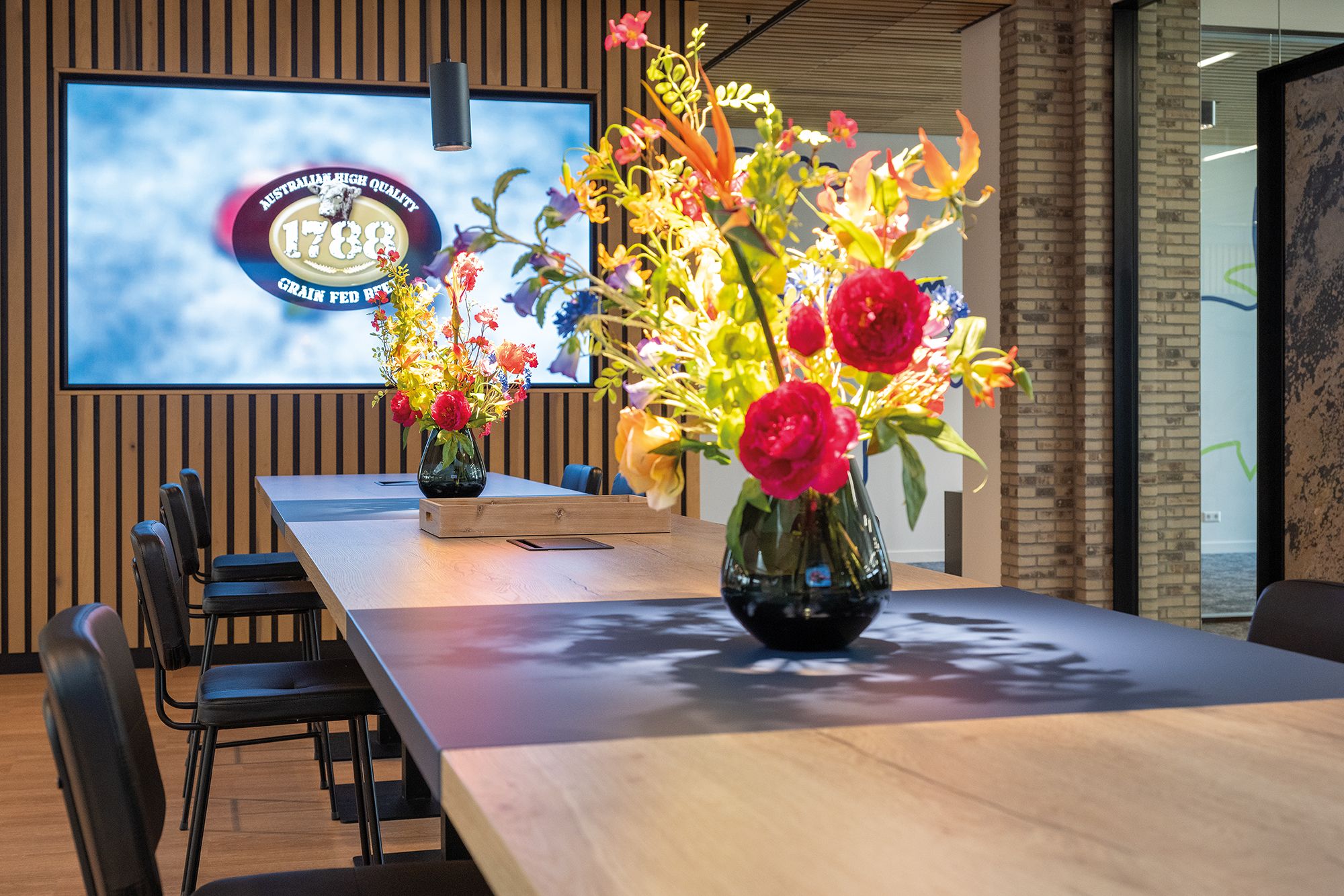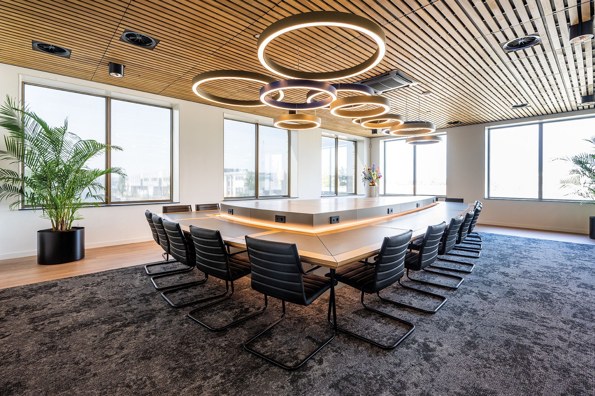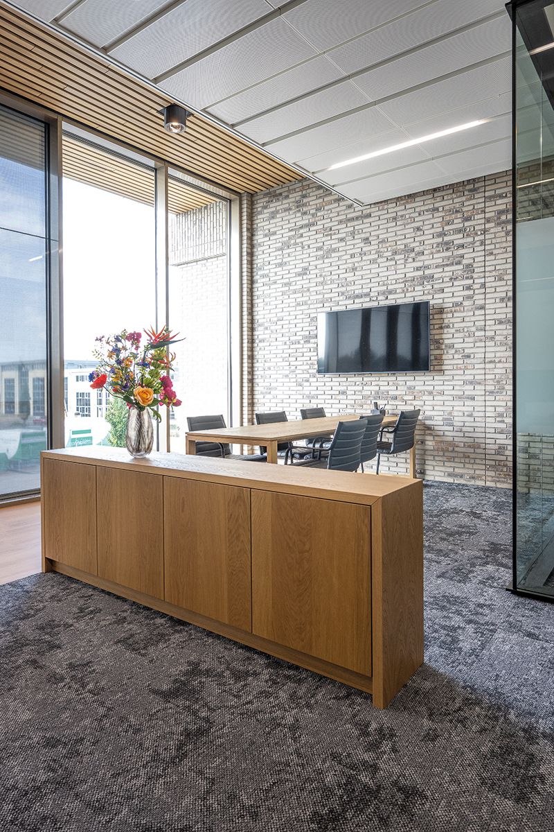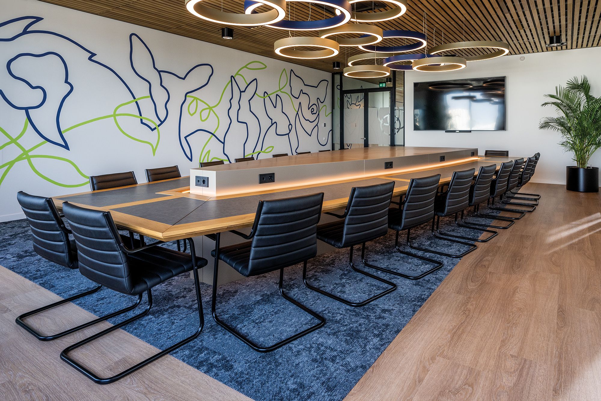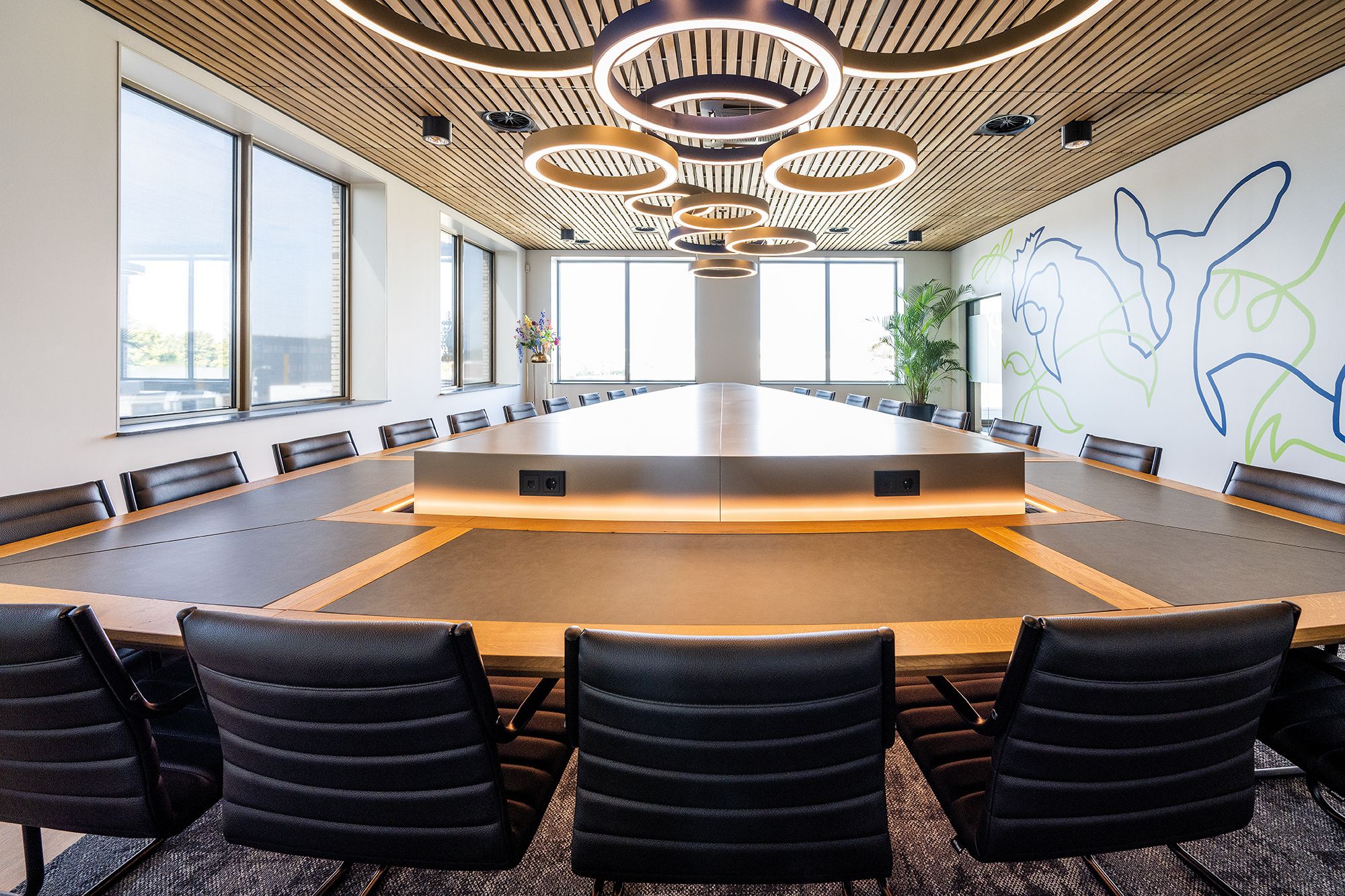 Wat een fantastisch bedrijfsinterieur is dit geworden. Bij dit project hebben we al het meubelmaatwerk mogen maken. Van een mooie ontvangstbalie, vergadertafels tot een fitness ruimte. De echte eyecatchers van dit project zijn toch wel de ontvangstbalie en de imposante vergadertafel. De vergadertafel heeft maar liefst een afmeting van 8 meter lang en 4,2 meter breed. De tafel is rondom voorzien van ledverlichting en heeft lederen inlays. Het was al met al een hele klus maar wat een zijn we trots op het eindresultaat.
