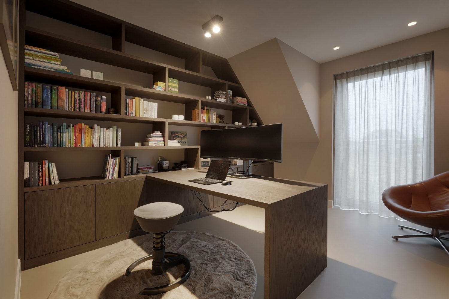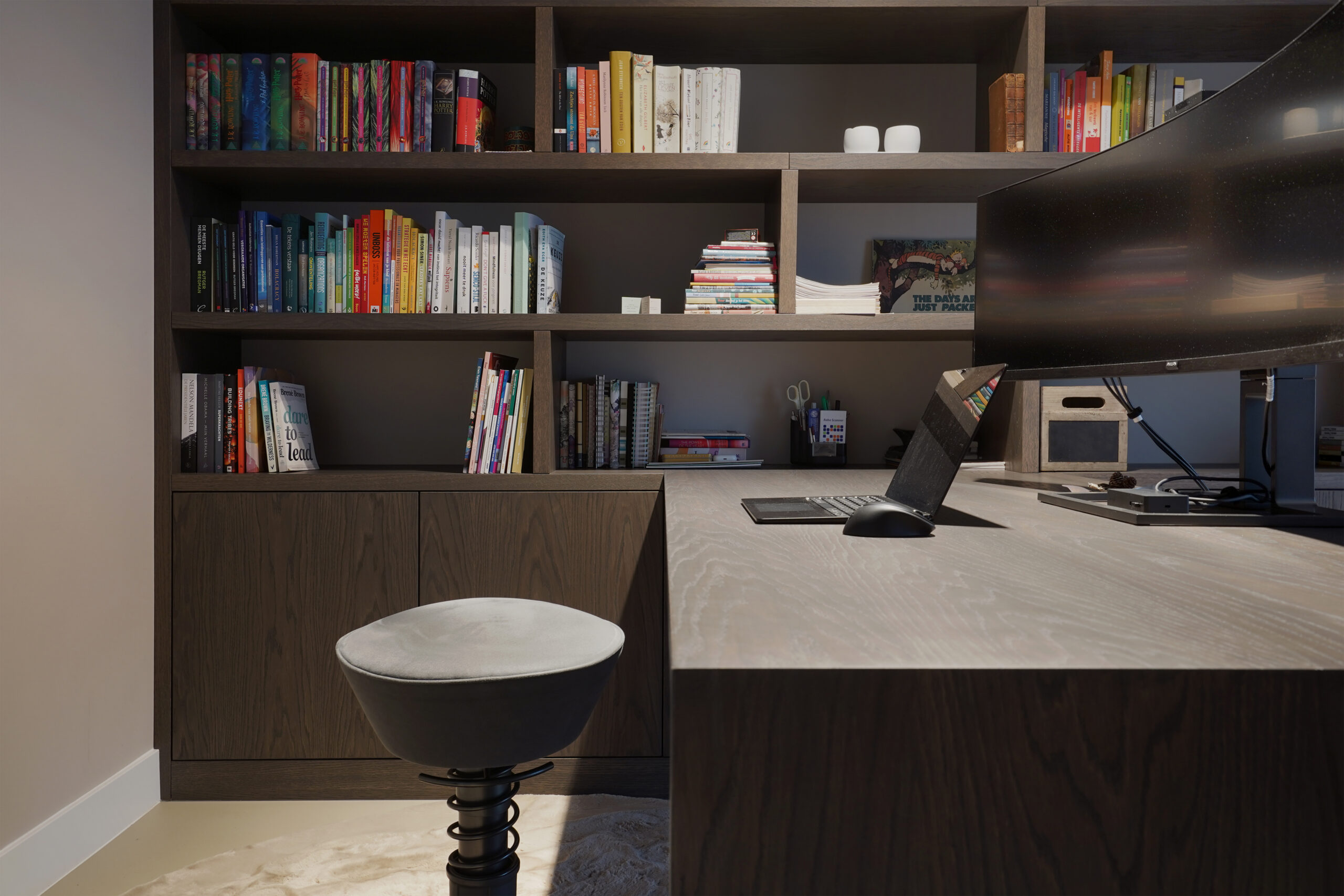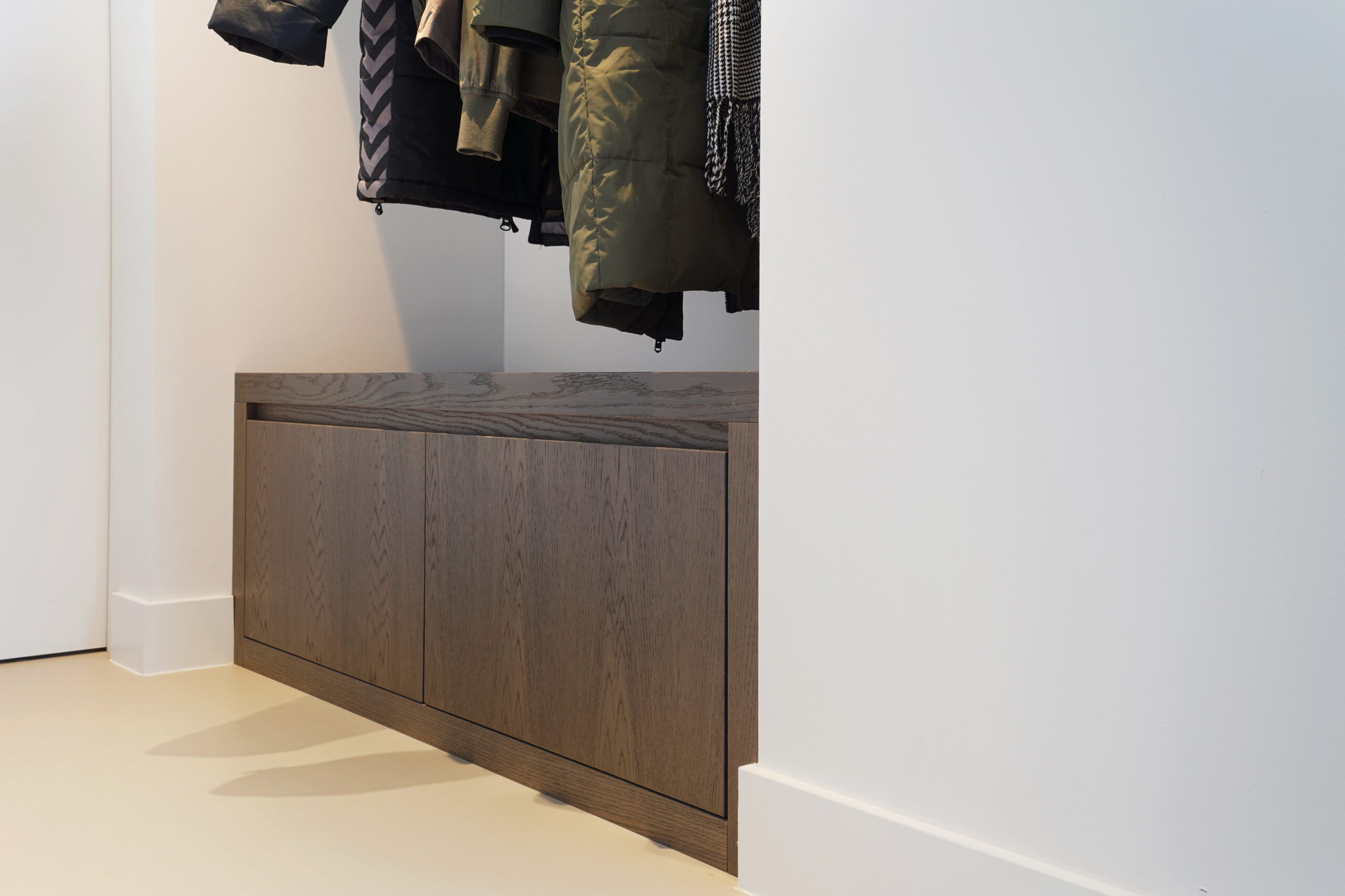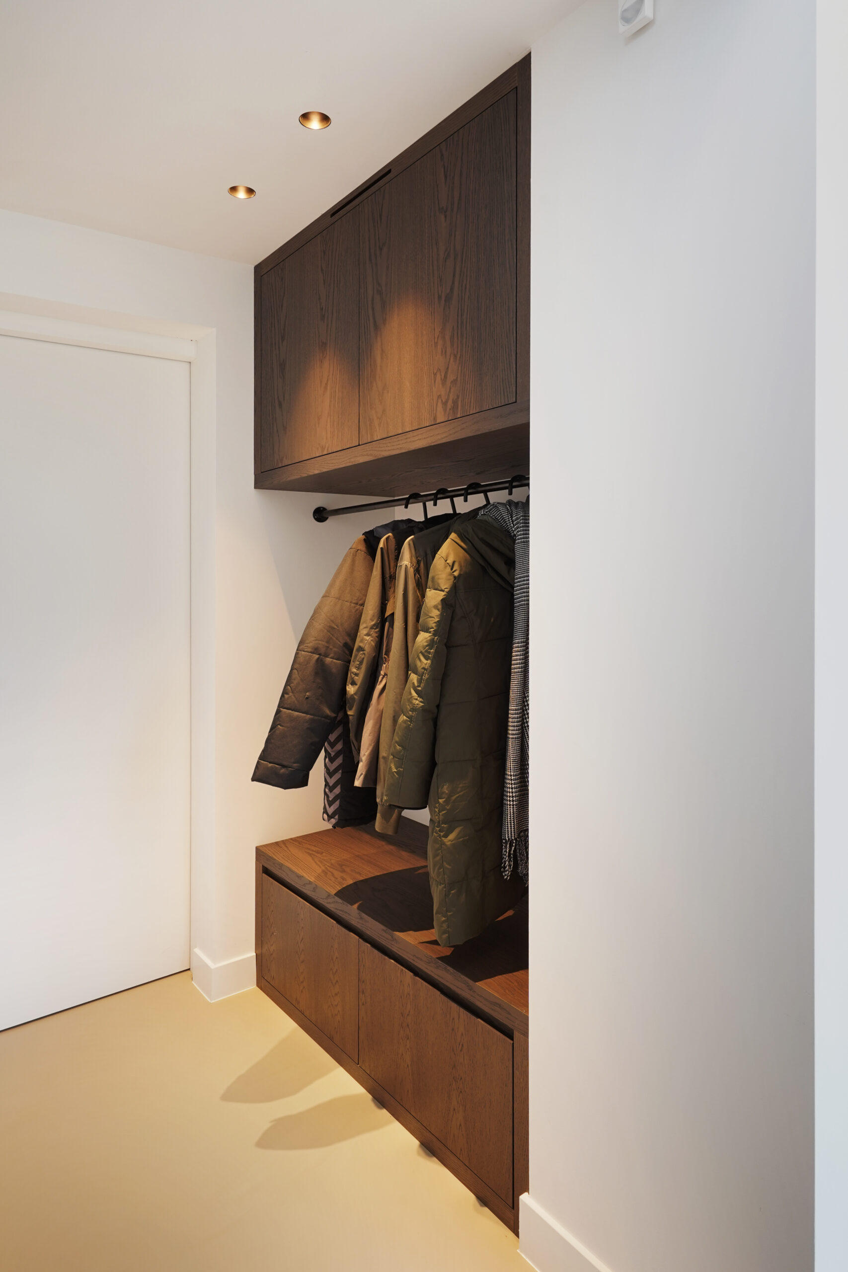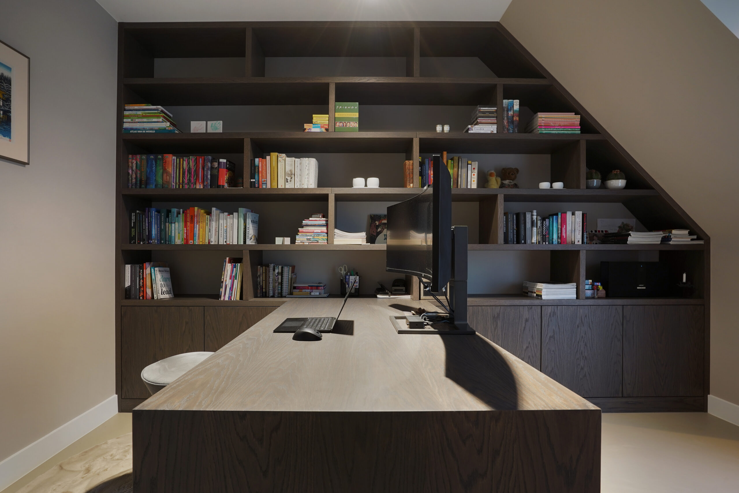 Dit prachtige maatwerk interieur in Veenendaal is echt een plaatje geworden. Over alle details is nagedacht. In het bijzonder het keukeneiland. Er is hier gekozen voor een echte bronzen metaal lak ook wel genaamd Verometal. Verometal is een bijzondere manier van afwerking. Het is een koud vloeibaar metaal wat in verschillende lagen op de meubelpanelen wordt aangebracht. De apparatenwand van de keuken, tv-meubel, garderobe en kast op de werkkamer zijn gemaakt van eiken gefineerd mdf en is naar wens in een donker bruine kleur gebeitst.
