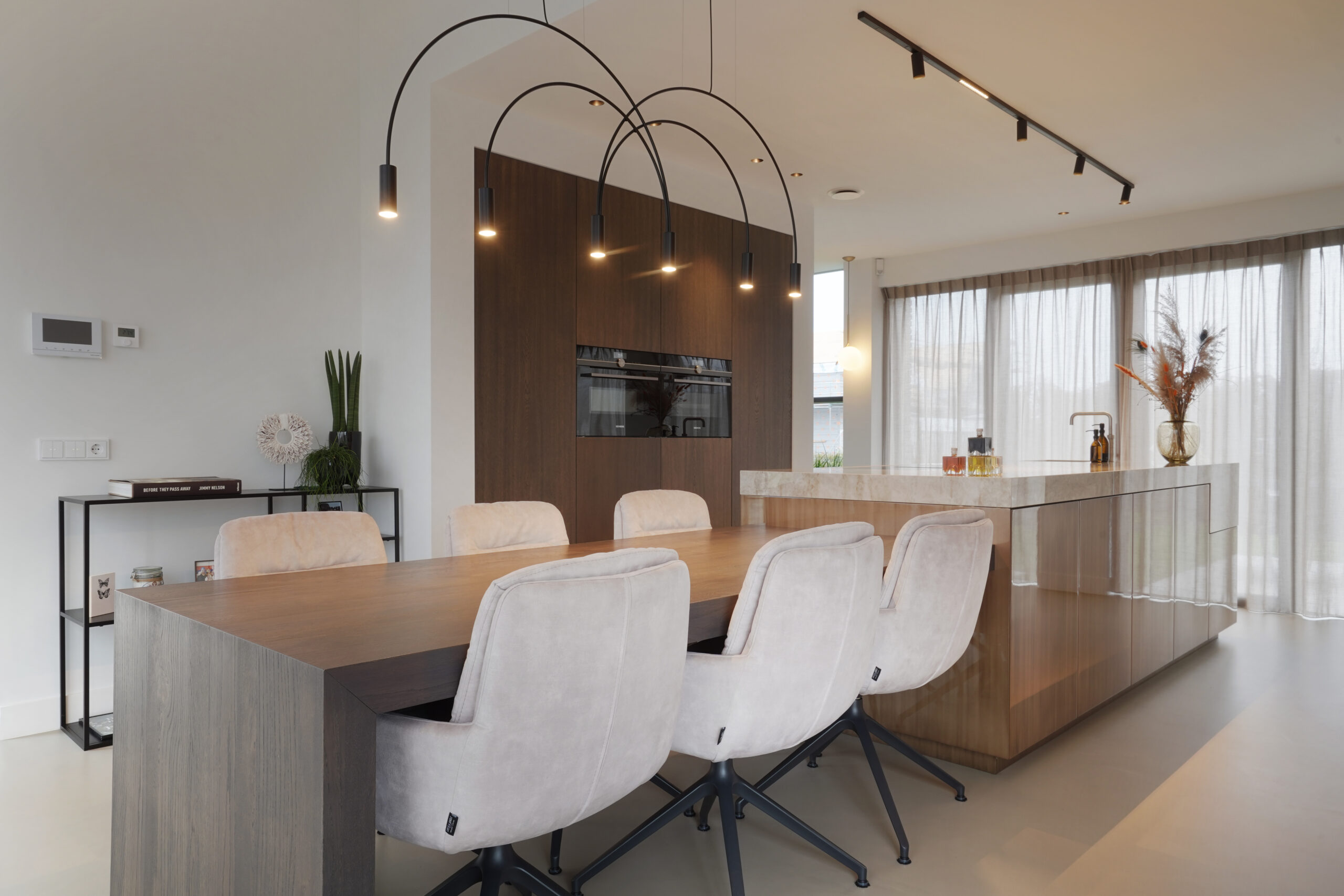 Naast het Verometal is het keukenblad ook een echte blikvanger. Het blad is van het merk Dekton en is bij het spoelgedeelte extra opgedikt om een speciale look te geven.