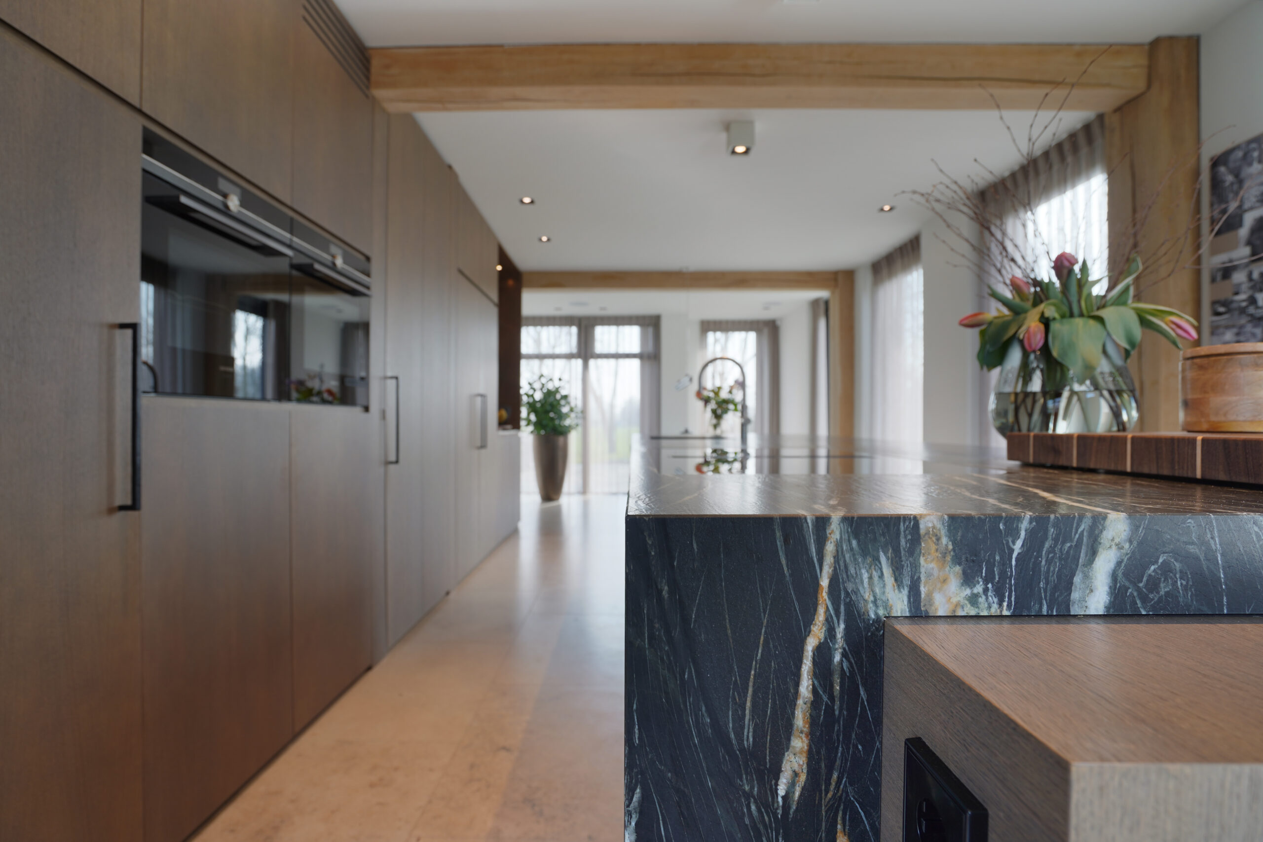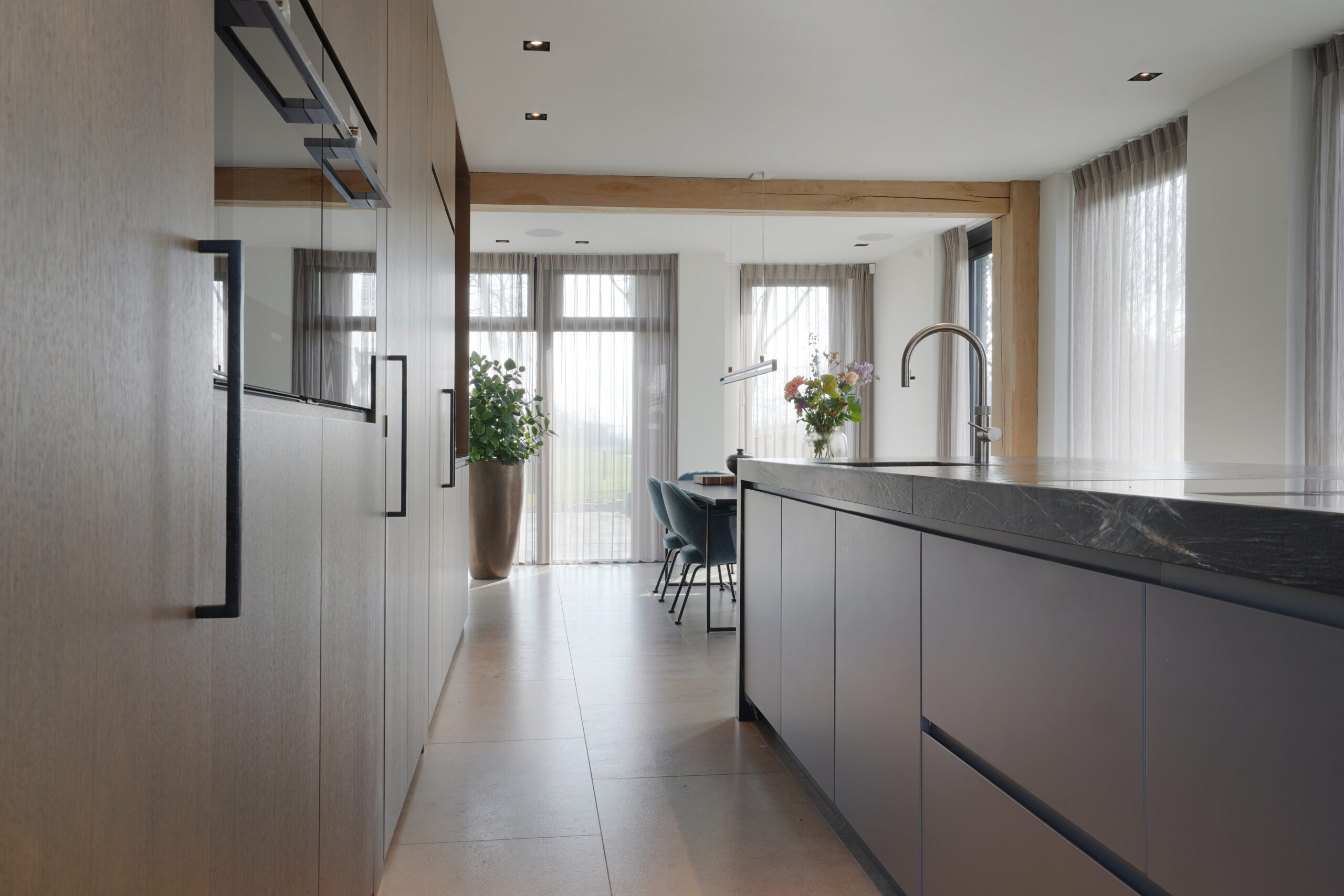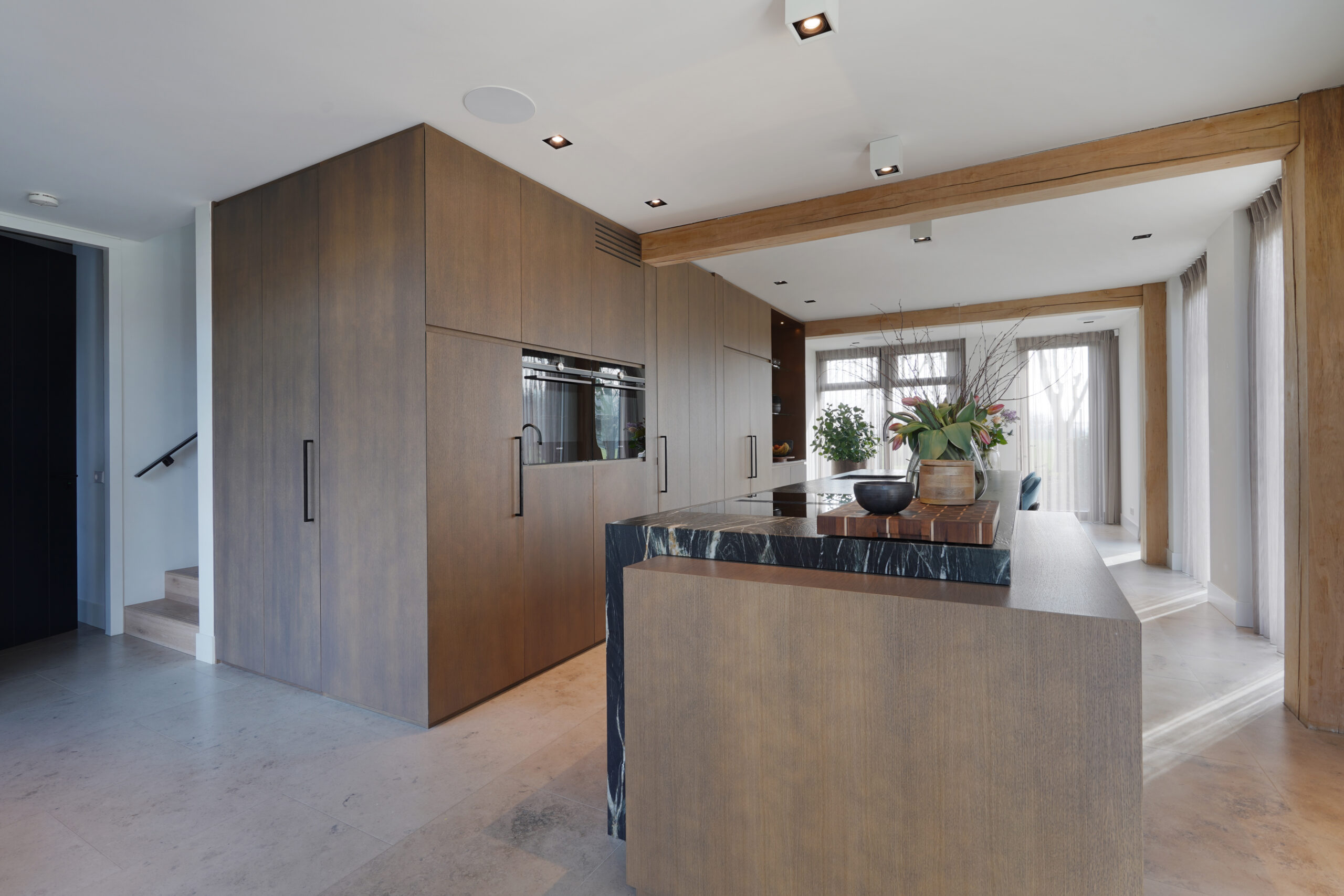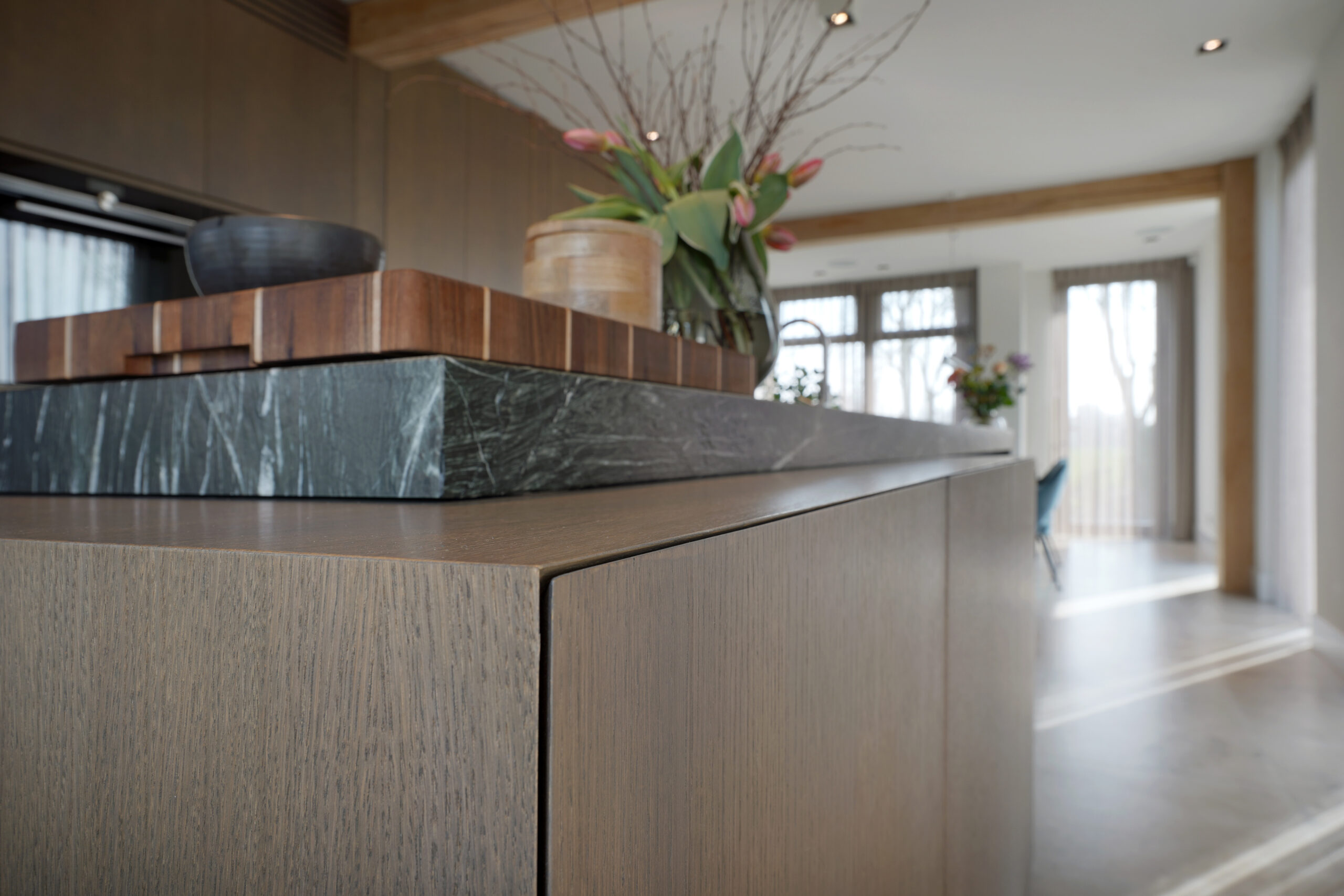 Een schitterende combinatie van natuurlijke materialen. Donker gebeitst eiken hout met een natuurstenen keukenblad. De keuken op maat is voor een groot gedeelte greeploos uitgevoerd door middel van een verstekgreep. In de apparatenwand zit nog een verrassing. Er zit een deur in de keukenwand verwerkt die toegang geeft tot de kelder. Dit noem je nog eens een op maat gemaakte keuken!