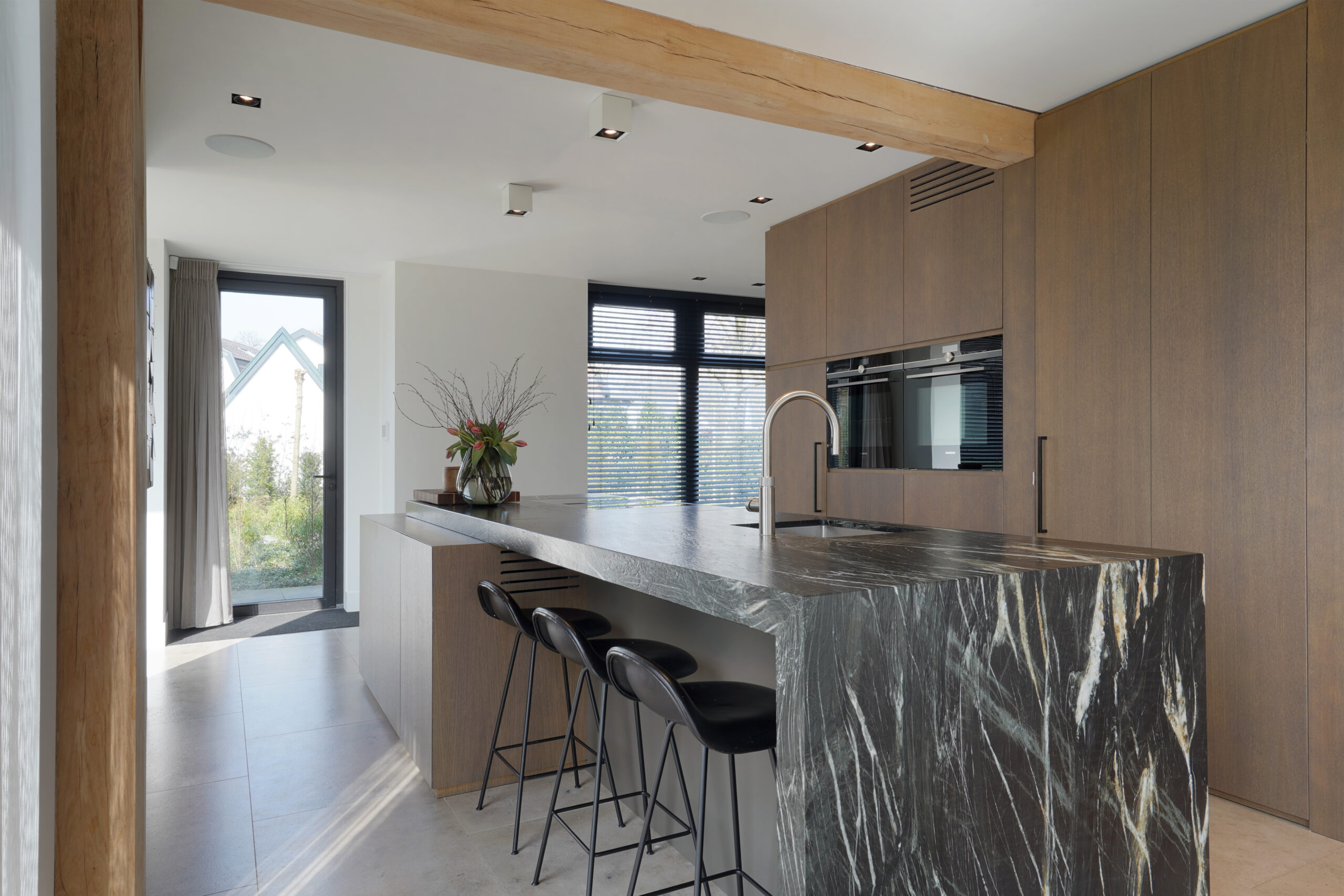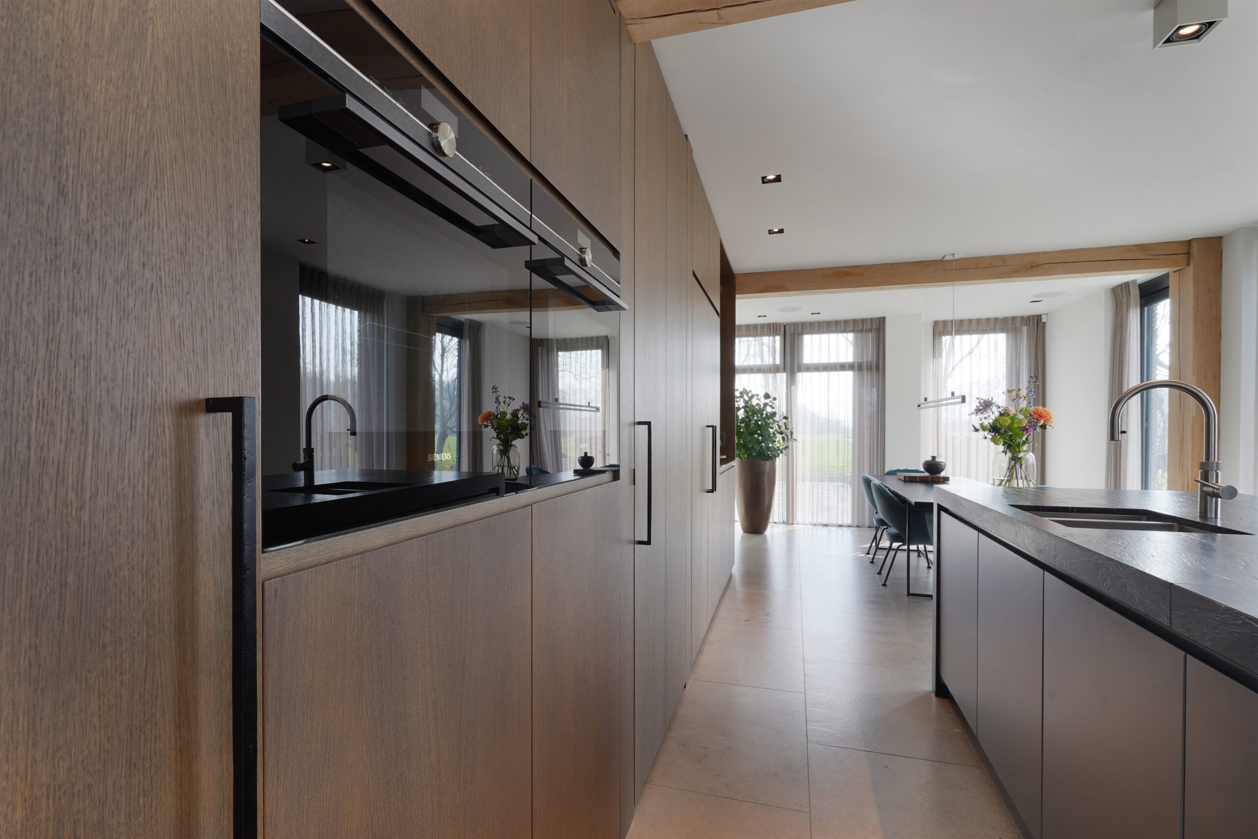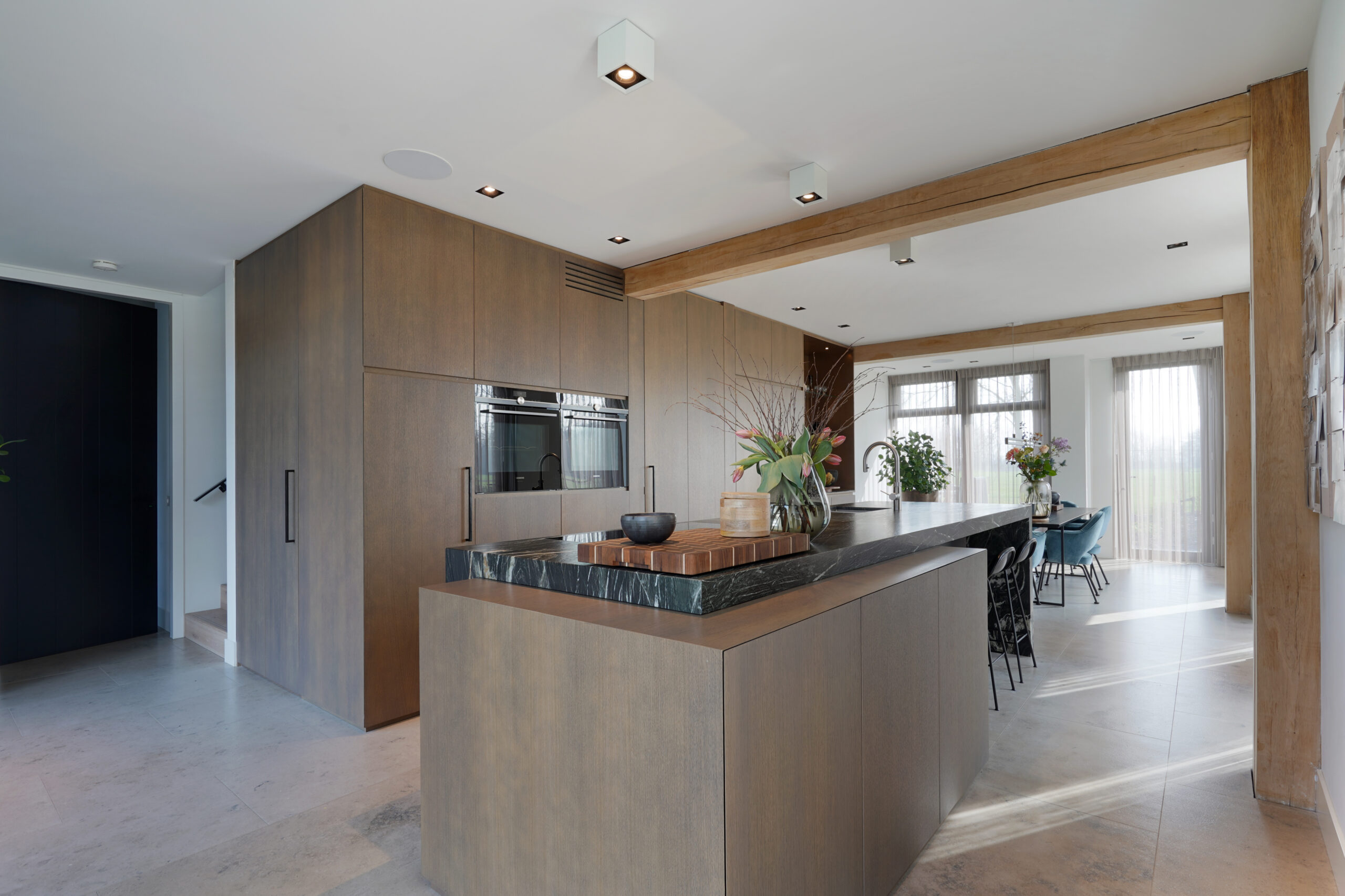 Een schitterende combinatie van natuurlijke materialen. Donker gebeitst eiken hout met een natuurstenen keukenblad. De keuken op maat is voor een groot gedeelte greeploos uitgevoerd door middel van een verstekgreep. In de apparatenwand zit nog een verrassing. Er zit een deur in de keukenwand verwerkt die toegang geeft tot de kelder. Dit noem je nog eens een op maat gemaakte keuken!