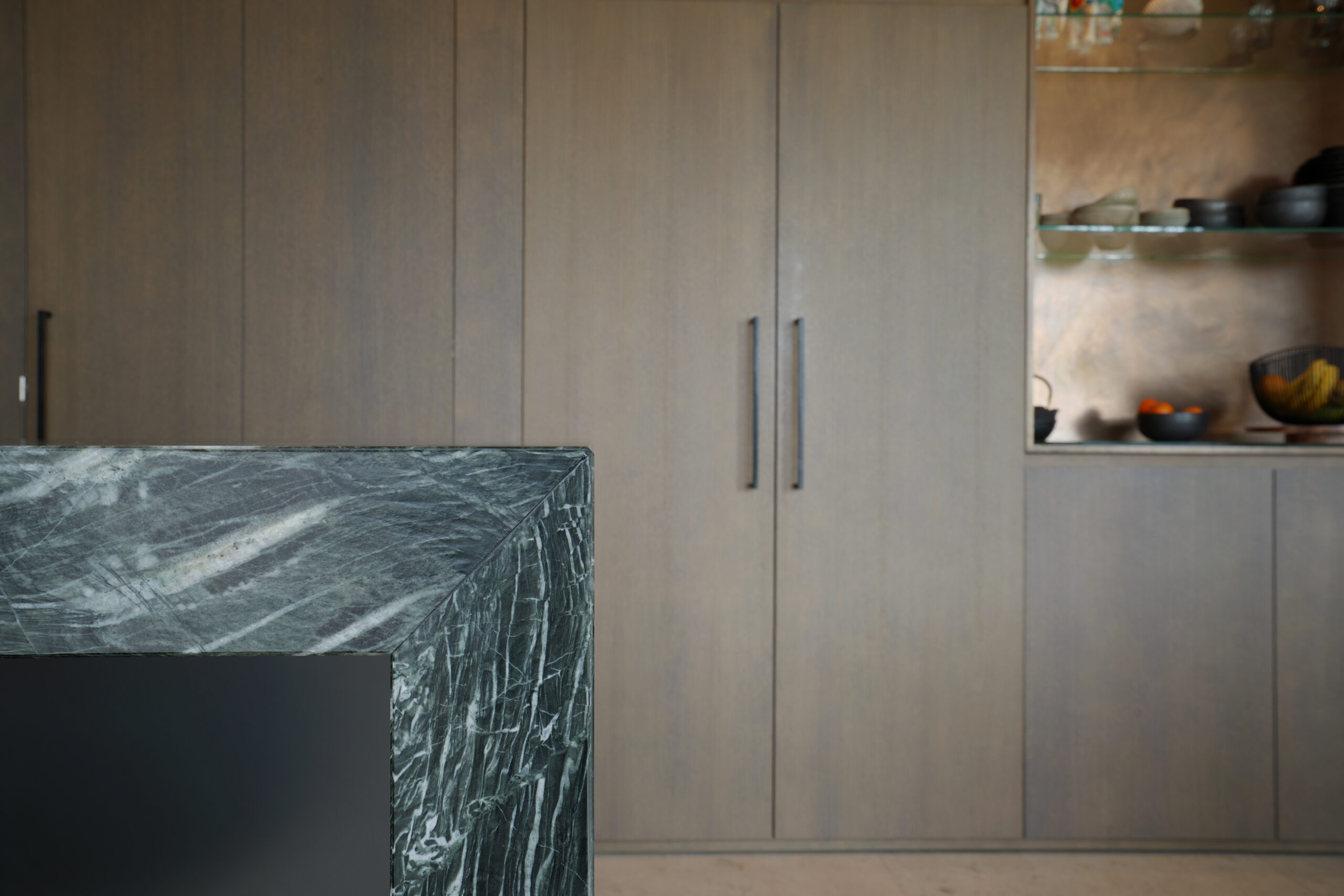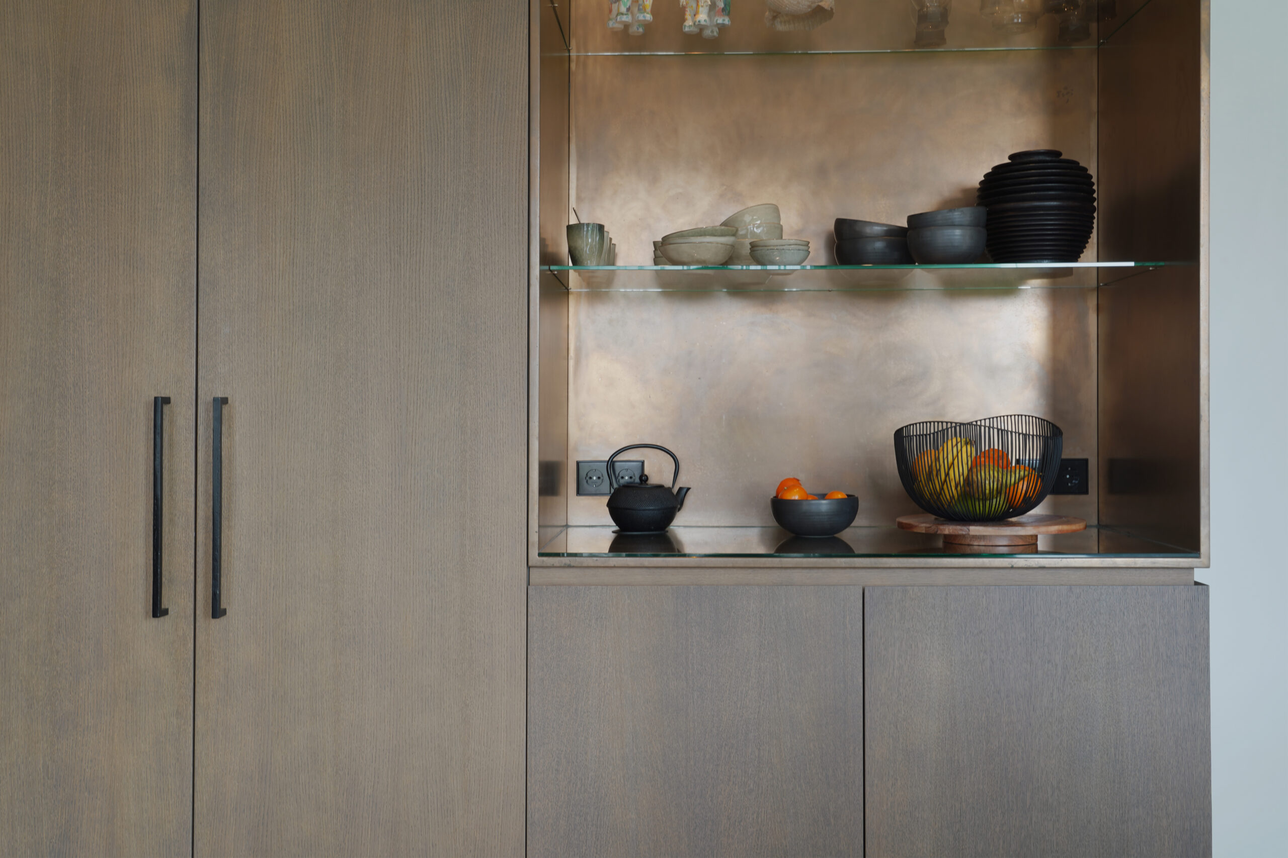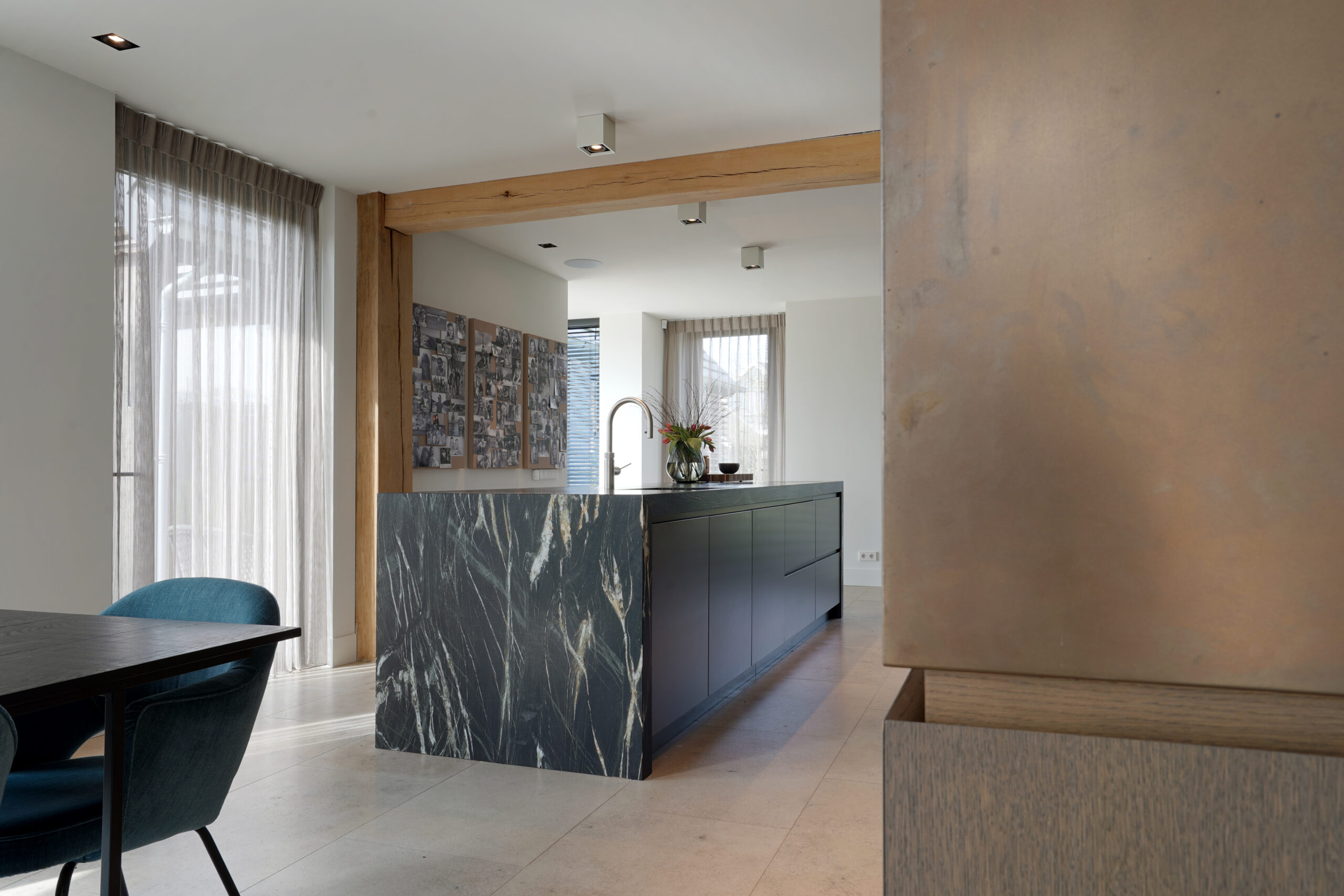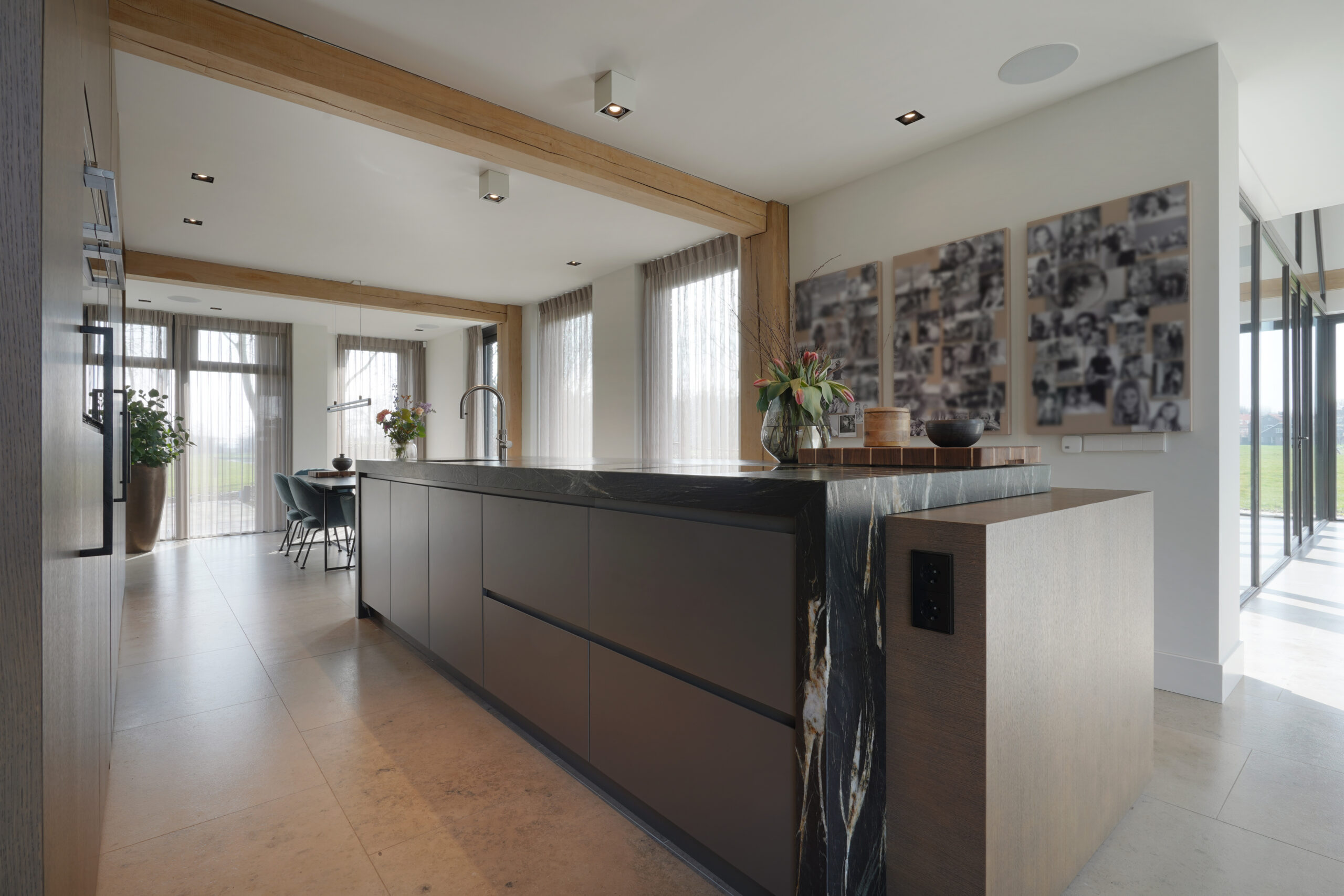 Een schitterende combinatie van natuurlijke materialen. Donker gebeitst eiken hout met een natuurstenen keukenblad. De keuken op maat is voor een groot gedeelte greeploos uitgevoerd door middel van een verstekgreep. In de apparatenwand zit nog een verrassing. Er zit een deur in de keukenwand verwerkt die toegang geeft tot de kelder. Dit noem je nog eens een op maat gemaakte keuken!