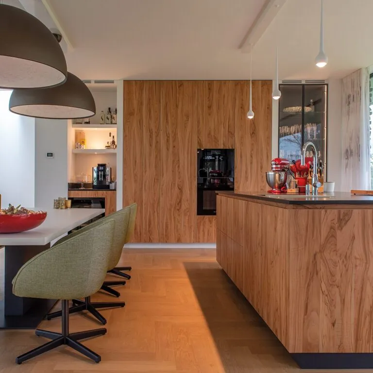Een warme sfeervolle keuken is de perfecte plek om heerlijk te koken en te genieten van gezelligheid en comfort. Met zachte kleuren, warme verlichting en natuurlijke materialen zoals hout en steen, creëer je een knusse en uitnodigende sfeer. De binnenzijde van deze keuken is gemaakt van massief Europees grenen hout en is afgewerkt met een matte 2-componenten lak. De keukendeuren en staanders zijn gemaakt van vochtwerend mdf en zijn afgespoten in een matte staalblauwe kleur. De chique gouden handgrepen geven de keuken een warme uitstraling.