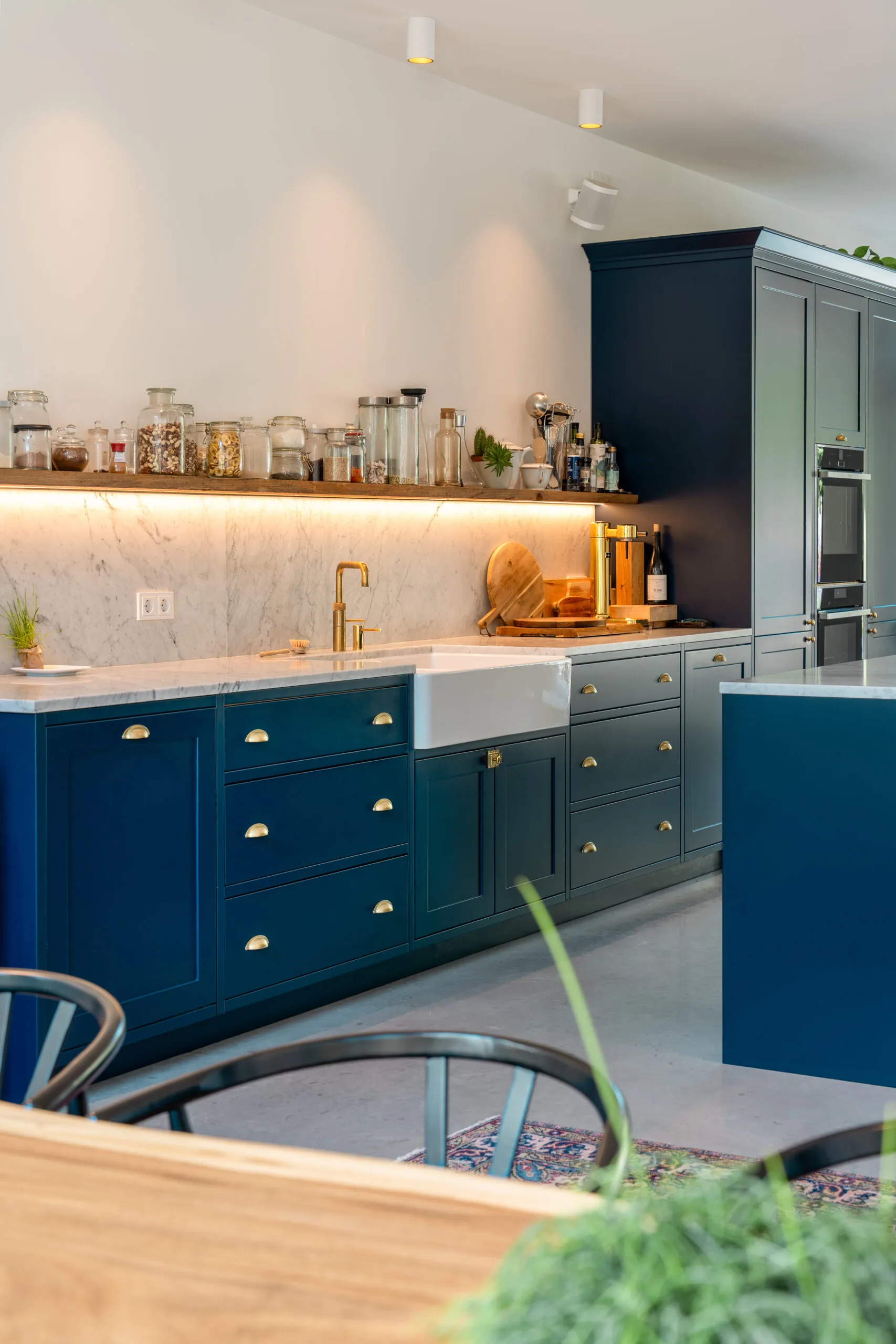 Deze blauwe keuken straalt een warme sfeer uit en krijgt een luxueuze uitstraling door het marmeren werkblad. Het diepe blauw van de kastjes steekt mooi af tegen het lichte marmer. Door de combinatie van het diepe blauw en het marmeren werkblad is deze keuken een echte eyecatcher. Het is een ideale plek om te koken en te genieten van een gezellige sfeer met vrienden en familie.