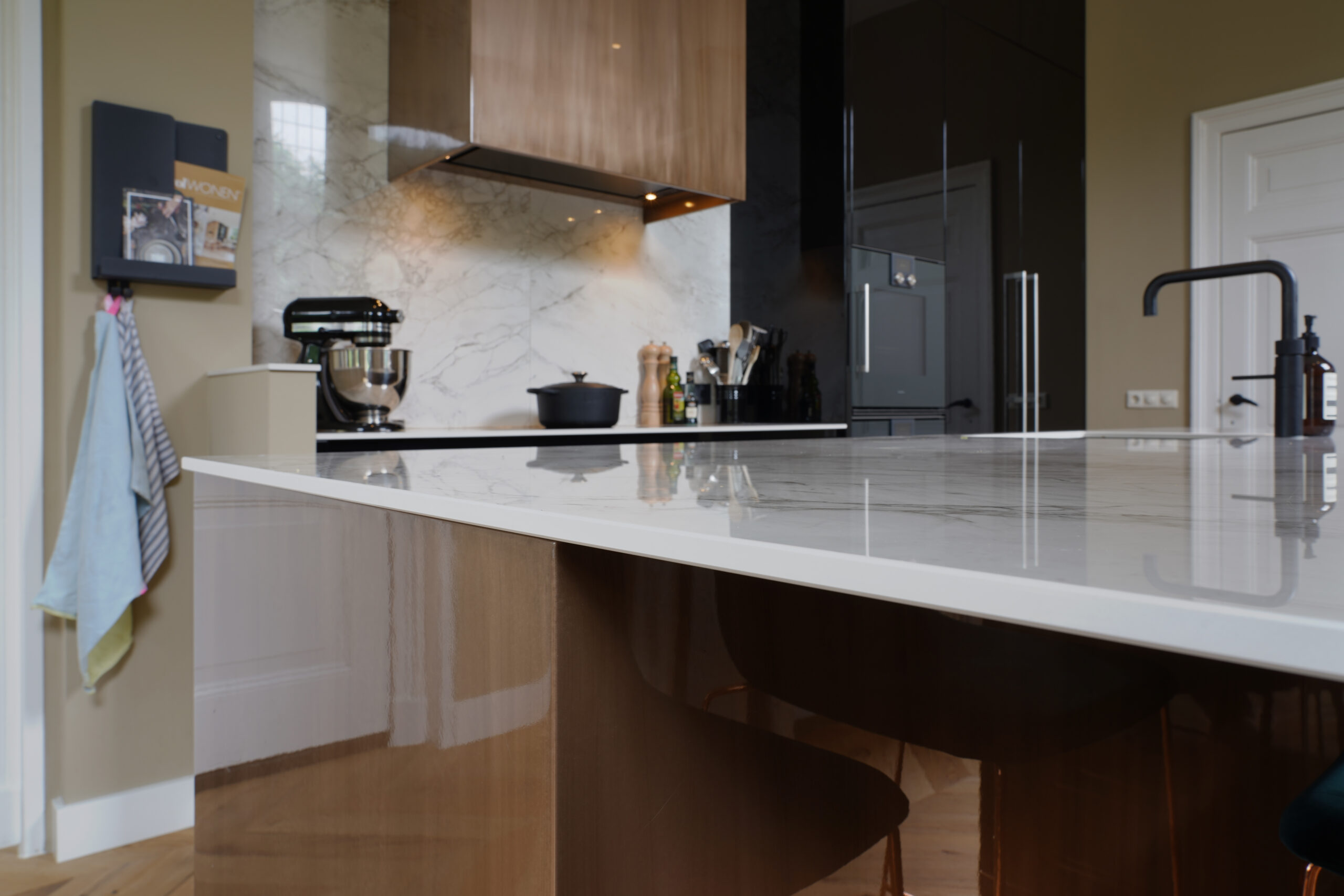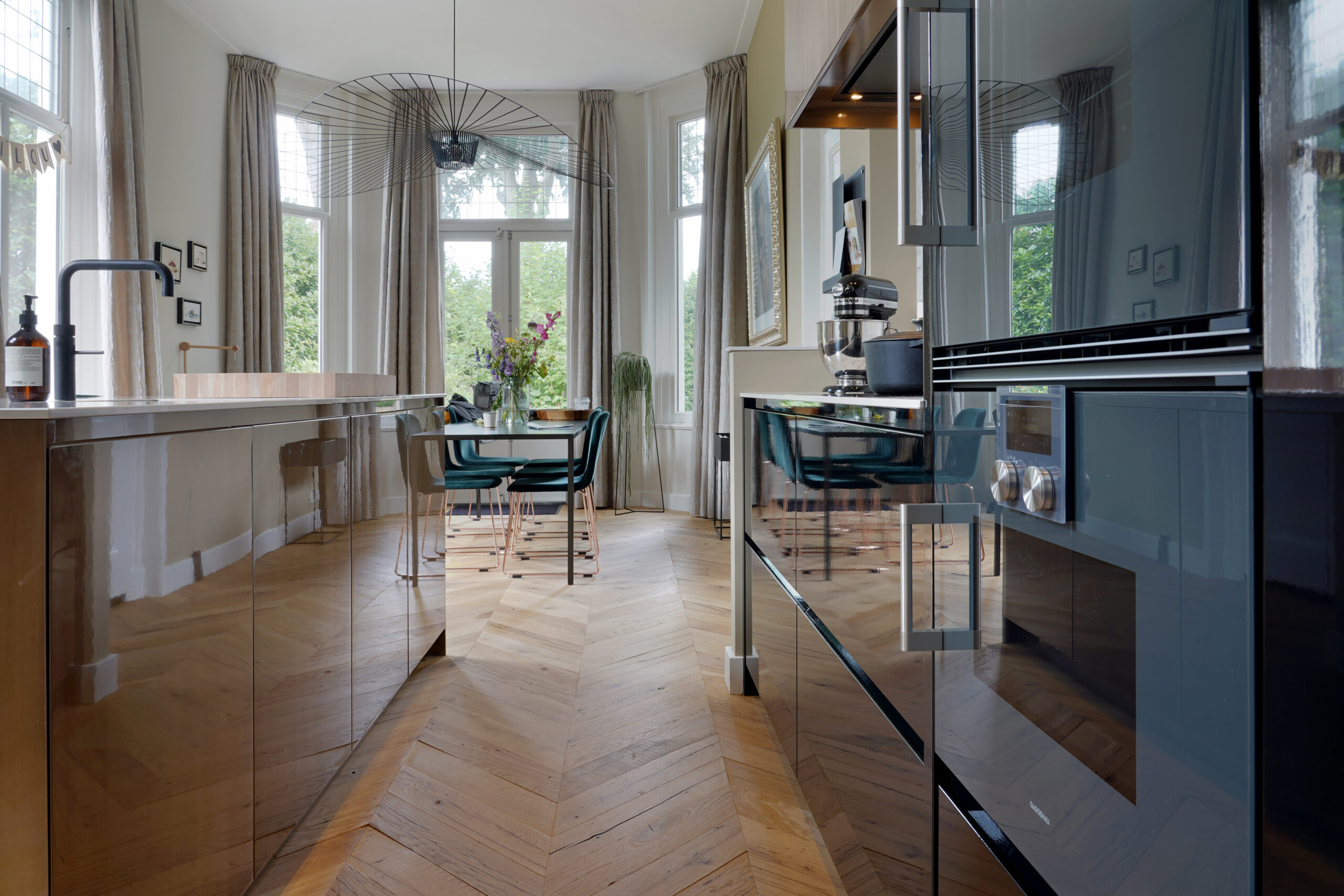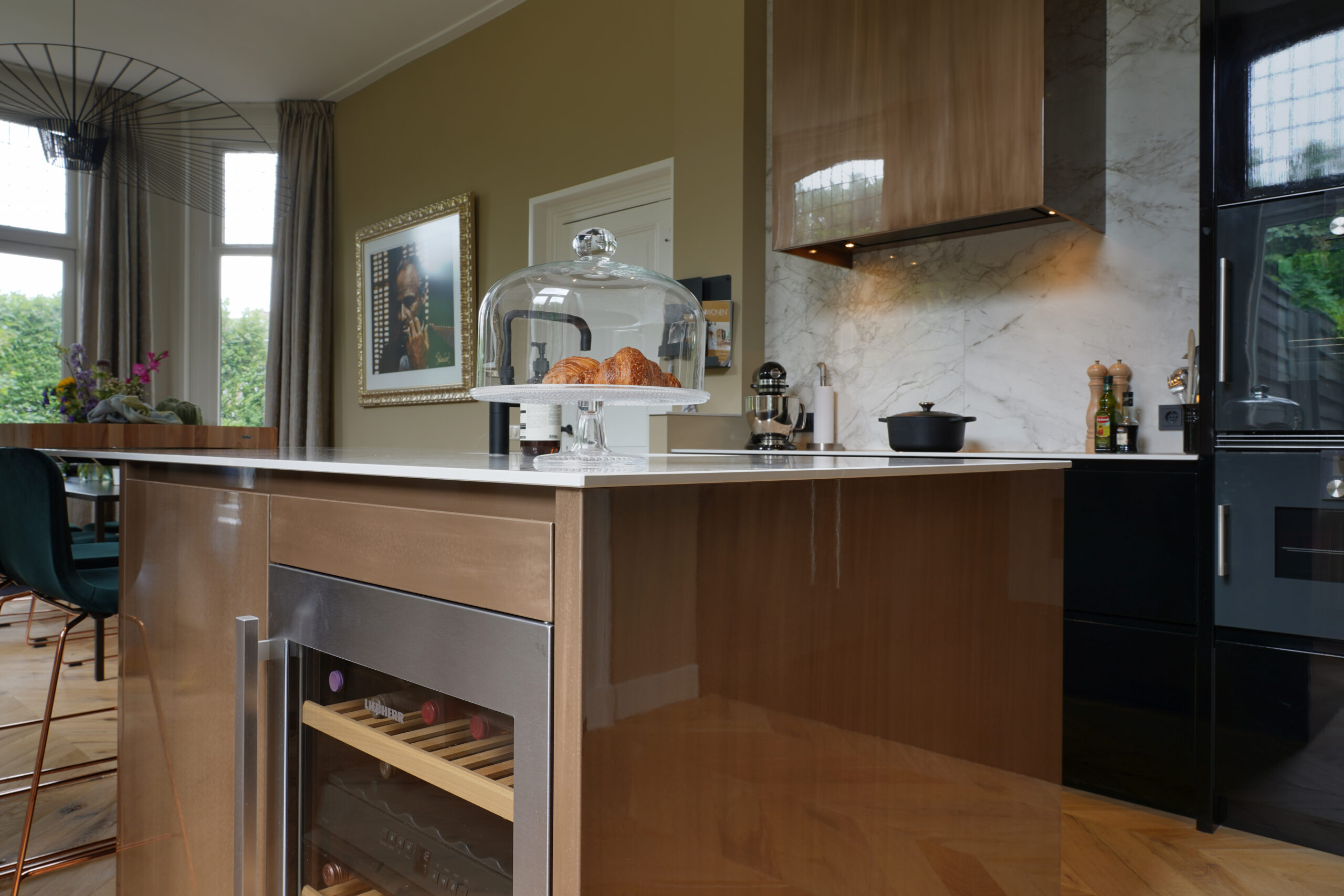 In deze mooie jaren 30 woning hebben wij deze luxe maatwerk keuken gerealiseerd. De combinatie tussen hoogglans zwart en het mooie brons kleurige metaallak maakt het een prachtkeuken! De keuken in voorzien van hi-end keukenapparatuur van het merk Gaggenau. Nog een echte eyecatcher is het Dekton werkblad en achterwand boven het kookgedeelte. Er is door de opdrachtgever gekozen voor het dekton bergen stonika xgloss werkblad uitgevoerd in 12mm dik.