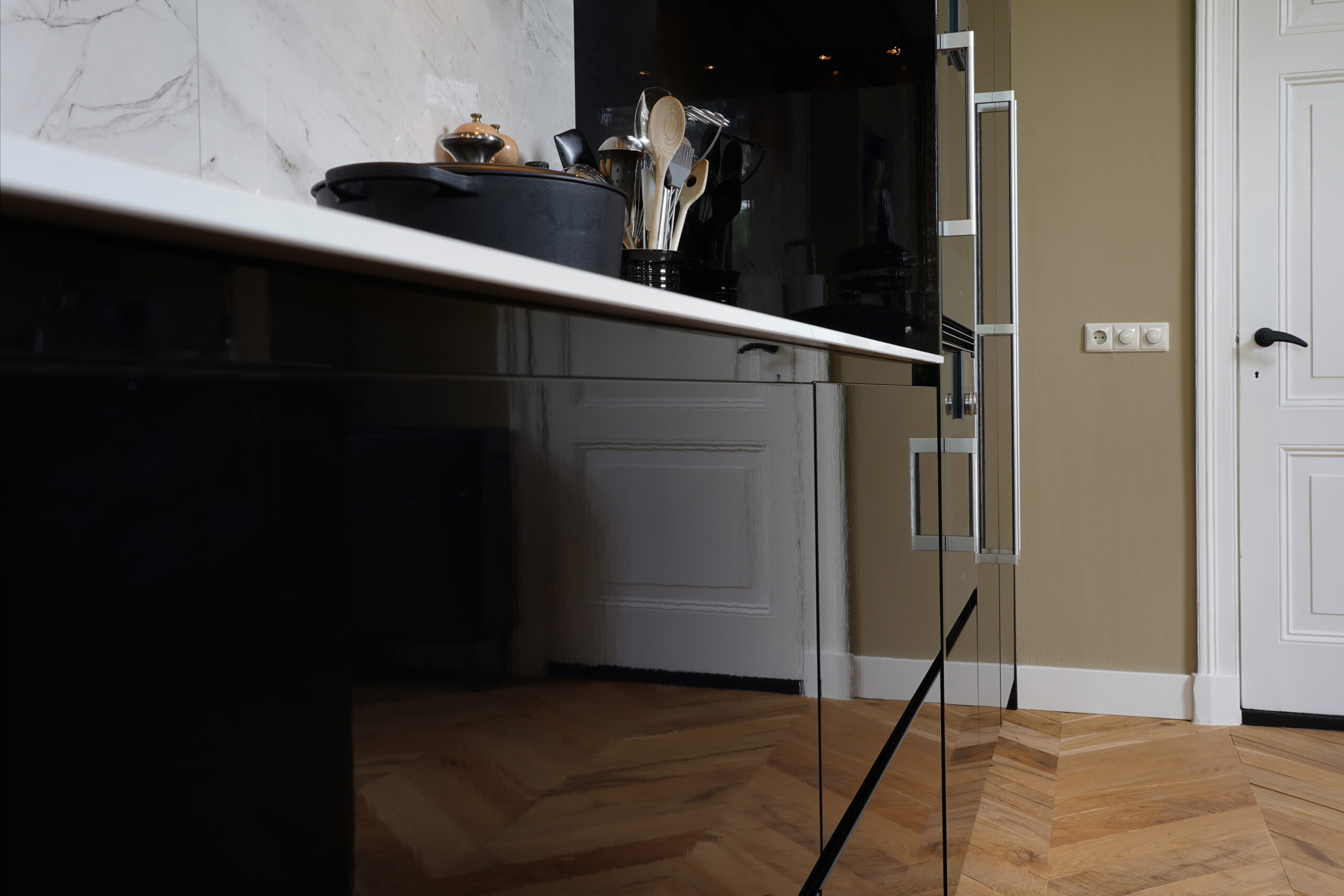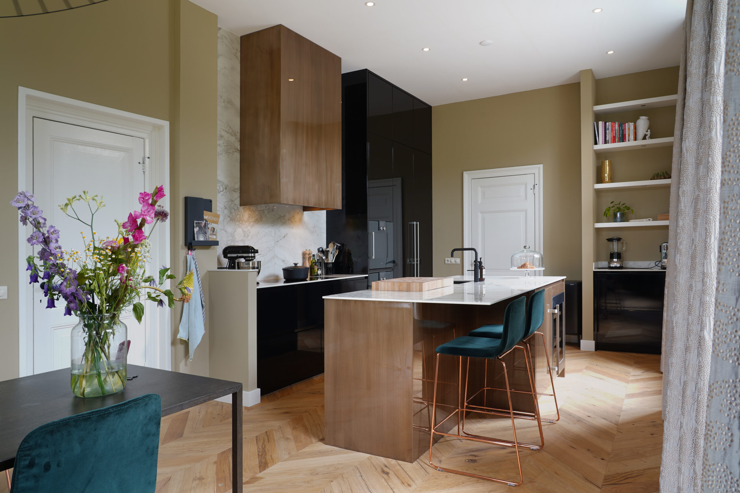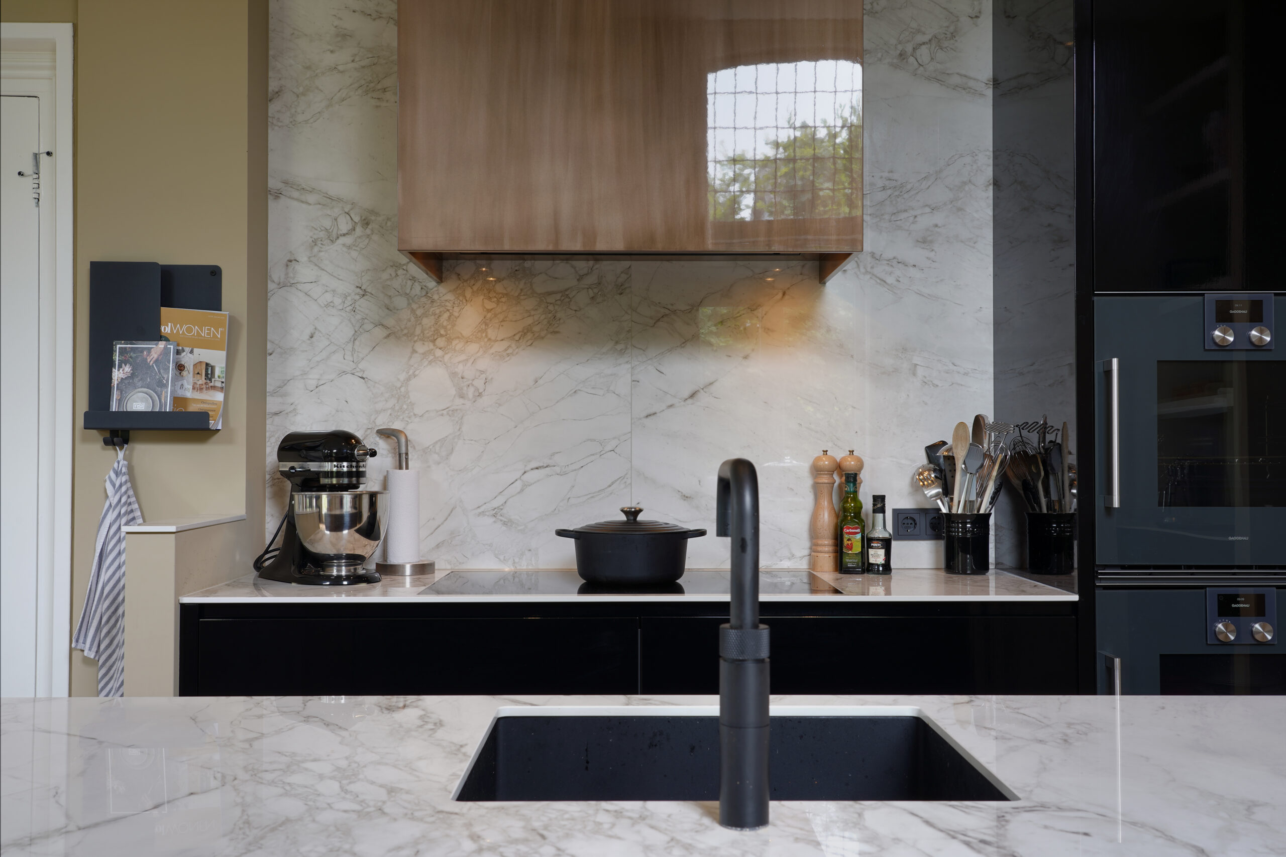 In deze mooie jaren 30 woning hebben wij deze luxe maatwerk keuken gerealiseerd. De combinatie tussen hoogglans zwart en het mooie brons kleurige metaallak maakt het een prachtkeuken! De keuken in voorzien van hi-end keukenapparatuur van het merk Gaggenau. Nog een echte eyecatcher is het Dekton werkblad en achterwand boven het kookgedeelte. Er is door de opdrachtgever gekozen voor het dekton bergen stonika xgloss werkblad uitgevoerd in 12mm dik.