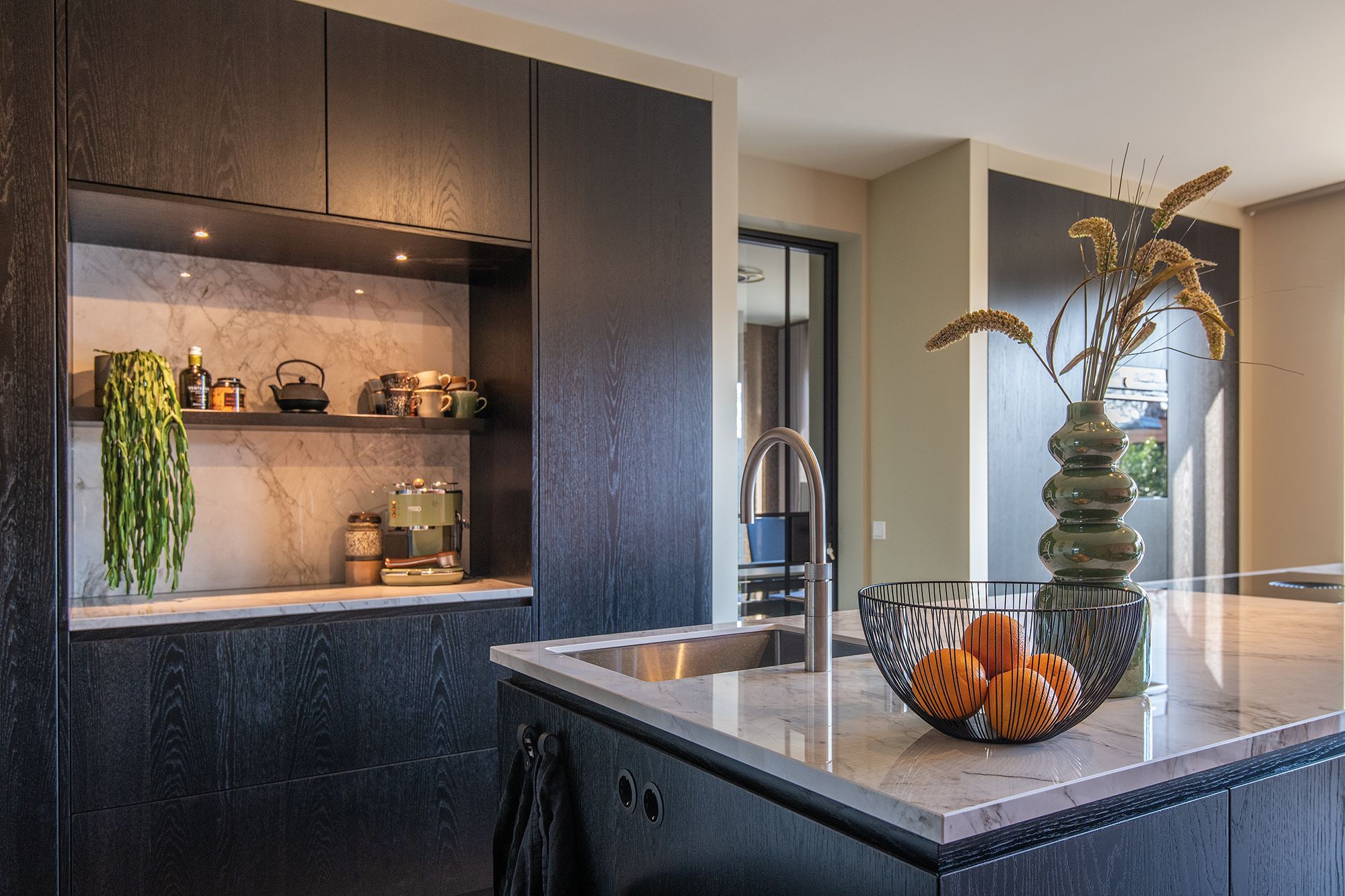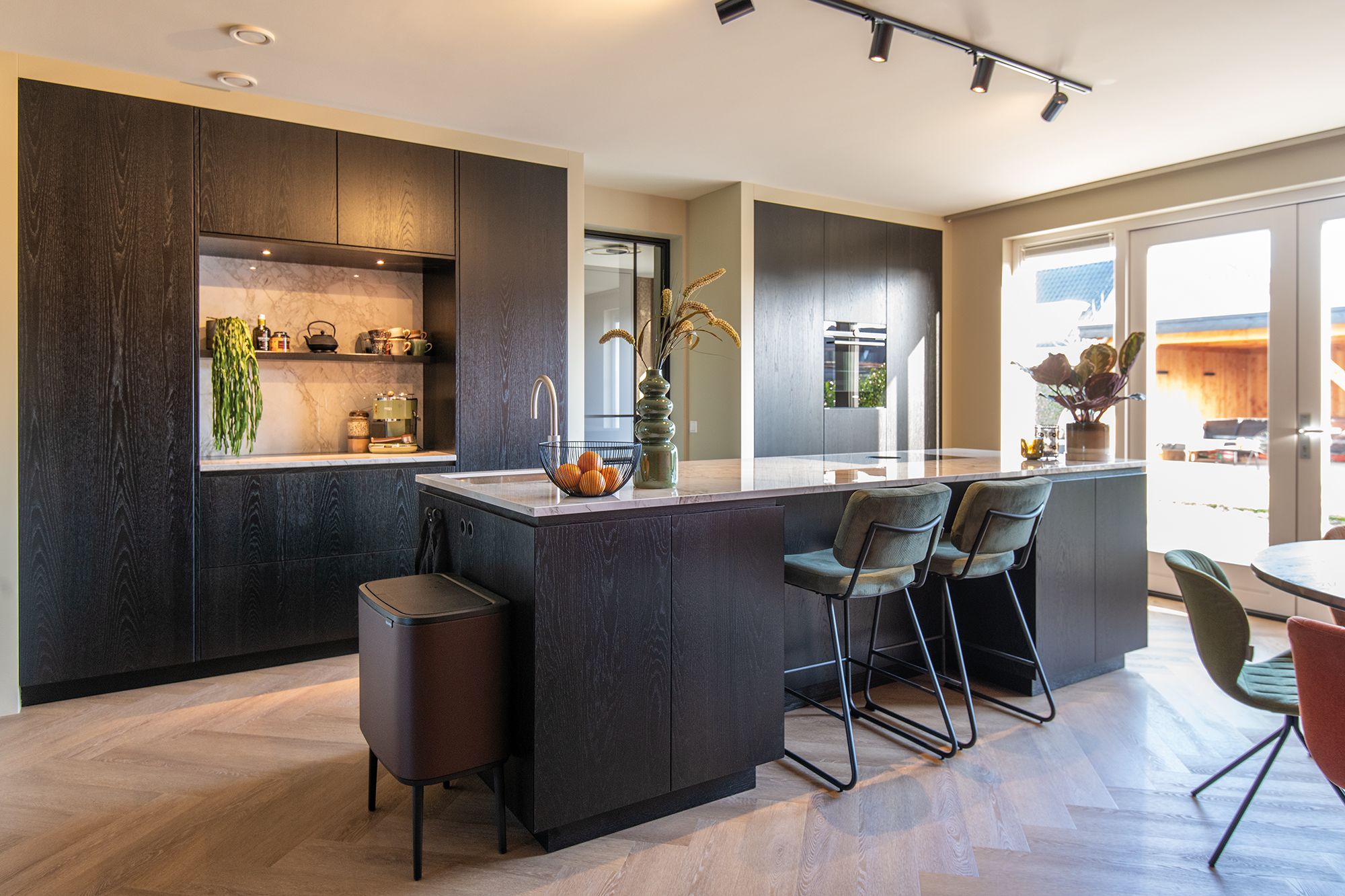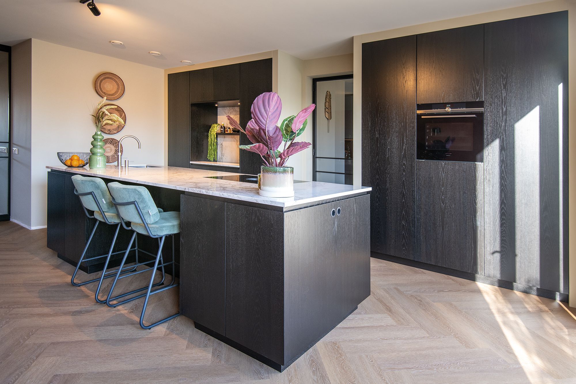 Stijlvolle handgemaakte keuken. De combinatie tussen donker eiken en het prachtige Dekton Stonika Bergen werkblad maakt deze keuken een echte eyecatcher! Het Dekton werkblad is geïnspireerd op het natuurlijke Portobello steen. Mooie licht grijze en witte aders met een hoogglans afwerking. Verder is deze maatwerk keuken voorzien van luxe snufjes zoals het Blum servo drive systeem. Dit systeem is bijvoorbeeld in te bouwen in een koelkast of vrieskast. Door op de deur te drukken wordt deze elektrisch geopend dus heb je geen handgrepen meer nodig. Benieuwd wat wij nog meer in deze woning gerealiseerd hebben? Bekijk het hier.