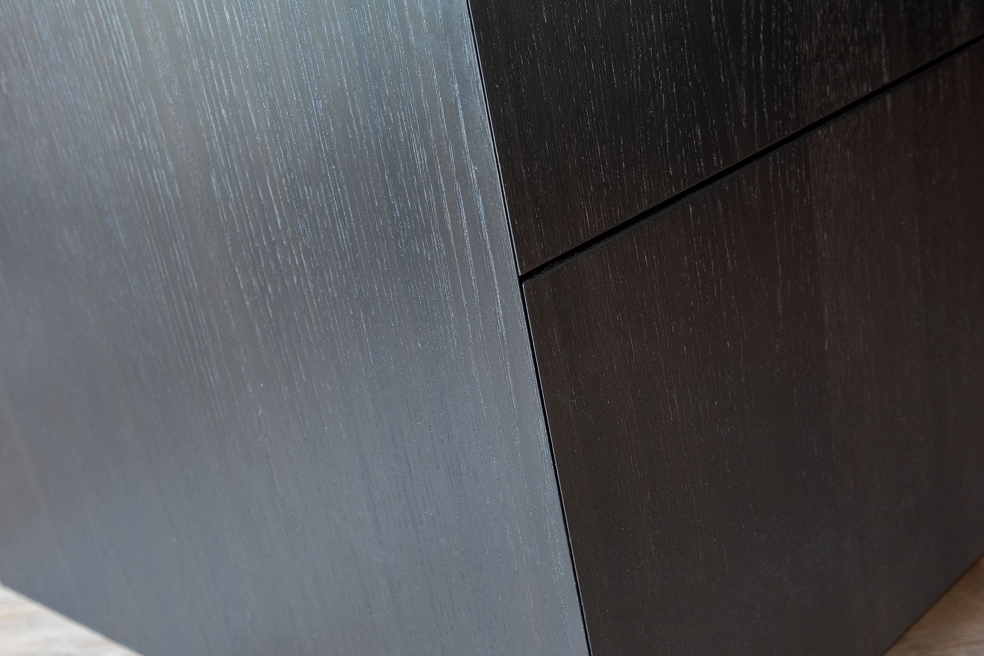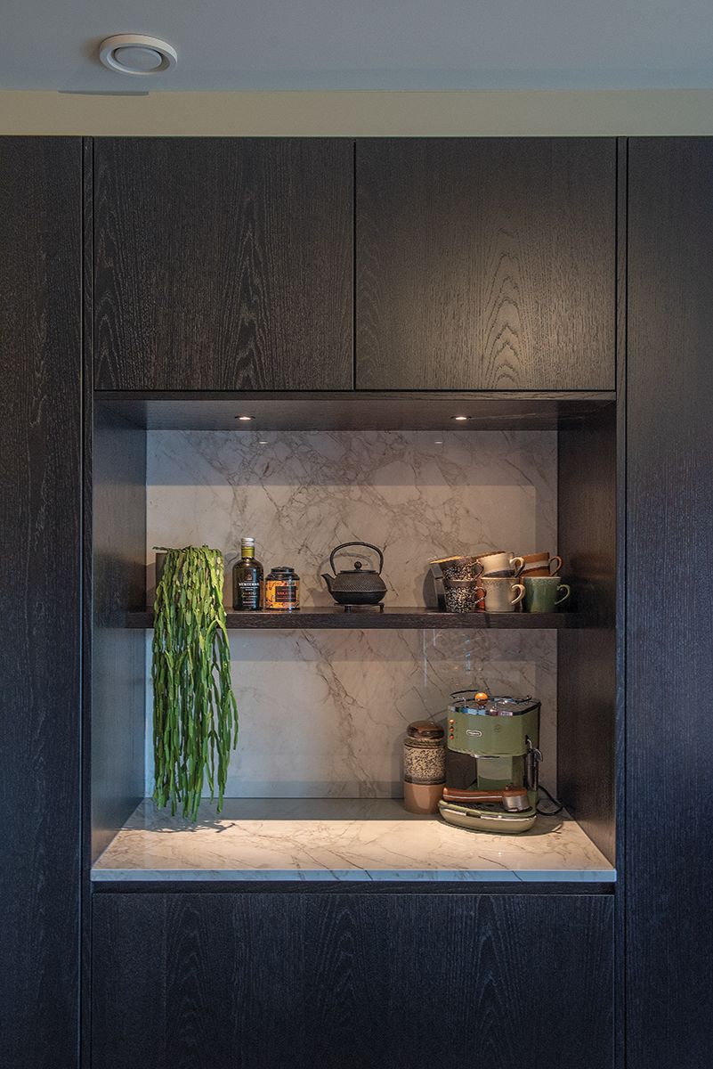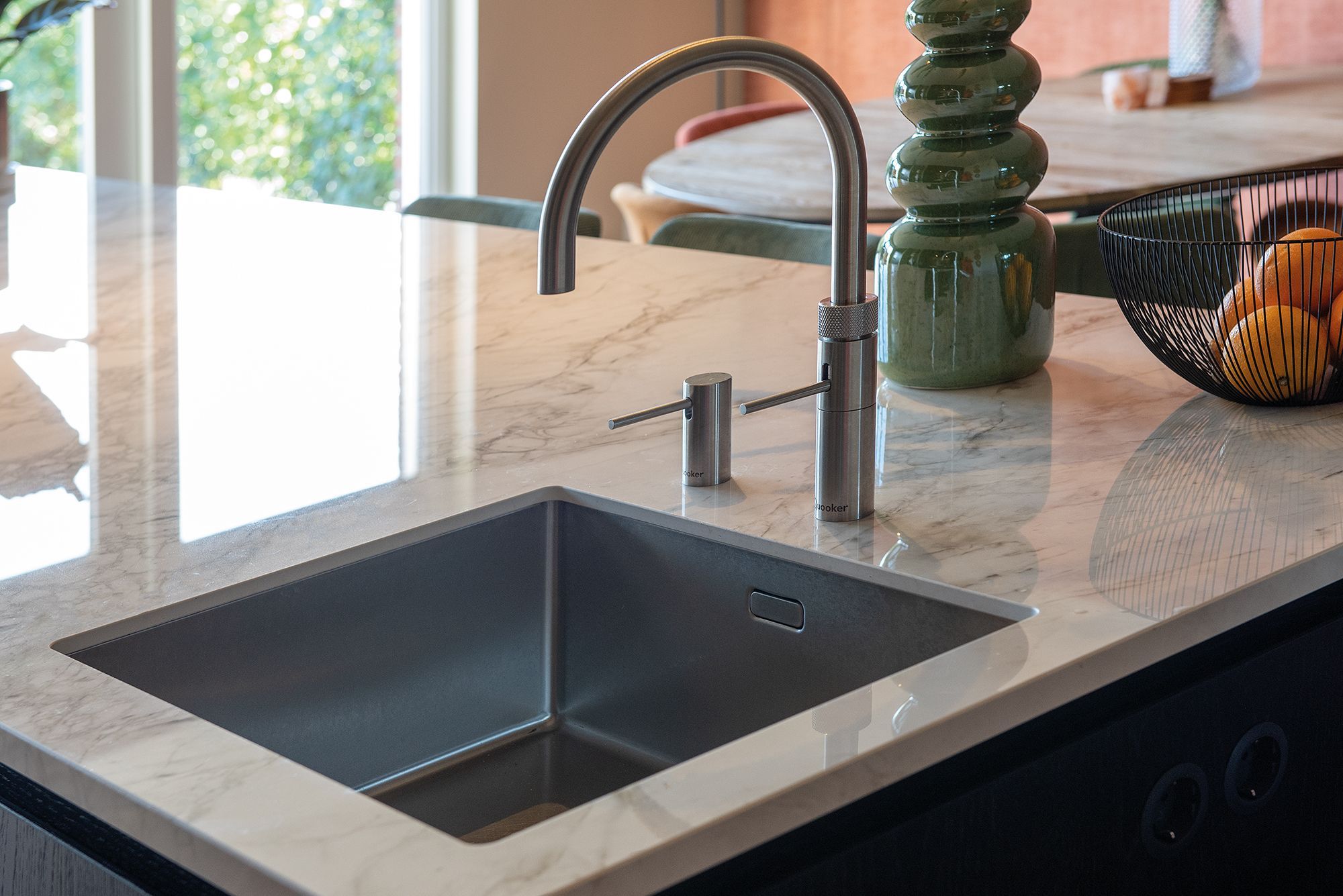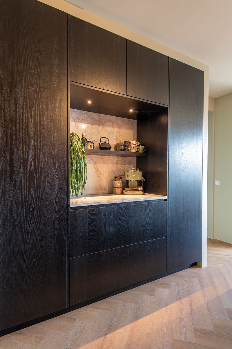 Stijlvolle handgemaakte keuken. De combinatie tussen donker eiken en het prachtige Dekton Stonika Bergen werkblad maakt deze keuken een echte eyecatcher! Het Dekton werkblad is geïnspireerd op het natuurlijke Portobello steen. Mooie licht grijze en witte aders met een hoogglans afwerking. Verder is deze maatwerk keuken voorzien van luxe snufjes zoals het Blum servo drive systeem. Dit systeem is bijvoorbeeld in te bouwen in een koelkast of vrieskast. Door op de deur te drukken wordt deze elektrisch geopend dus heb je geen handgrepen meer nodig. Benieuwd wat wij nog meer in deze woning gerealiseerd hebben? Bekijk het hier.