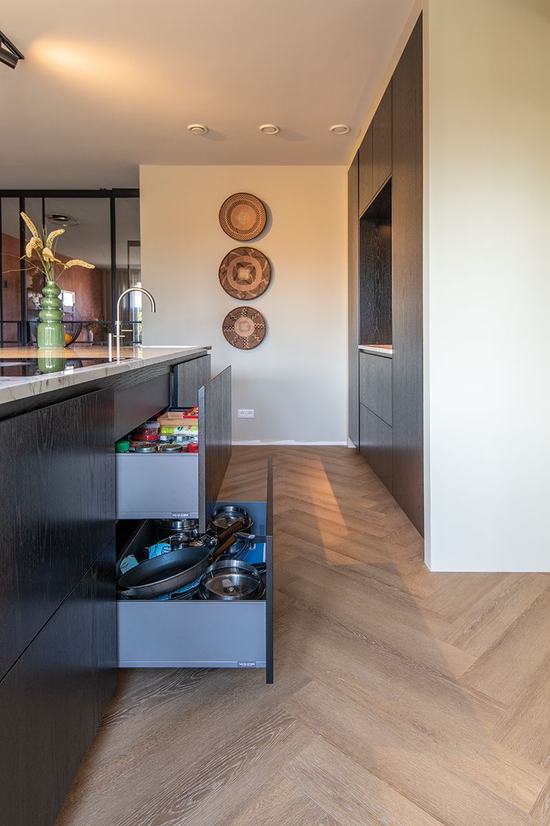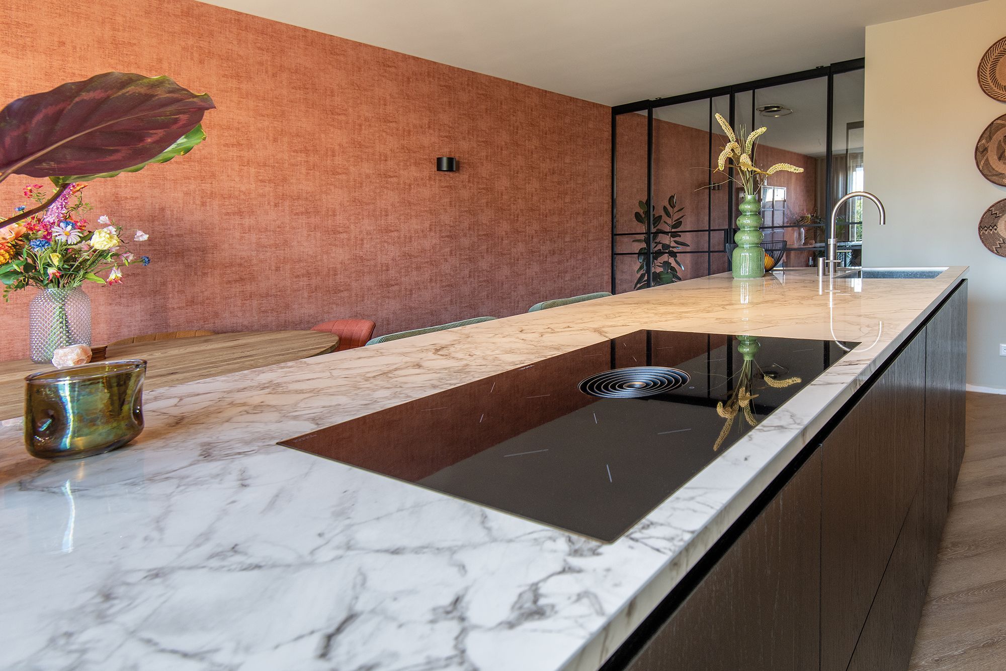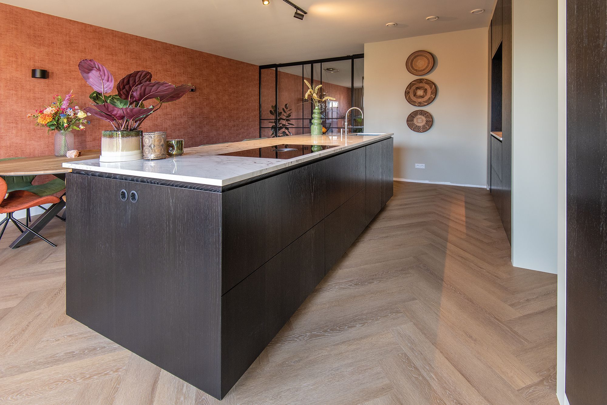 Bij deze keuken hebben we het keukeneiland greeploos uitgevoerd. Dit doen wij bij van de Scheur keukens & interieurs doormiddel van de bovenzijde van de deuren op 45 graden af te schuinen. De greeplijst achter de deur maken wij van hetzelfde materiaal als de keukenfronten zodat deze zo min mogelijk op valt.
