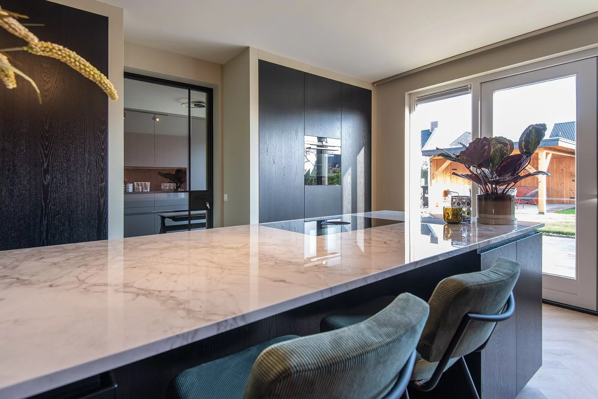 Bij deze keuken hebben we het keukeneiland greeploos uitgevoerd. Dit doen wij bij van de Scheur keukens & interieurs doormiddel van de bovenzijde van de deuren op 45 graden af te schuinen. De greeplijst achter de deur maken wij van hetzelfde materiaal als de keukenfronten zodat deze zo min mogelijk op valt.