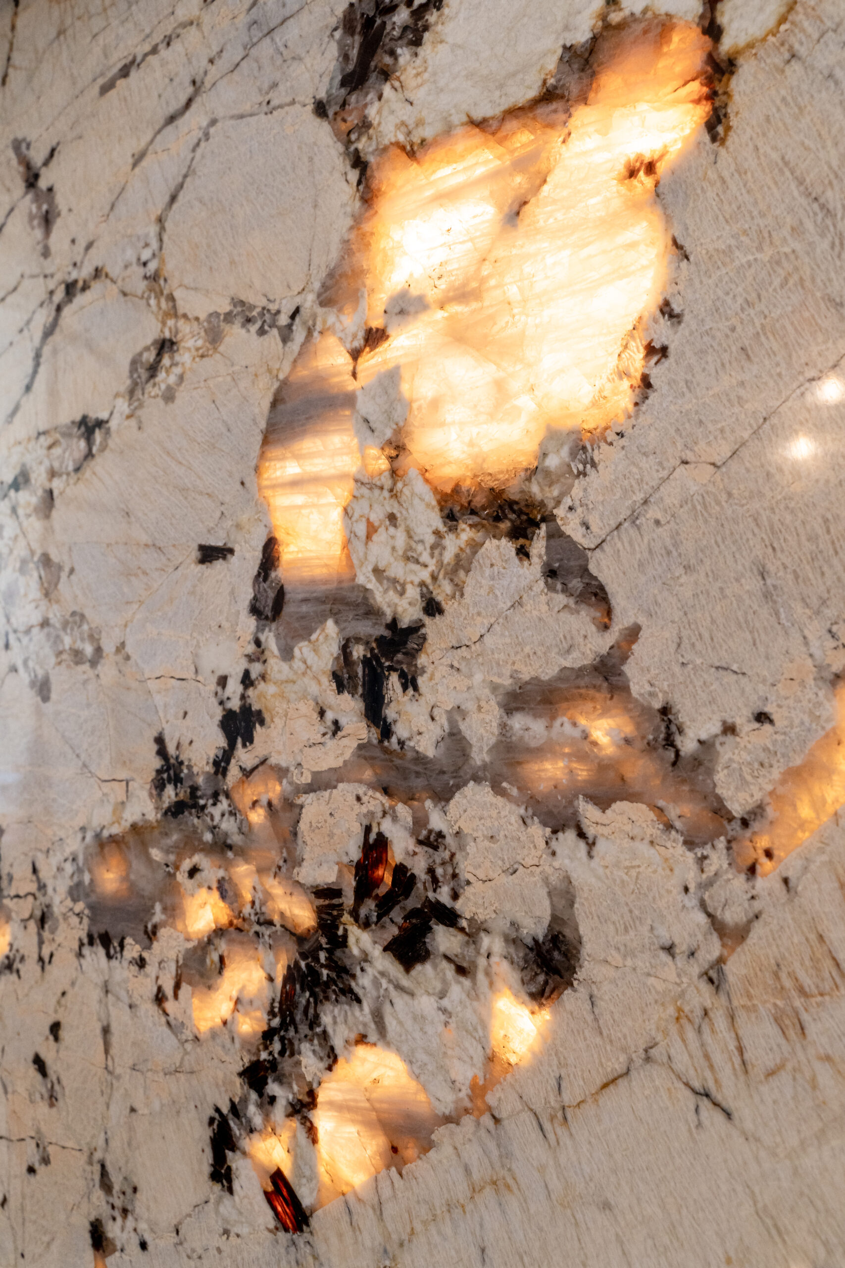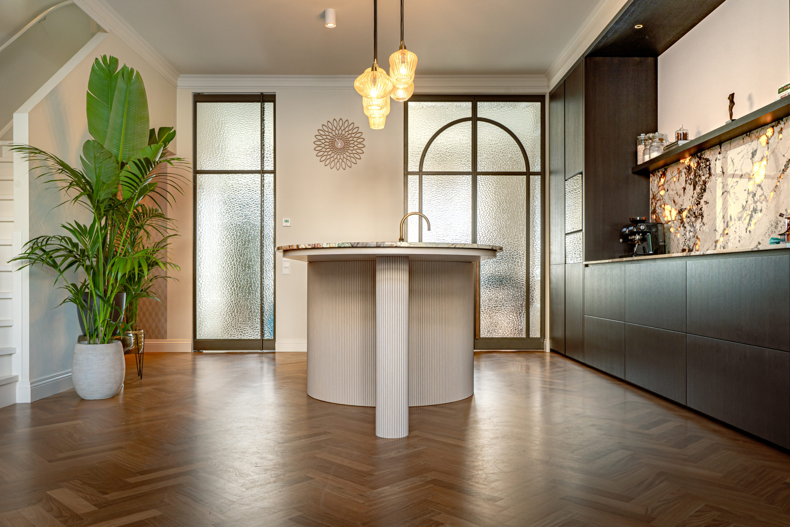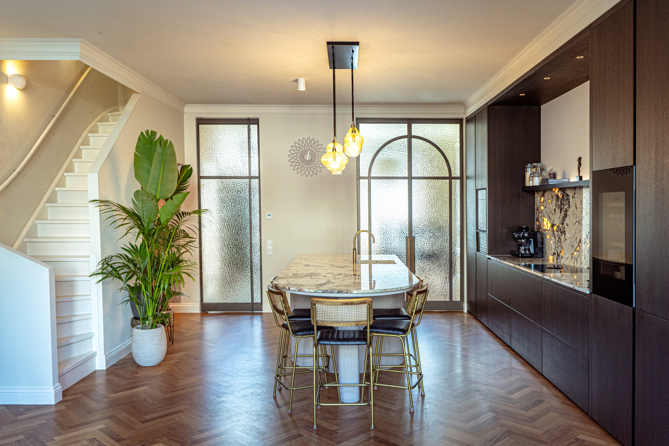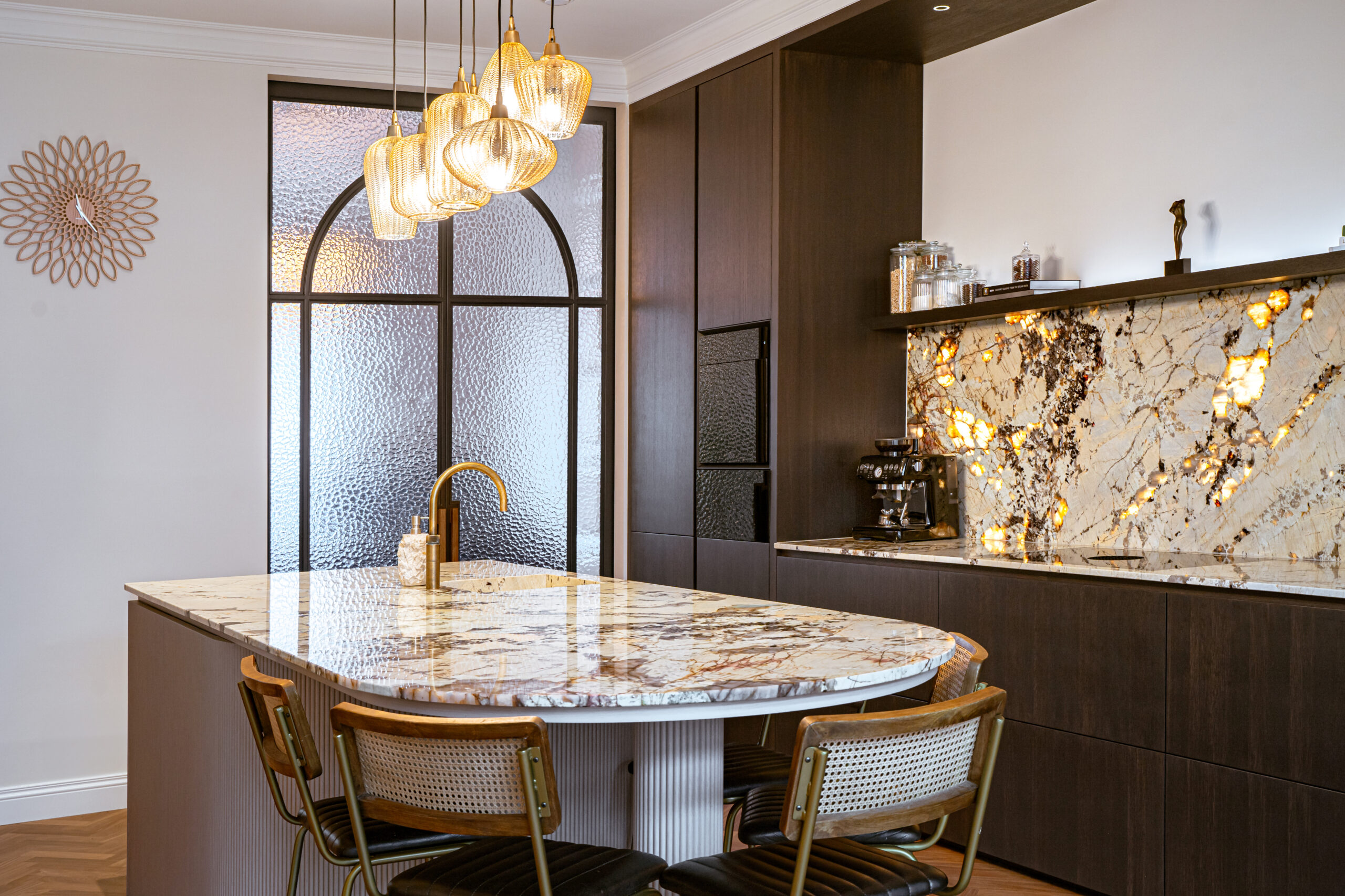 Het absolute pronkstuk van deze keuken is echter het kwartsiet Patagonia werkblad. Dit unieke natuursteen heeft een prachtig, organisch patroon met diepe kleuren en aderen die variëren van crème tot donkerbruin, en soms zelfs hints van goud bevatten. Dit maakt elk werkblad een kunstwerk op zich. Bovendien is de achterwand van hetzelfde kwartsiet gemaakt, maar met een twist: deze achterwand is licht doorlatend, waardoor je met achtergrondverlichting een magisch effect creëert. Wanneer het licht door de stenen schijnt, komen de natuurlijke patronen nog sterker tot hun recht en krijgt de keuken een extra dimensie, vooral in de avonduren.