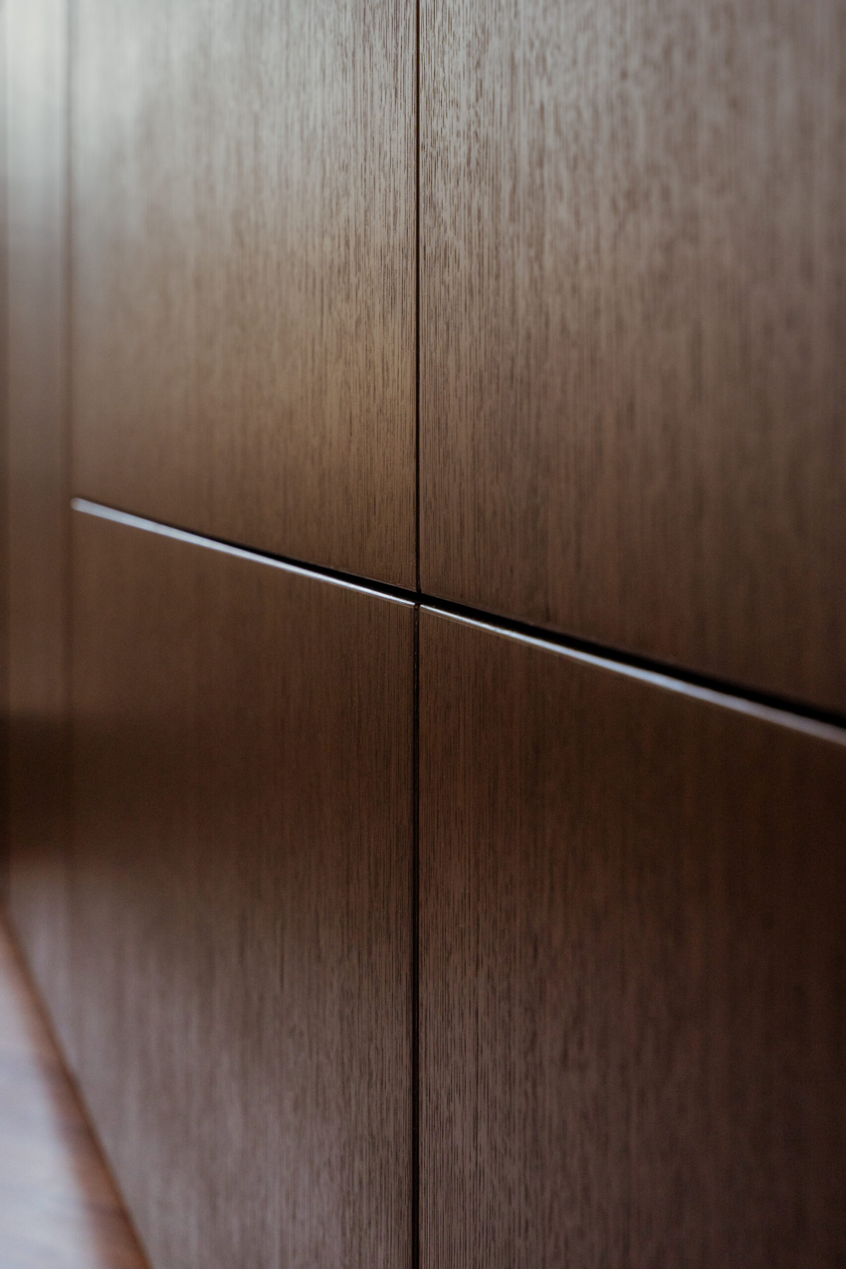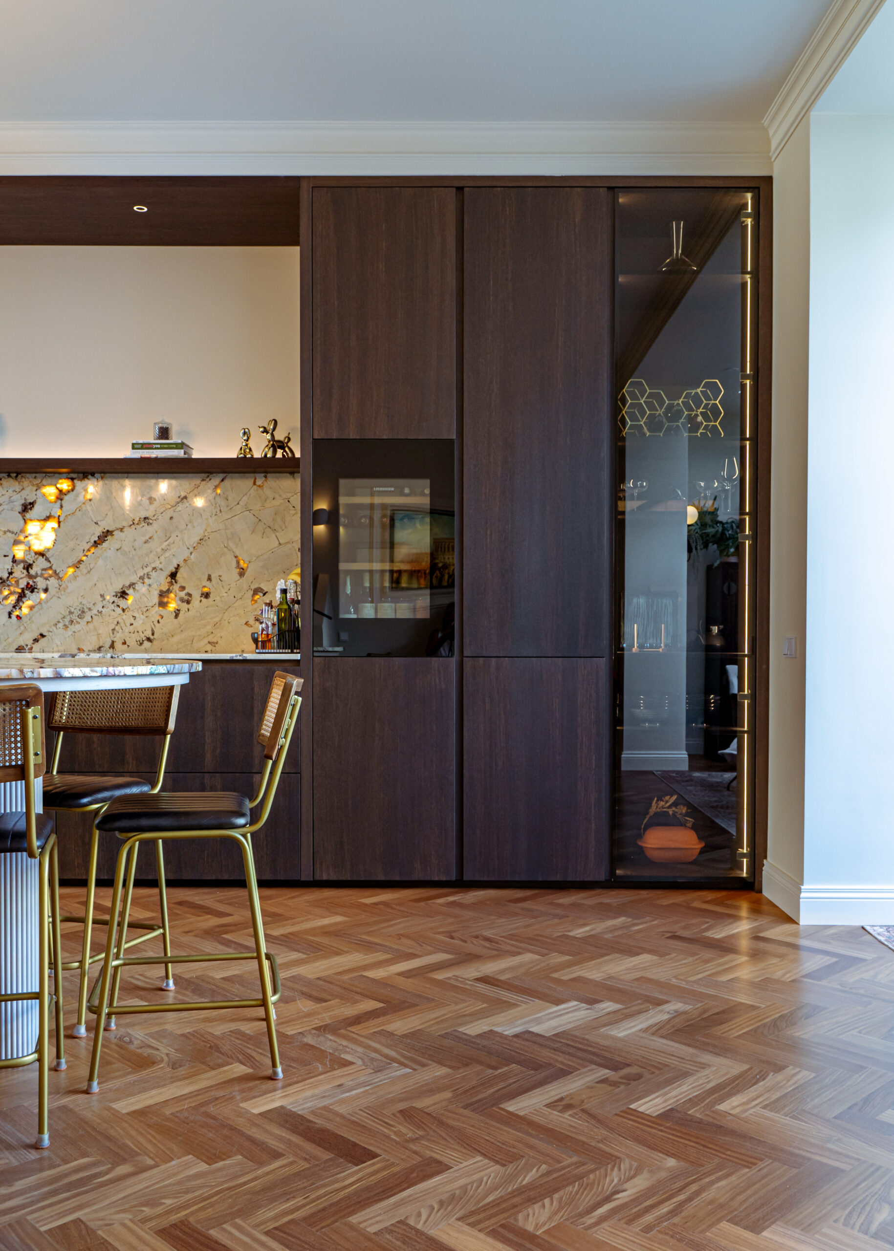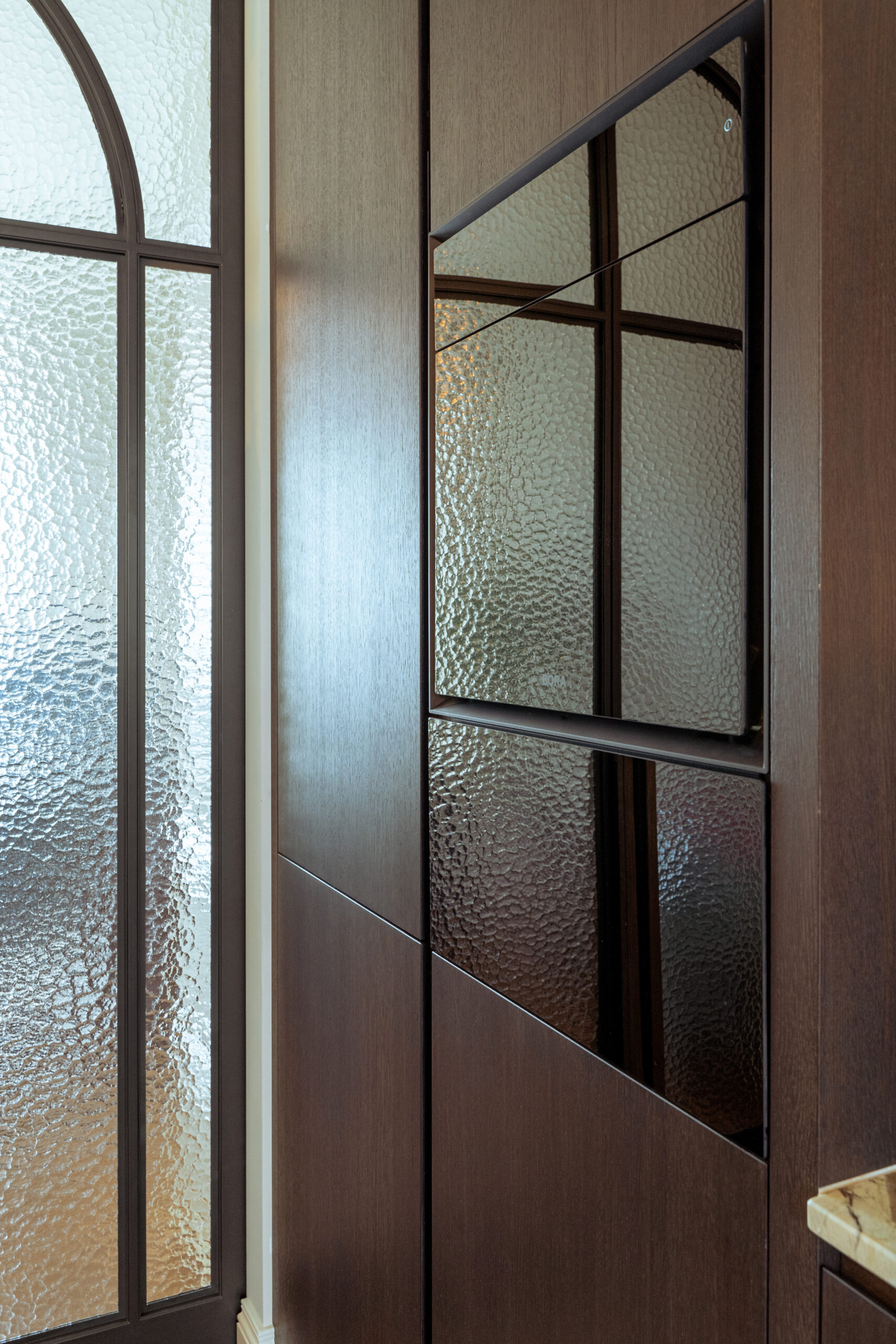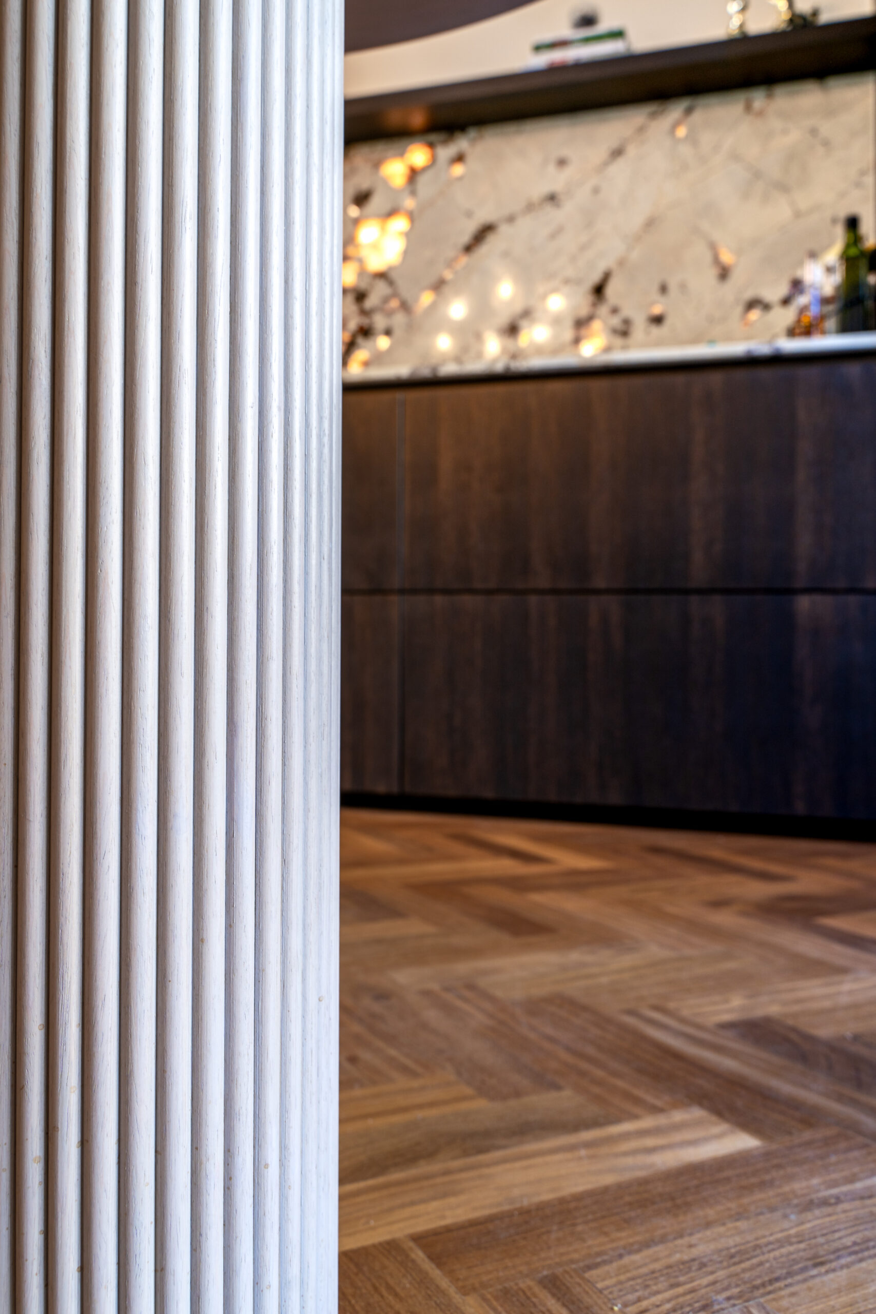 Deze op maat gemaakte hotel chique keuken biedt de perfecte balans tussen elegantie en functionaliteit. Deze stijlvolle keuken combineert bruin gebeitst eikenhout met een verfijnde touch van 4-design ronde latjes, wat het geheel een moderne en warme uitstraling geeft. Het hout is zorgvuldig afgewerkt en brengt een natuurlijke charme in de ruimte, terwijl de latjes een eigentijds en speels accent toevoegen. Het gebruik van bruin gebeitst eiken zorgt daarnaast voor een solide basis die niet alleen visueel aantrekkelijk is, maar ook duurzaamheid en kwaliteit uitstraalt.