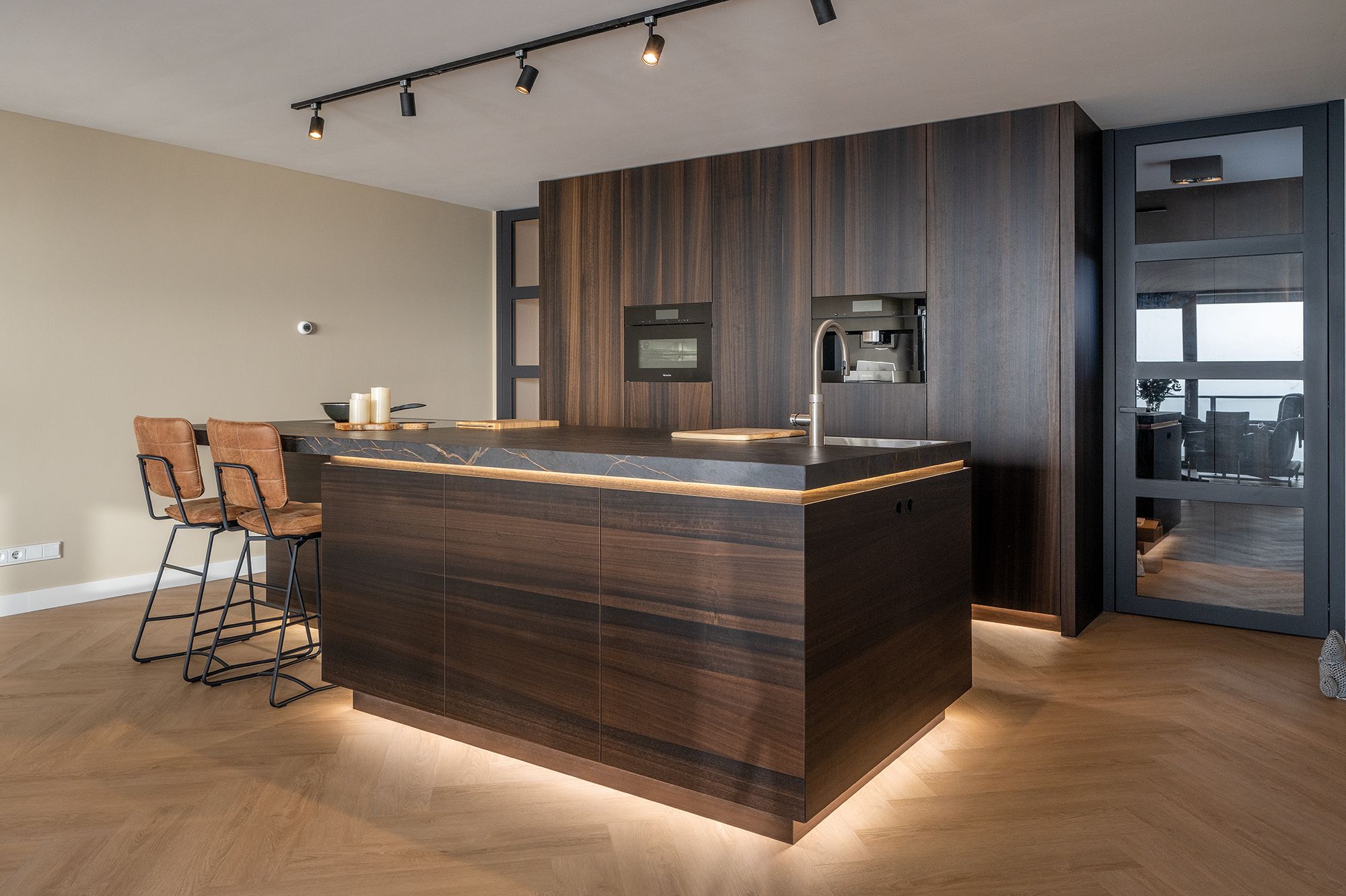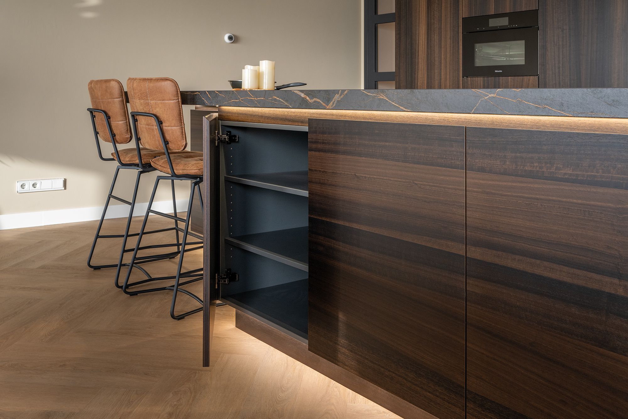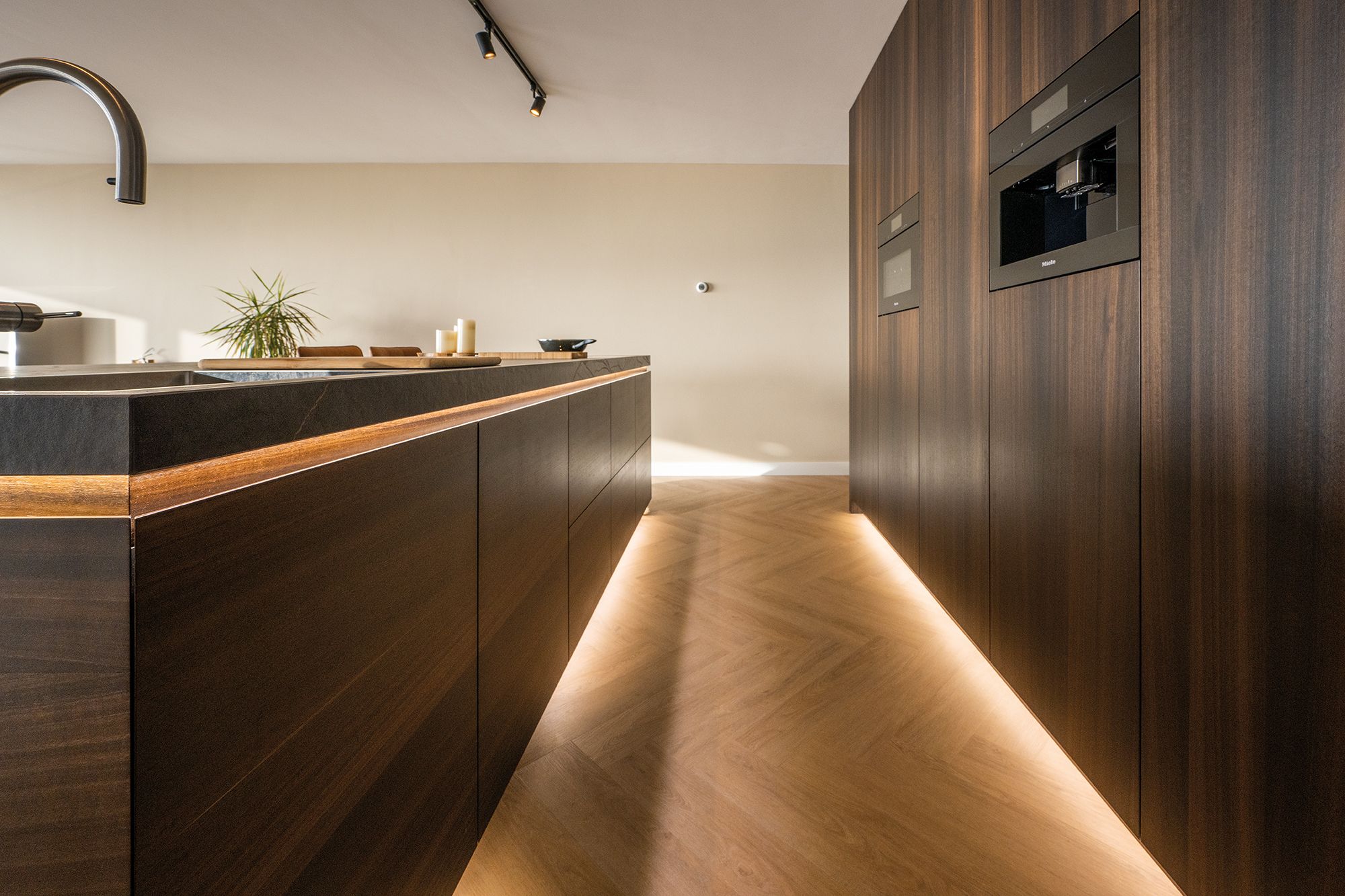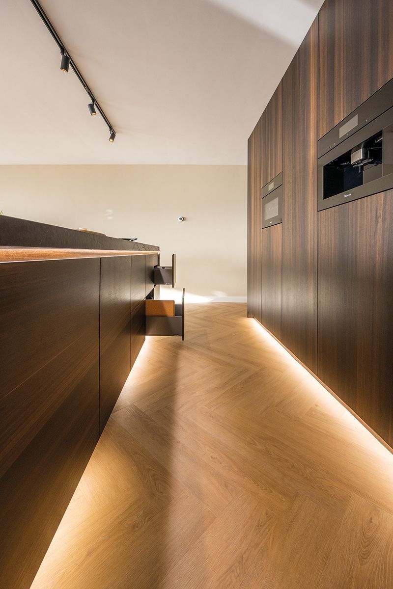 Een keer wat anders dan eiken hout. Deze opdrachtgevers hebben gekozen voor Eucalyptus hout. Een prachtige warme en rustige houtsoort uit zuid Europa. Voor de apparatenwand is er gekozen voor een staande structuur en voor het keukeneiland voor een liggende structuur. Het werkblad is van het merk Dekton. Deze Dekton kleur genaamd Laurent heeft een donkere basis. In het blad zitten mooie gouden aders verwerkt. De kleur is gebaseerd op de natuursteen Port Laurent. Aan de onderzijde van het werkblad en aan de bovenzijde van de plint is er ledverlichting verwerkt. Dit geeft een extra sfeervolle uitstraling aan de maatwerk keuken.