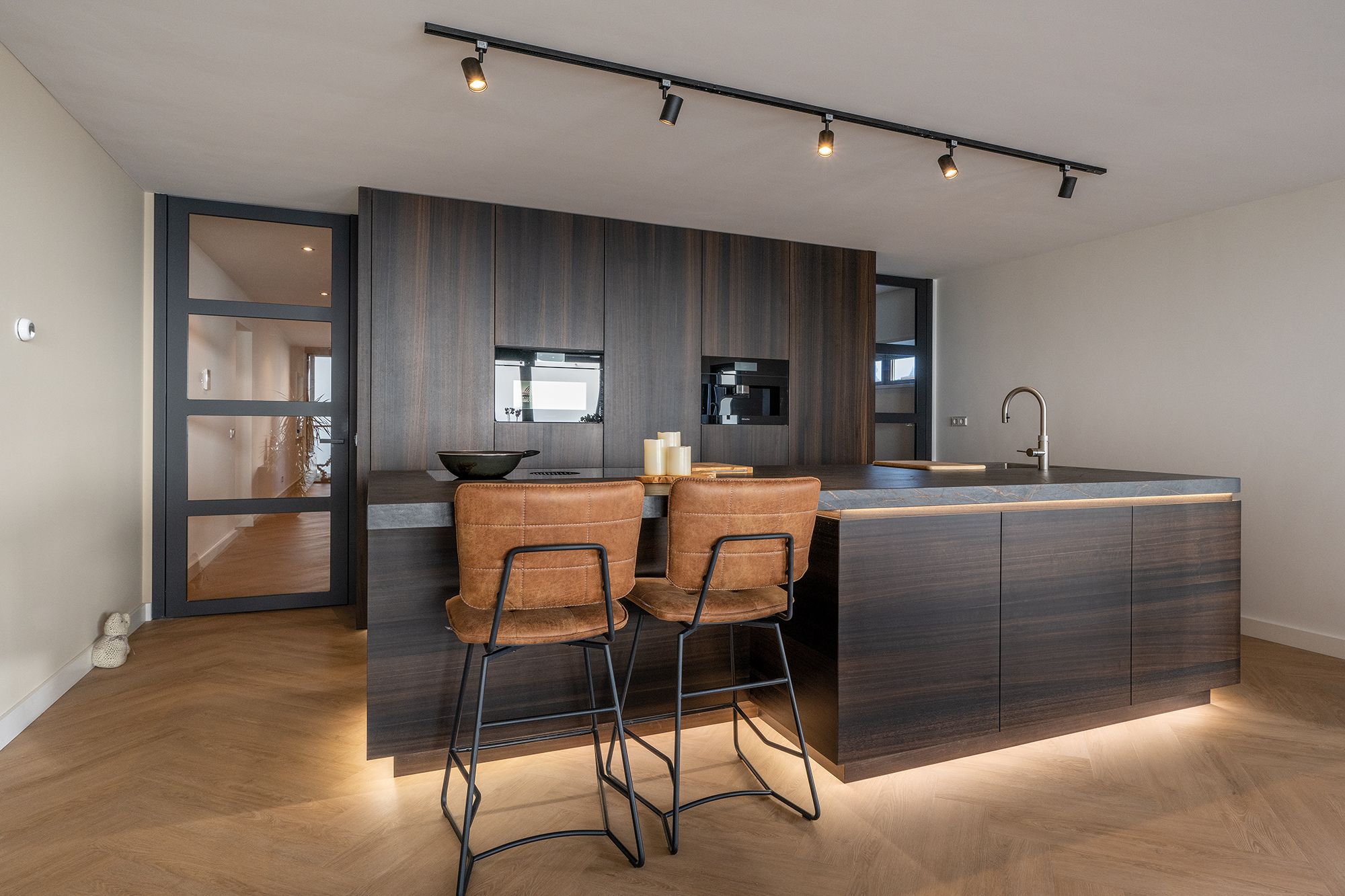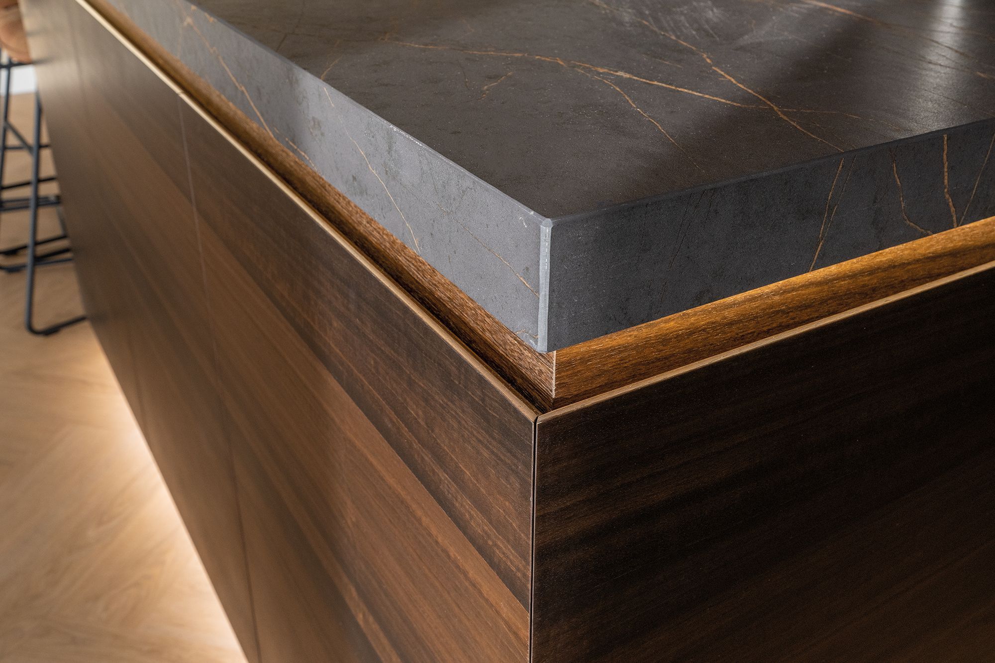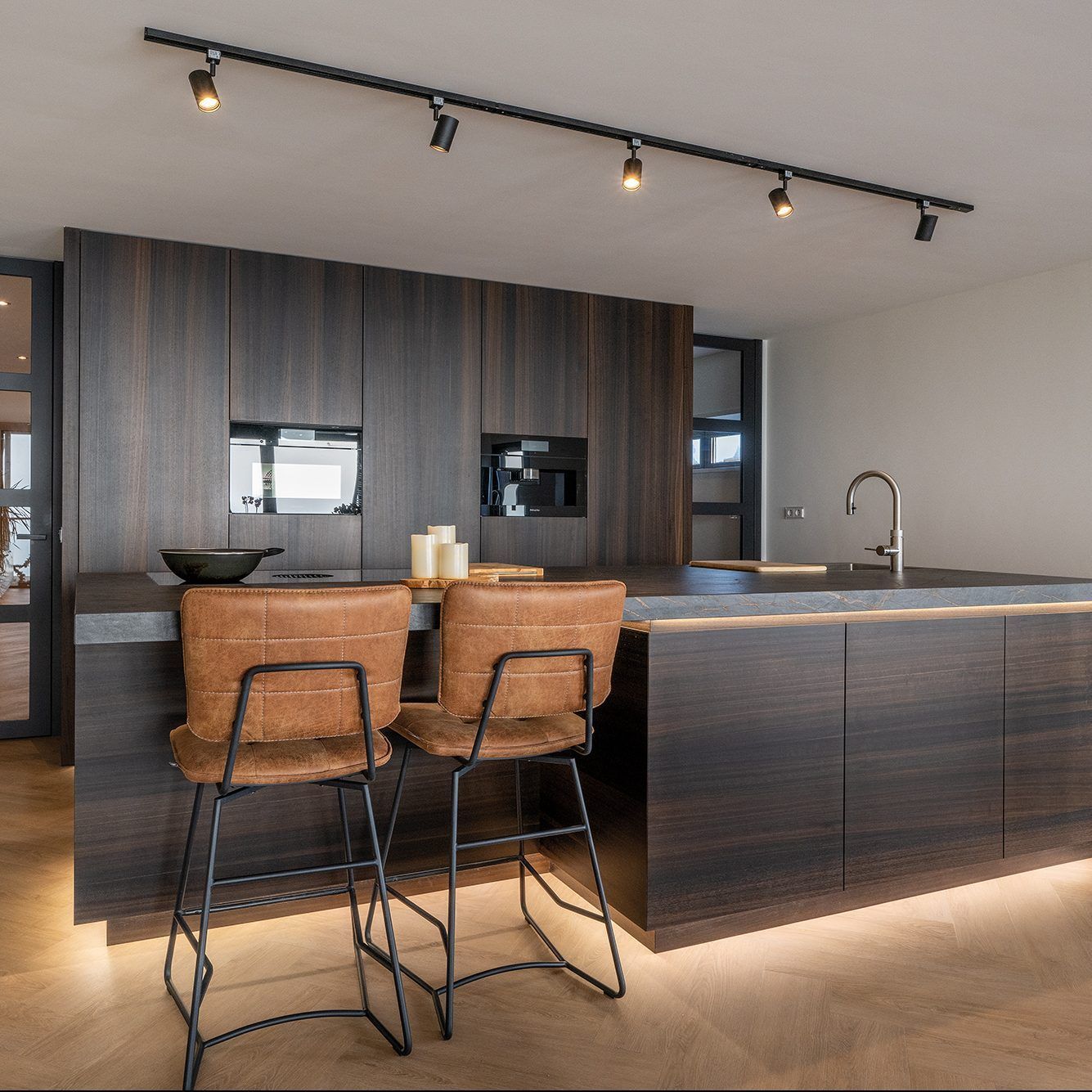 Een keer wat anders dan eiken hout. Deze opdrachtgevers hebben gekozen voor Eucalyptus hout. Een prachtige warme en rustige houtsoort uit zuid Europa. Voor de apparatenwand is er gekozen voor een staande structuur en voor het keukeneiland voor een liggende structuur. Het werkblad is van het merk Dekton. Deze Dekton kleur genaamd Laurent heeft een donkere basis. In het blad zitten mooie gouden aders verwerkt. De kleur is gebaseerd op de natuursteen Port Laurent. Aan de onderzijde van het werkblad en aan de bovenzijde van de plint is er ledverlichting verwerkt. Dit geeft een extra sfeervolle uitstraling aan de maatwerk keuken.