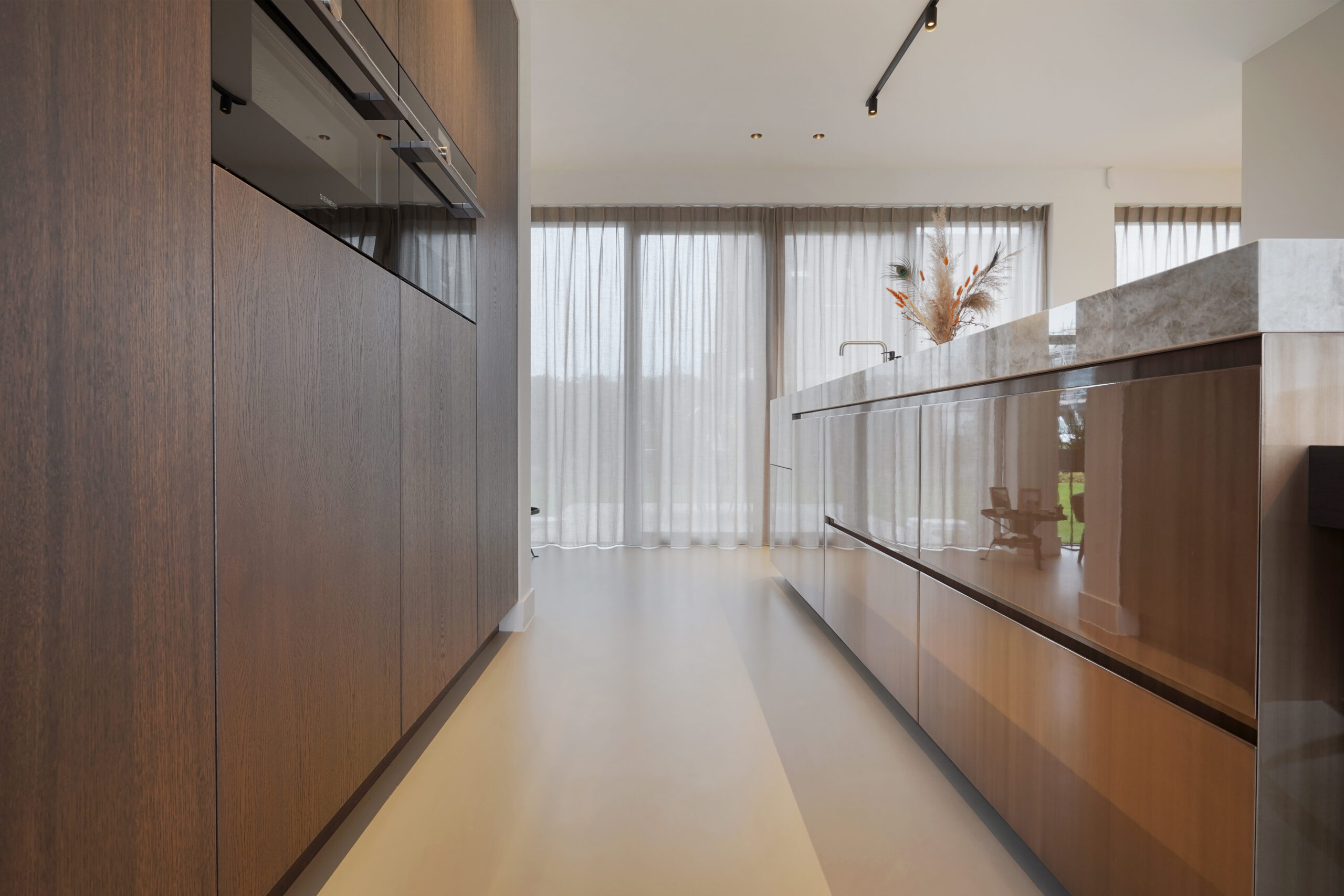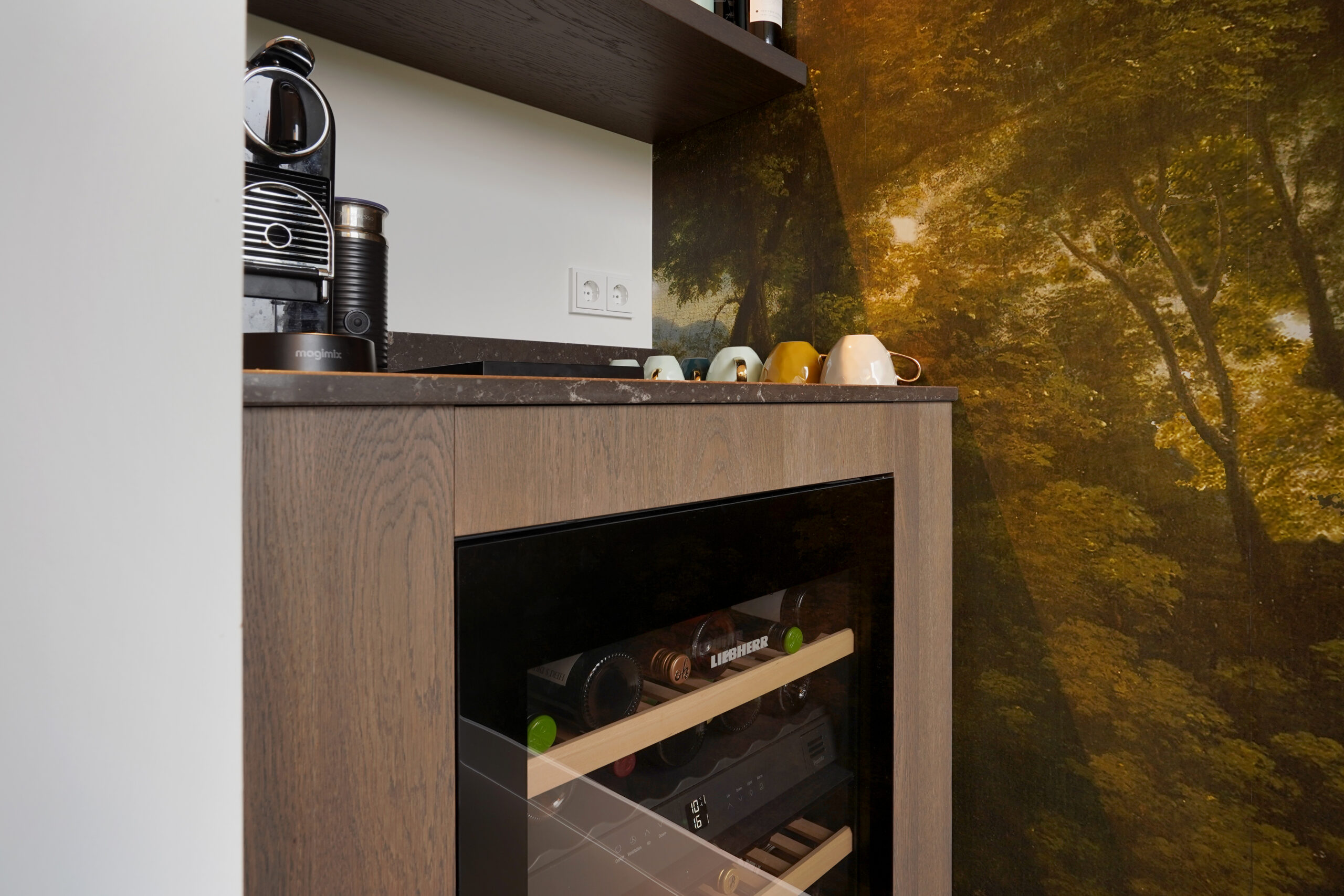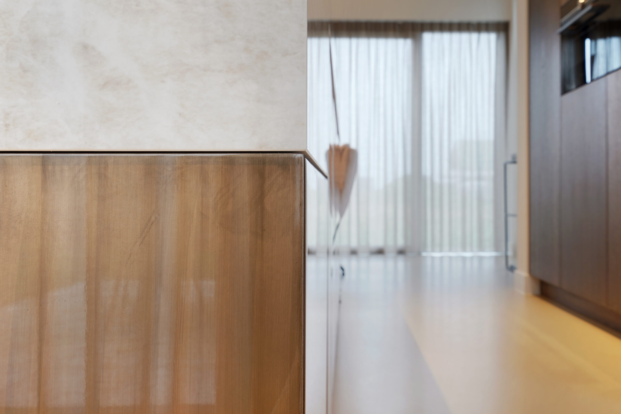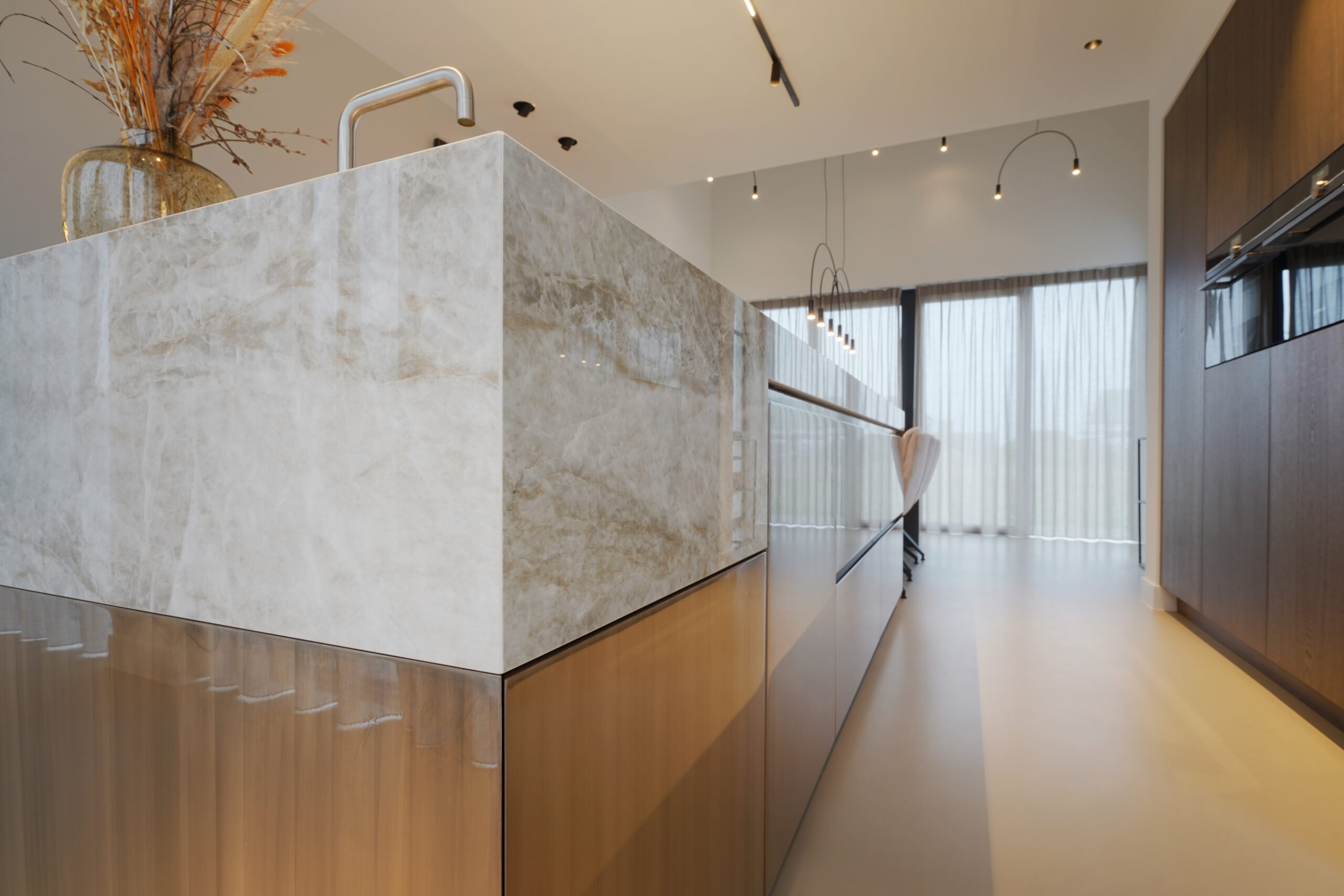 Deze elegante keuken is zeer stijlvol samengesteld in samenspraak met de opdrachtgever. De deuren van de apparatenwand zijn gemaakt van eiken gefineerd mdf. Er is gekozen voor een dosse fineer. Dit betekend dat het eiken fineer een gevlamde tekening heeft. Het keukeneiland is gemaakt van vochtwerend mdf. Het mdf is behandeld met een speciale verometaal lak in een brons kleur. Verometaal is een lak wat bestaat uit echte metaal deeltjes. Dit is prachtig om te zien! Verder is er gekozen voor een Dekton werkblad. Het bijzondere model van het werkblad geeft een extra luxe uitstraling aan de keuken.