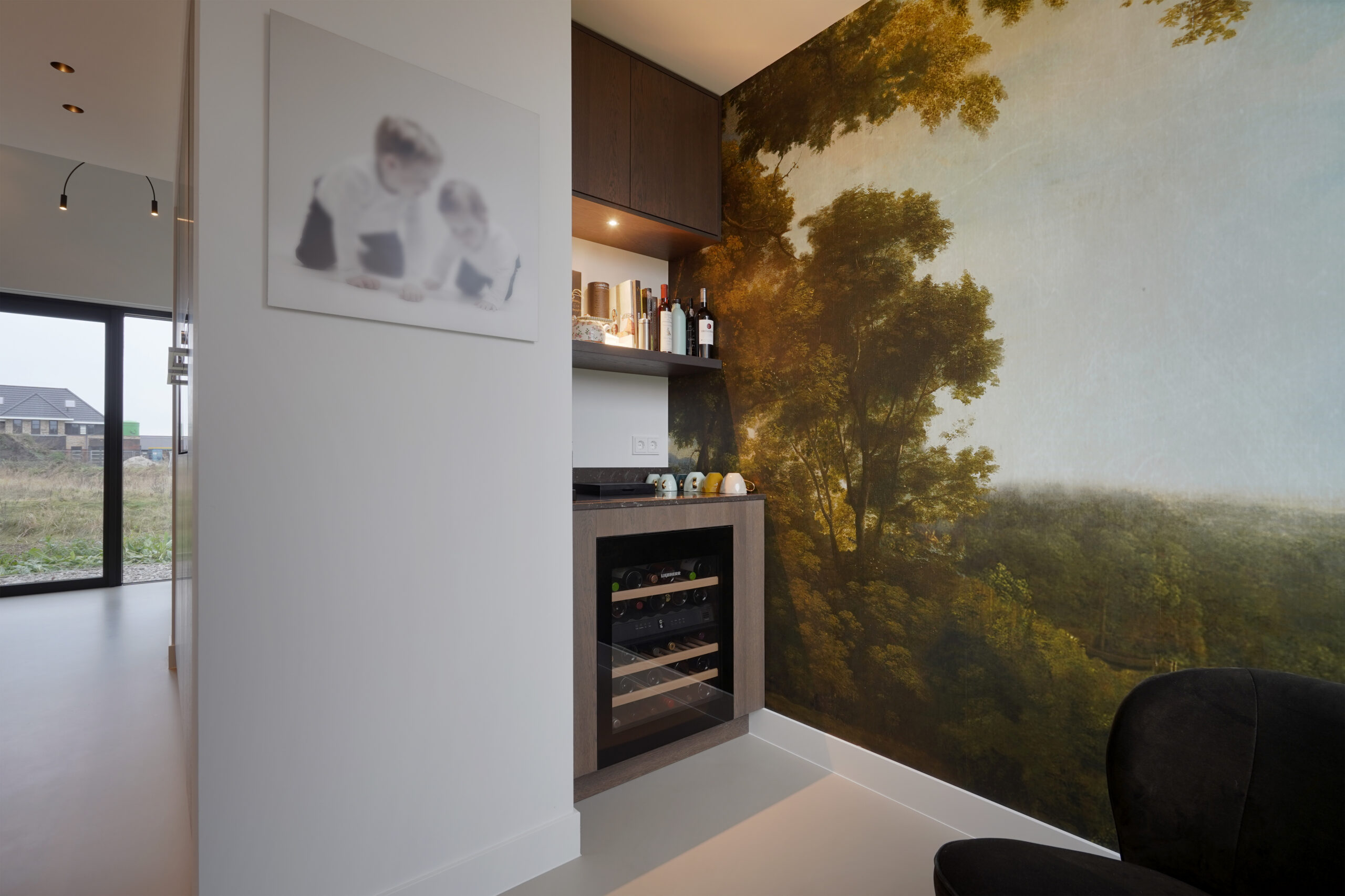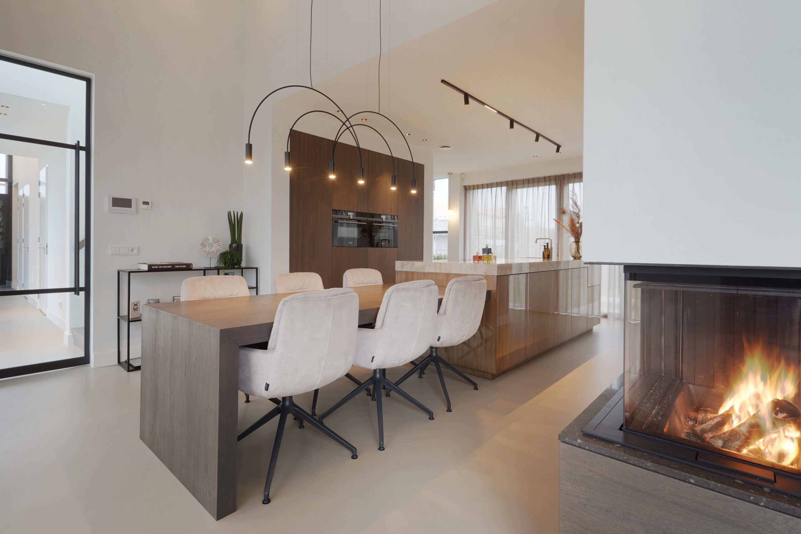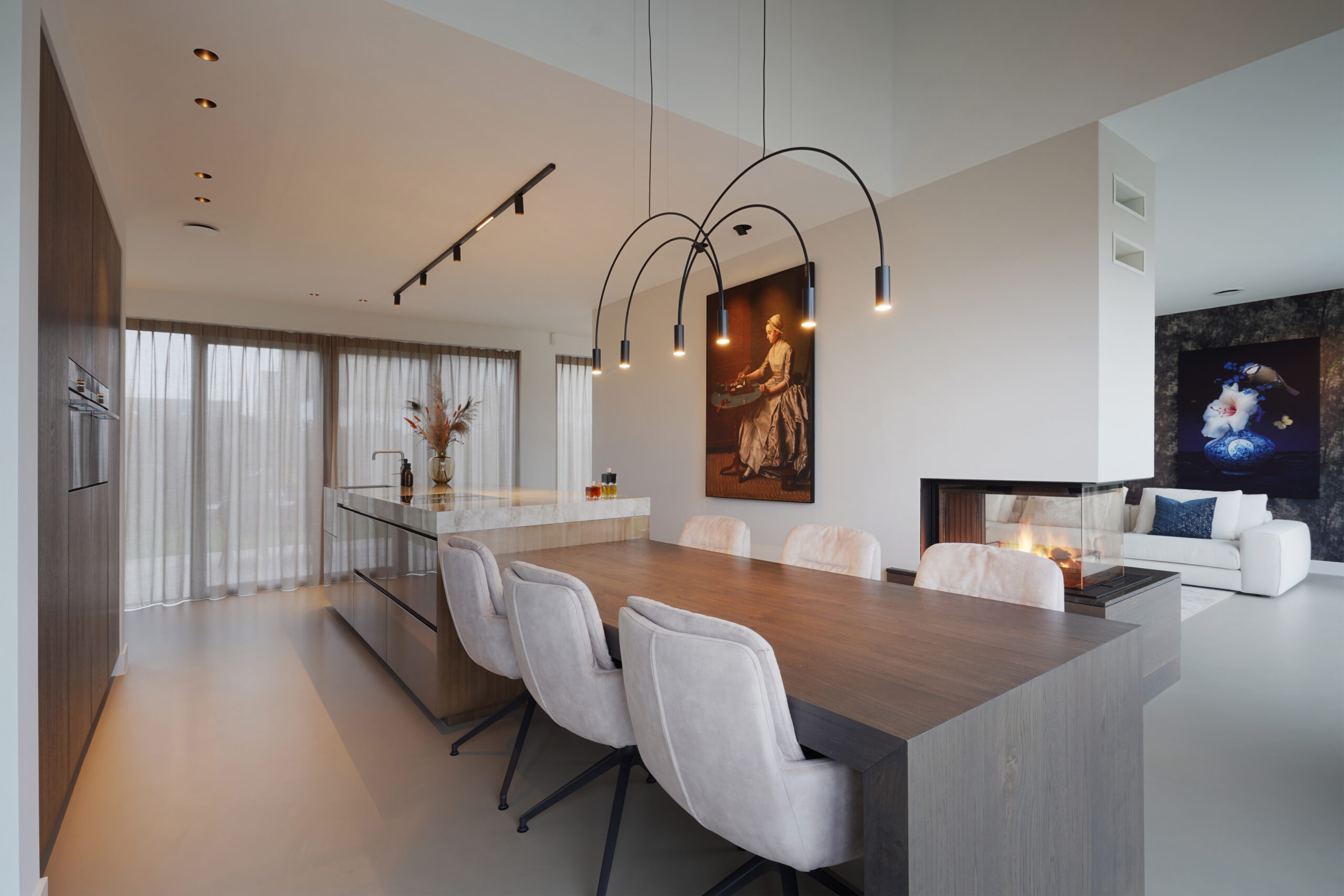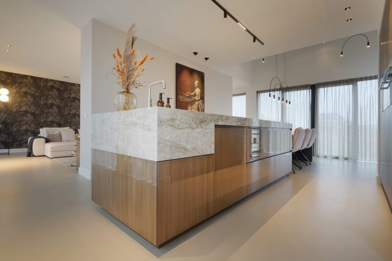 Deze elegante keuken is zeer stijlvol samengesteld in samenspraak met de opdrachtgever. De deuren van de apparatenwand zijn gemaakt van eiken gefineerd mdf. Er is gekozen voor een dosse fineer. Dit betekend dat het eiken fineer een gevlamde tekening heeft. Het keukeneiland is gemaakt van vochtwerend mdf. Het mdf is behandeld met een speciale verometaal lak in een brons kleur. Verometaal is een lak wat bestaat uit echte metaal deeltjes. Dit is prachtig om te zien! Verder is er gekozen voor een Dekton werkblad. Het bijzondere model van het werkblad geeft een extra luxe uitstraling aan de keuken.