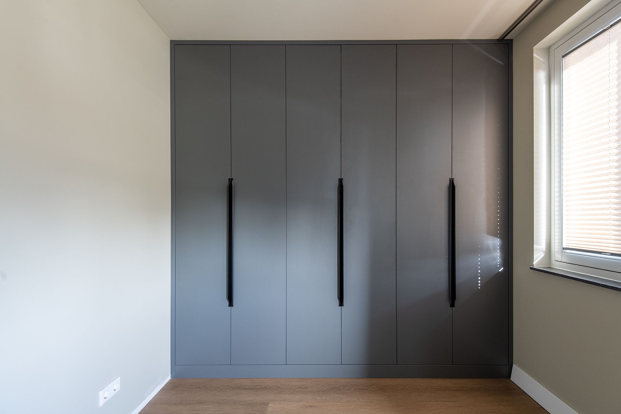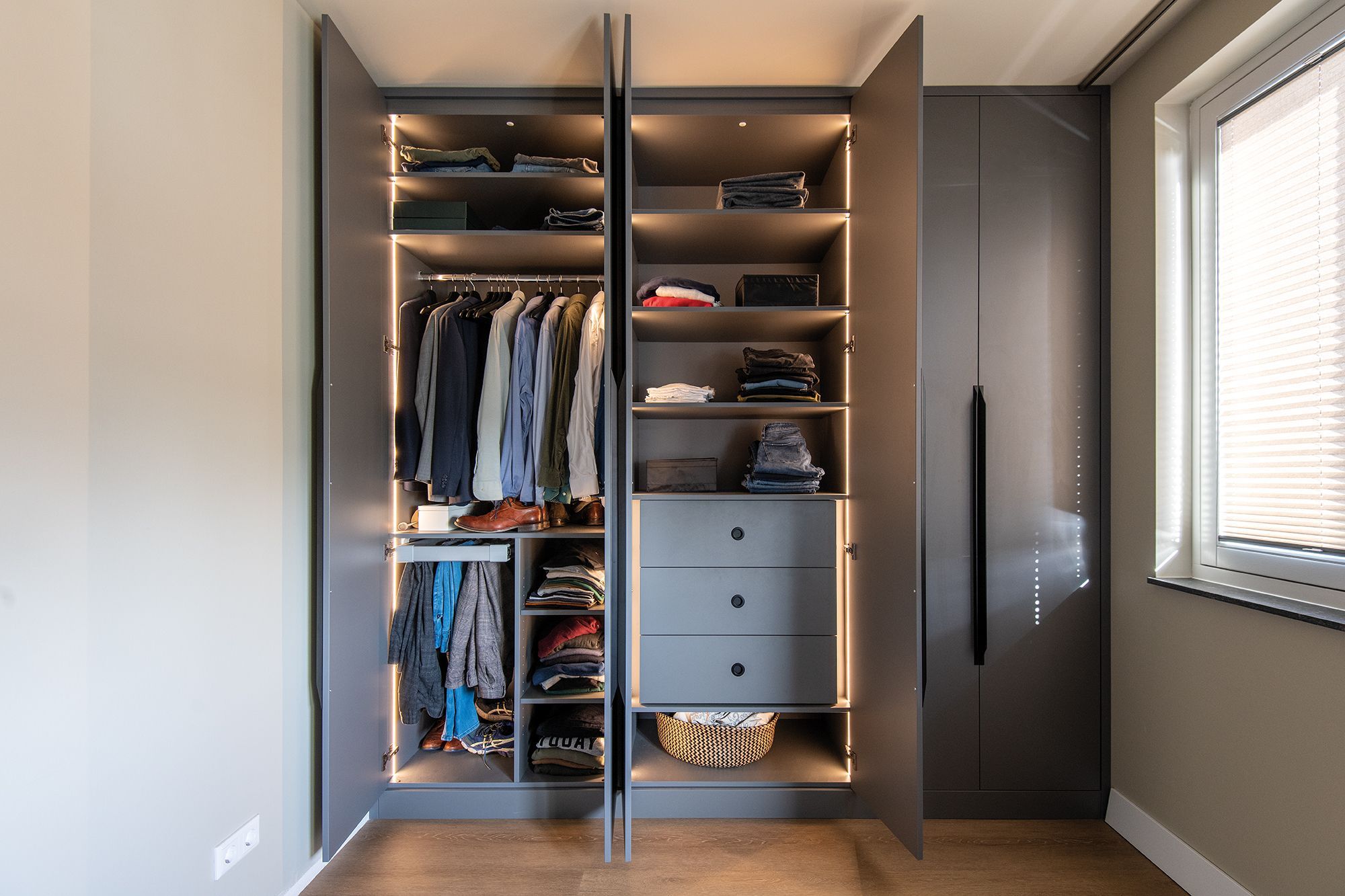 Al onze kledingkasten worden exact op maat gebouwd. Zoals u bij deze garderobekast op maat kunt zien wordt de kast precies tussen beide wanden en tussen vloer en plafond gemonteerd. Wij zijn er van overtuigd dat dit het mooiste eind resultaat geeft. De kast is onder meer voorzien van Blum binnen laden met softclosing, garderobestangen en een uittrekbare broekhouder.