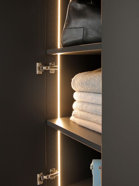 Deze kasten zijn voorzien van ingefreesde ledverlichting. In de zijstaanders van de kasten hebben wij ledstrips verwerkt. Bij het openen van de deuren gaat de verlichting branden door middel van een bewegingssensor.