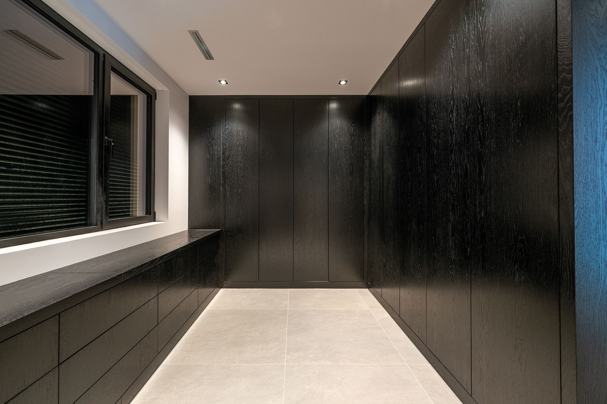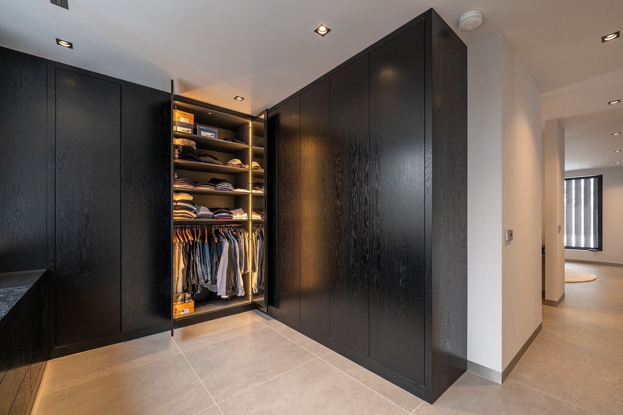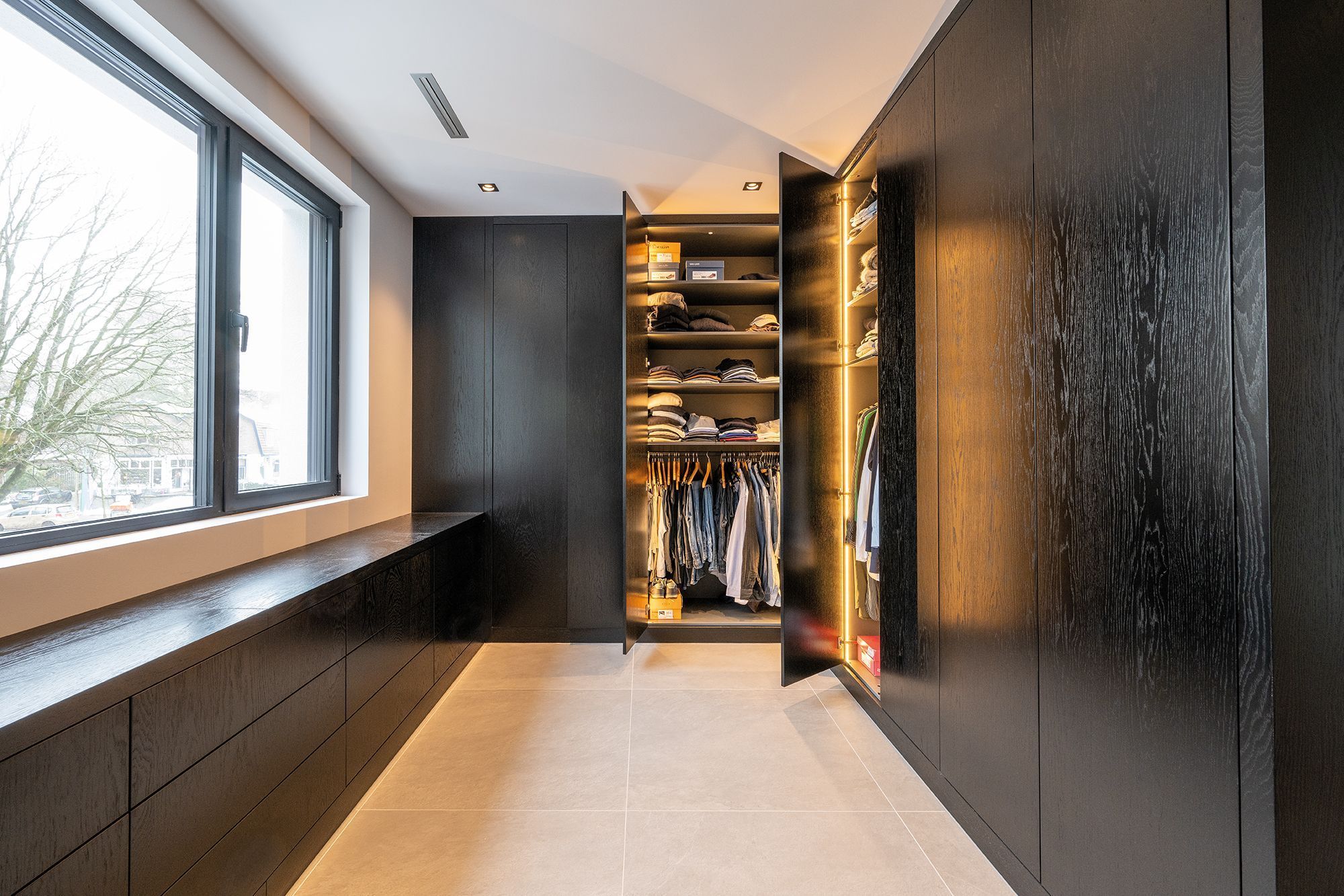Deze prachtige walk in closet is gemaakt van donker gekleurd eiken fineer. Het lage gedeelte is voorzien van veel praktische laden. Verder zijn alle kasten voorzien van ingefreesde ledverlichting. Wanneer de deuren geopend worden gaat de verlichting aan door middel van een bewegingssensor. Om de kasten helemaal af te maken zijn sommige deuren voorzien van spiegels. Kortom deze walk in closet is van alle gemakken voorzien.
