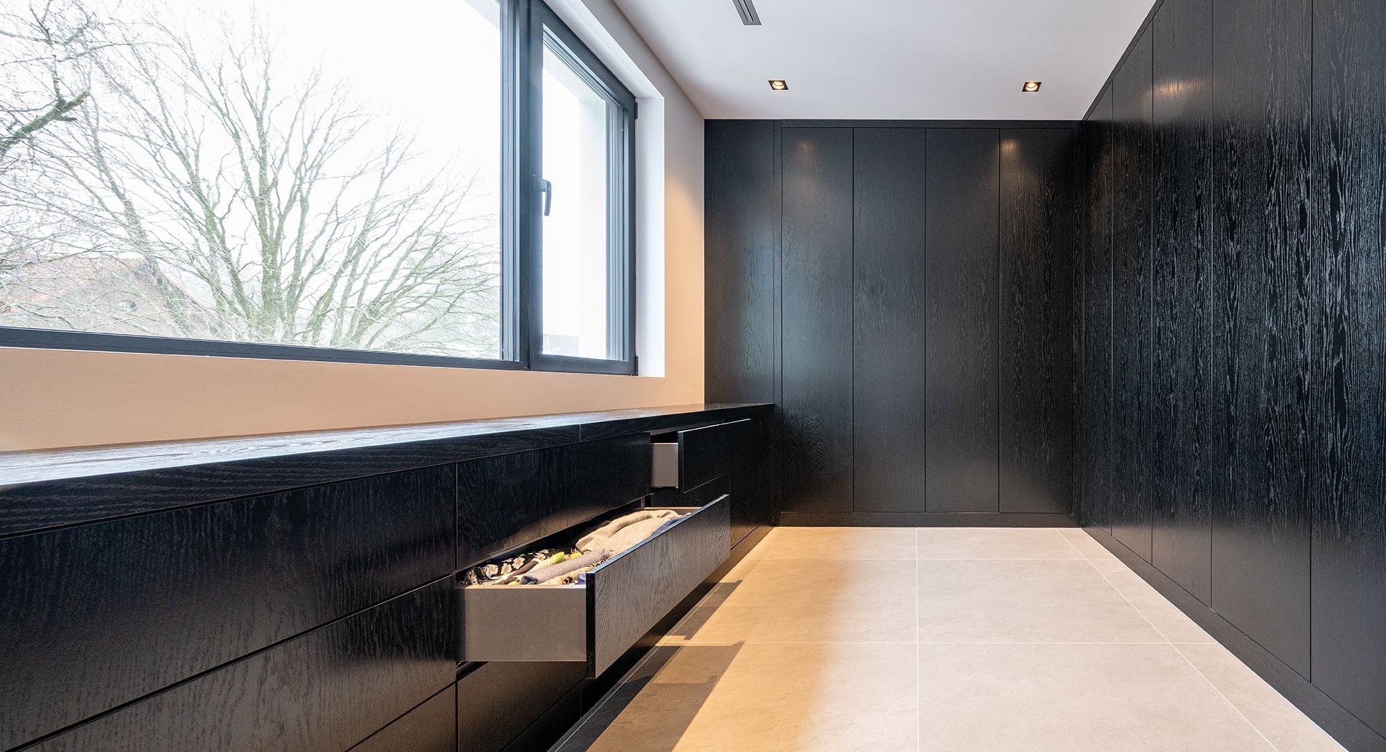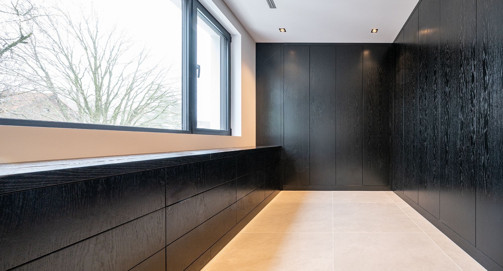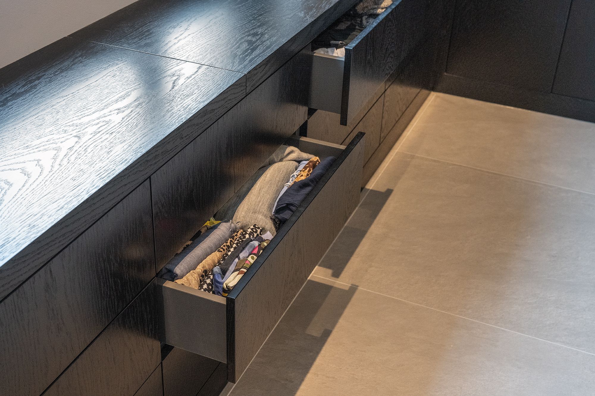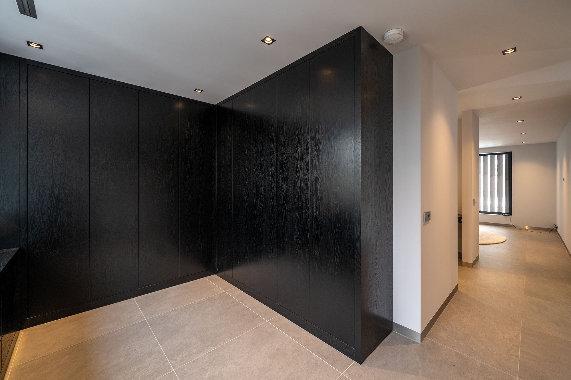 Deze prachtige walk in closet is gemaakt van donker gekleurd eiken fineer. Het lage gedeelte is voorzien van veel praktische laden. Verder zijn alle kasten voorzien van ingefreesde ledverlichting. Wanneer de deuren geopend worden gaat de verlichting aan door middel van een bewegingssensor. Om de kasten helemaal af te maken zijn sommige deuren voorzien van spiegels. Kortom deze walk in closet is van alle gemakken voorzien.